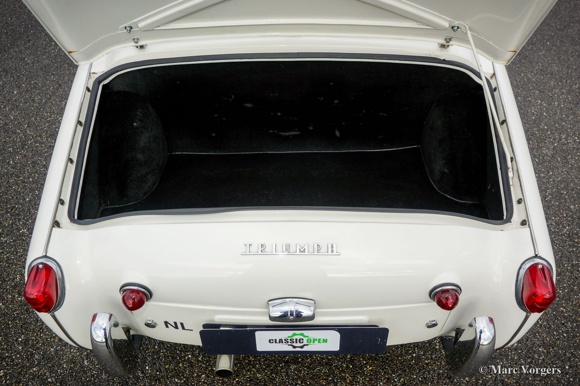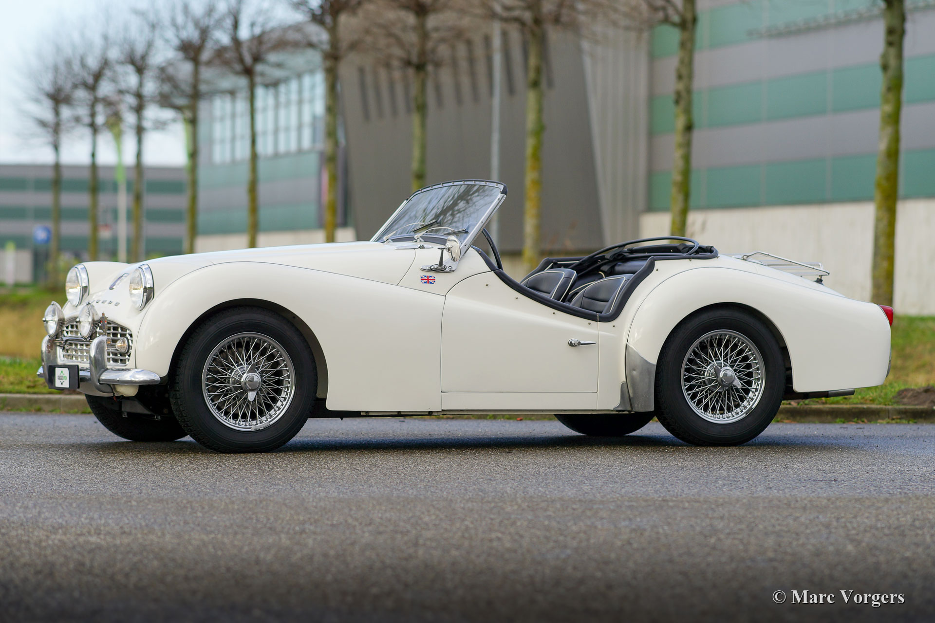 Triumph TR 3A, jaar 1959. Kleur gebroken wit (Pearl White) gecombineerd met een zwartlederen interieur en zwart tapijt. Zwarte mohair kap en zijruitframes. Deze stoere en prachtige Triumph TR 3A is nieuw verkocht in de USA. Nadat de Triumph in Nederland was geïmporteerd, werd de auto uitvoerig gerestaureerd naar fabriek originele specificaties. Documentatie en een fotoreportage van deze restauratie zijn aanwezig. Deze TR 3A verkeert in een zeer goede tot excellente conditie met lichte gebruikssporen. De carrosserie vertoont een uitstekende passing van de carrosseriedelen en alle originele details zijn aanwezig. De auto is voorzien van extra opties zoals een ‘badge-bar’, een paar Lucas SLR/SFT576 lampen (klassieke set van mistlamp en verstraler), Kenlow elektrische koelventilator, spaakwielen met Michelin XZX banden en een chromen bagagerek. Sinds de jaren 90 heeft deze fantastische Triumph TR 3A slechts twee zorgzame Nederlandse eigenaren gekend! De auto rijdt en stuurt perfect en de auto biedt een prachtige klassieke open rijervaring. Een zeer begeerlijke Triumph roadster!