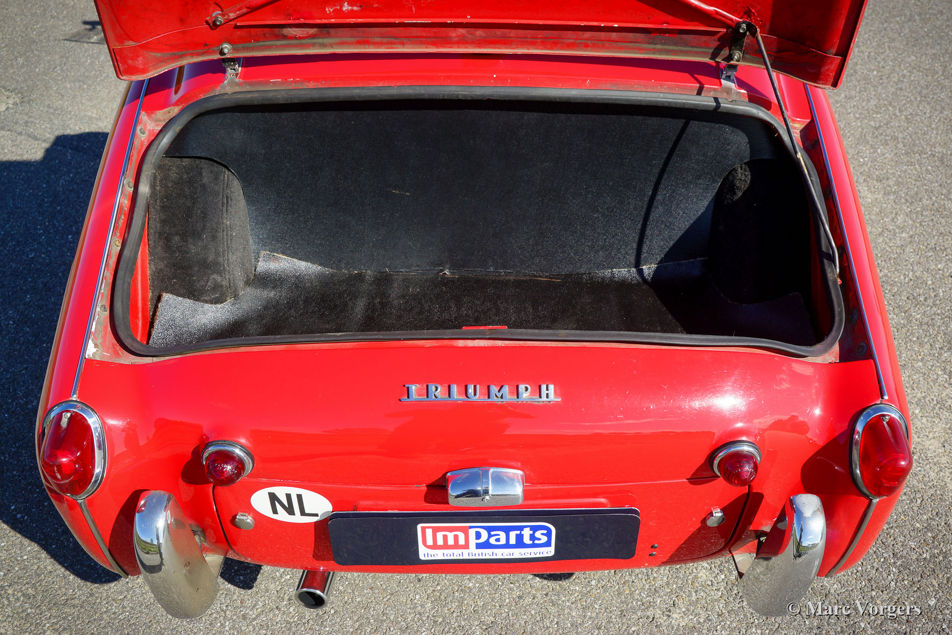 Triumph TR 3A, jaar 1960. Kleur rood gecombineerd met een zwart interieur en zwart tapijt. Zwarte soft-top en zijruitframes. Deze sportieve Triumph TR 3A werd 15 jaar geleden body-off gerestaureerd. Er is regelmatig met de auto gereden en de auto is goed onderhouden. Deze TR 3A verkeert in goede tot zeer goede staat, met normale sporen van gebruik, en de auto rijdt uitstekend. Deze TR is uitgerust met een krachtige 2,2 liter motor met twee dubbele Weber carburateurs. De motor werd aangepast om op loodvrije benzine te lopen en de gelijkstroomdynamo werd vervangen door een wisselstroomdynamo. Verder is deze sportieve TR 3A voorzien van lichtmetalen velgen in Minilite-stijl, overdrive, rembekrachtiging en een MotoLita-stuur. De auto wordt compleet geleverd met een zeldzame originele witte hard-top!