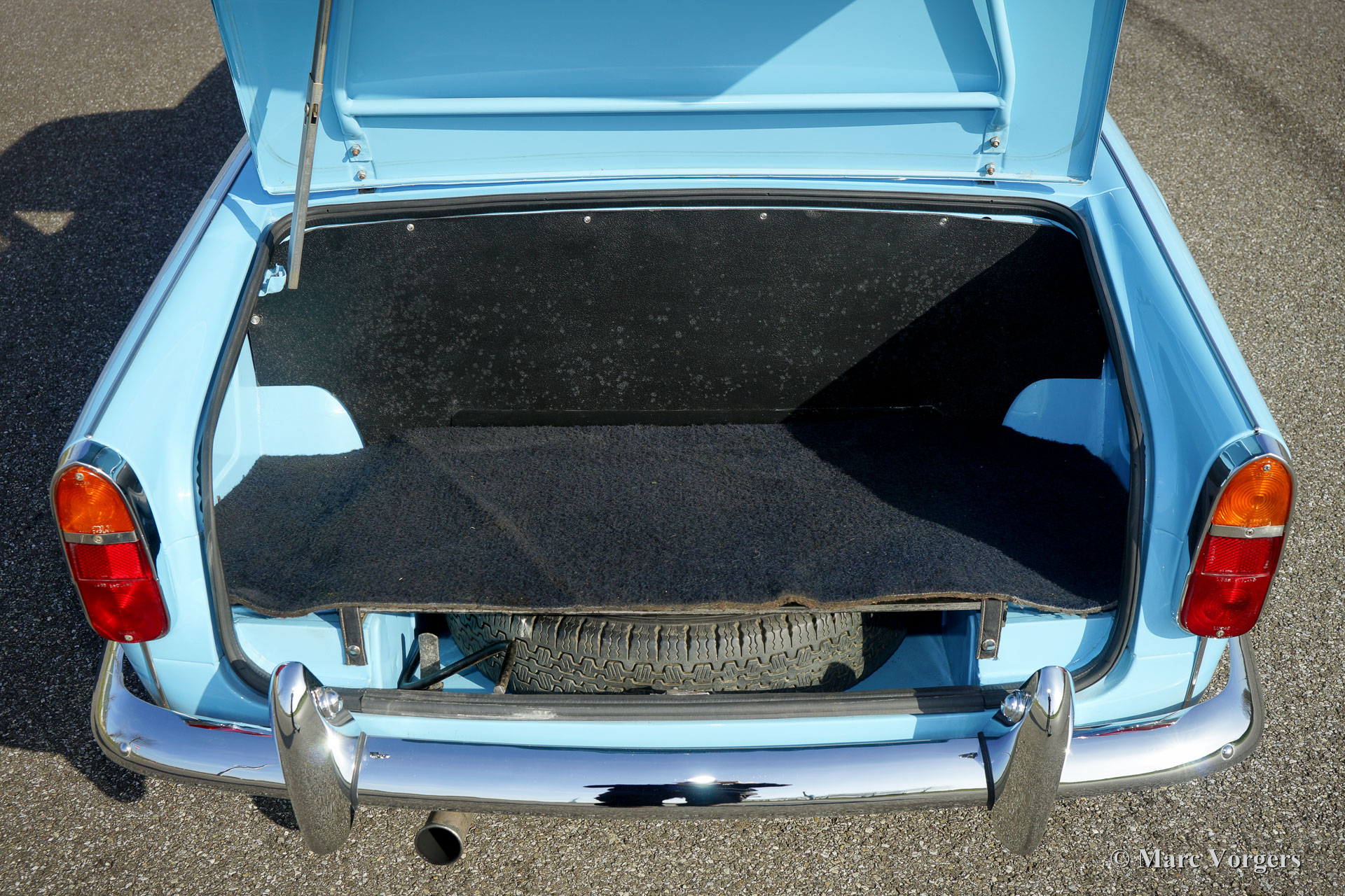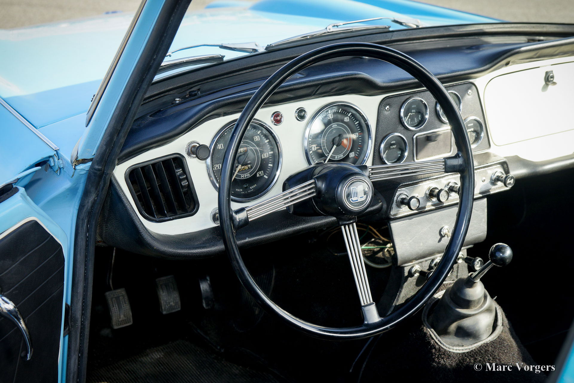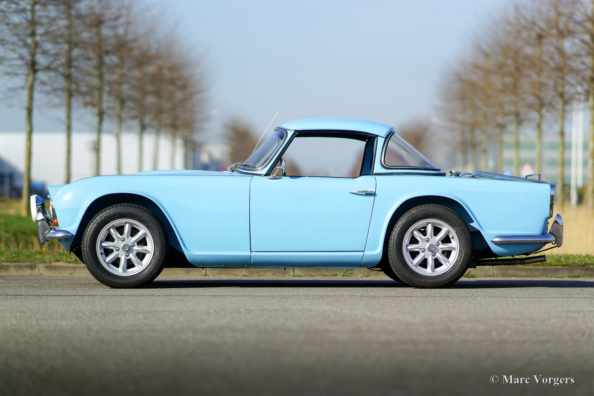 Triumph TR 4, jaar 1964. Kleur lichtblauw met een Surrey-top in carrosseriekleur. Zwart interieur afgewerkt met witte biezen en zwart tapijt. Deze prachtige Triumph TR 4 werd enige jaren geleden ‘body-off’ gerestaureerd. Deze TR 4 toont zeer sportief als een Triumph ‘works’ rally auto uit de jaren 1960. De auto verkeert in excellente staat en de auto rijdt uitstekend. Deze TR 4 is uitgerust met Surrey-top (compleet met het uitwisselbare ‘harde’ dakdeel en het opvouwbare dakdeel dat in de kofferbak past), Minilite type lichtmetalen wielen en grote Hella 192 rallylampen op de voorbumper. Het interieur toont alle originele details zoals het fraaie vroege dashboard en het originele stuur. Een zeer fraaie en stoere Triumph TR 4!