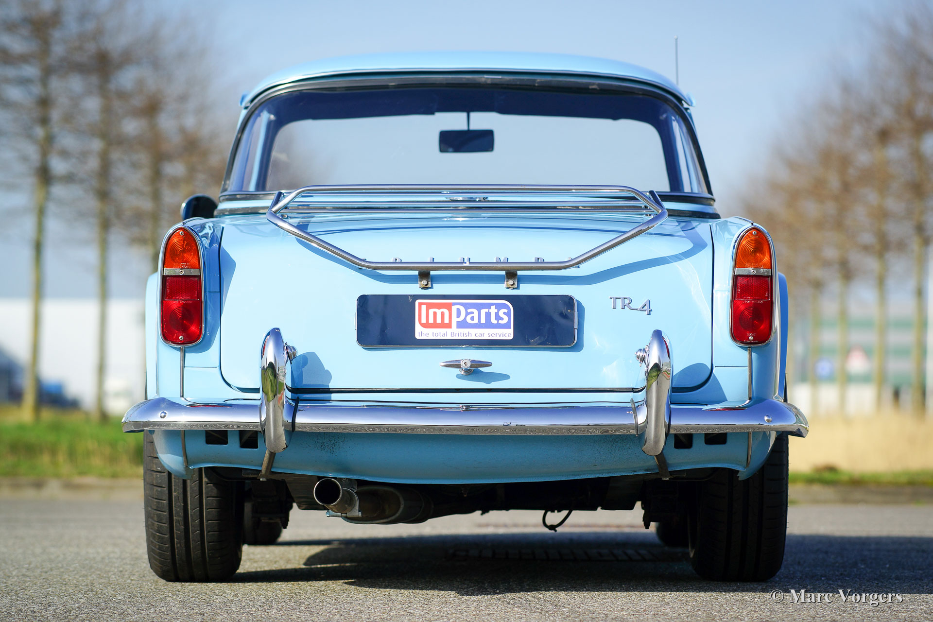 De Triumph TR 4 is de opvolger van de Triumph TR 3. Deze door Michelotti vormgegeven Triumph kwam in 1961 op de markt. De Triumph TR 4is een rasechte roadster zoals deze allen in Engeland gemaakt konden worden, recht door zee, puur en zeer sportief! De TR 4 beschikt over een stevig chassis, onafhankelijke voorwielophanging en een starre as achter. (De IRS versies beschikken over onafhankelijke wielophanging achter). Op de voorwielen zijn schijfremmen gemonteerd en op de achterwielen trommelremmen. Op de motorkap is een fraaie "powerbulge" te zien die plaats biedt aan de twee carburateurs. De TR 4 beschikt over een zeer fraai en overzichtelijk houten dashboard met grote, duidelijk afleesbare klokken dat klassieke sportiviteit ademt. Als accessoire is voor de TR 4 de zeer fraaie "Surrey-top" verkrijgbaar. Deze "Surrey-top" inspireerde Porsche tot het bouwen van haar "Targa" uitvoeringen.
