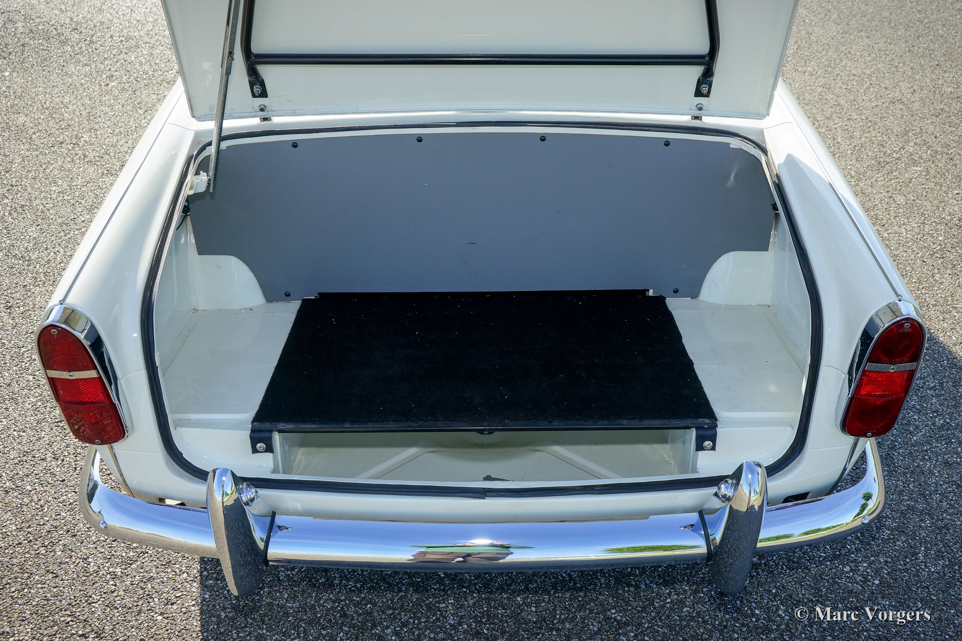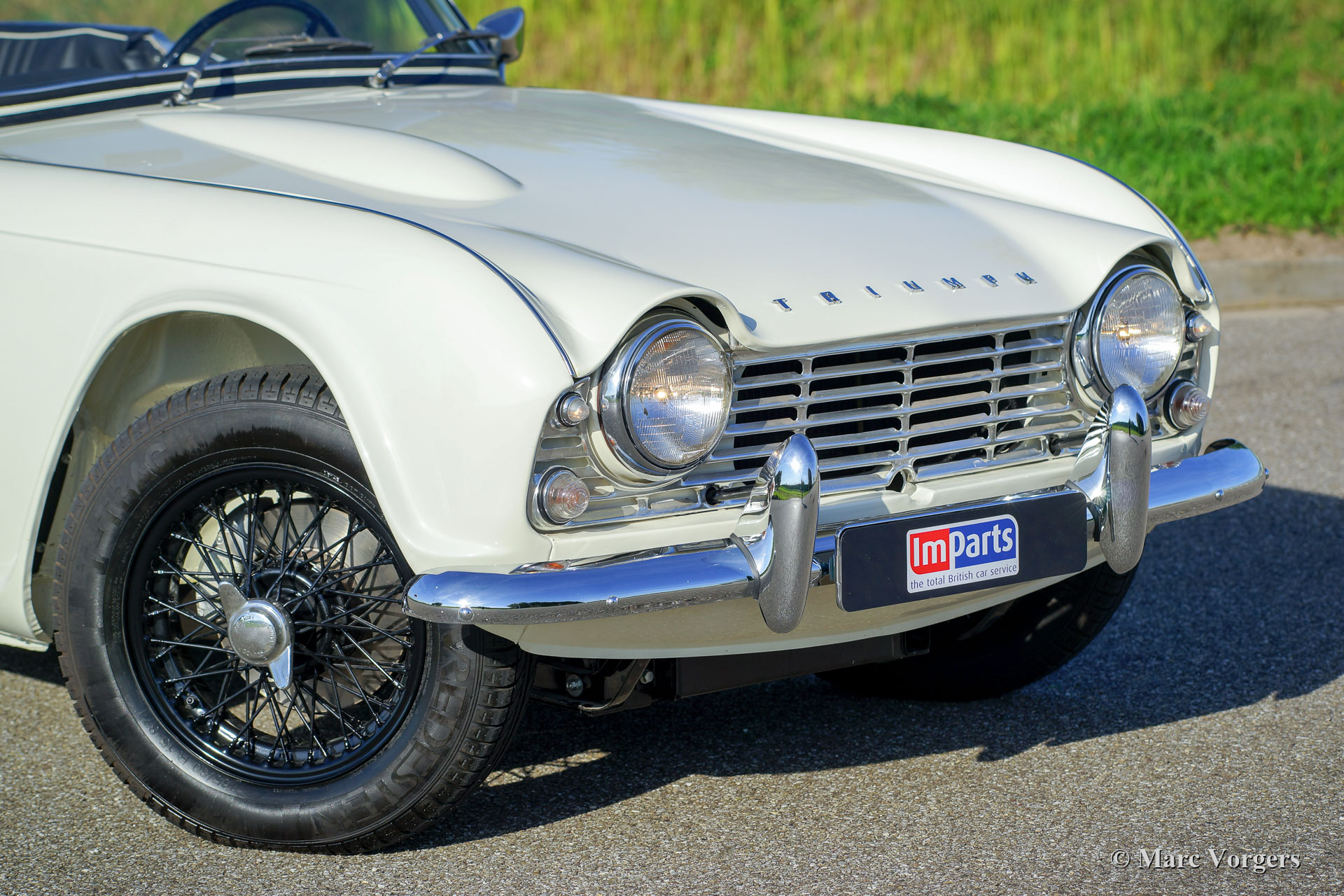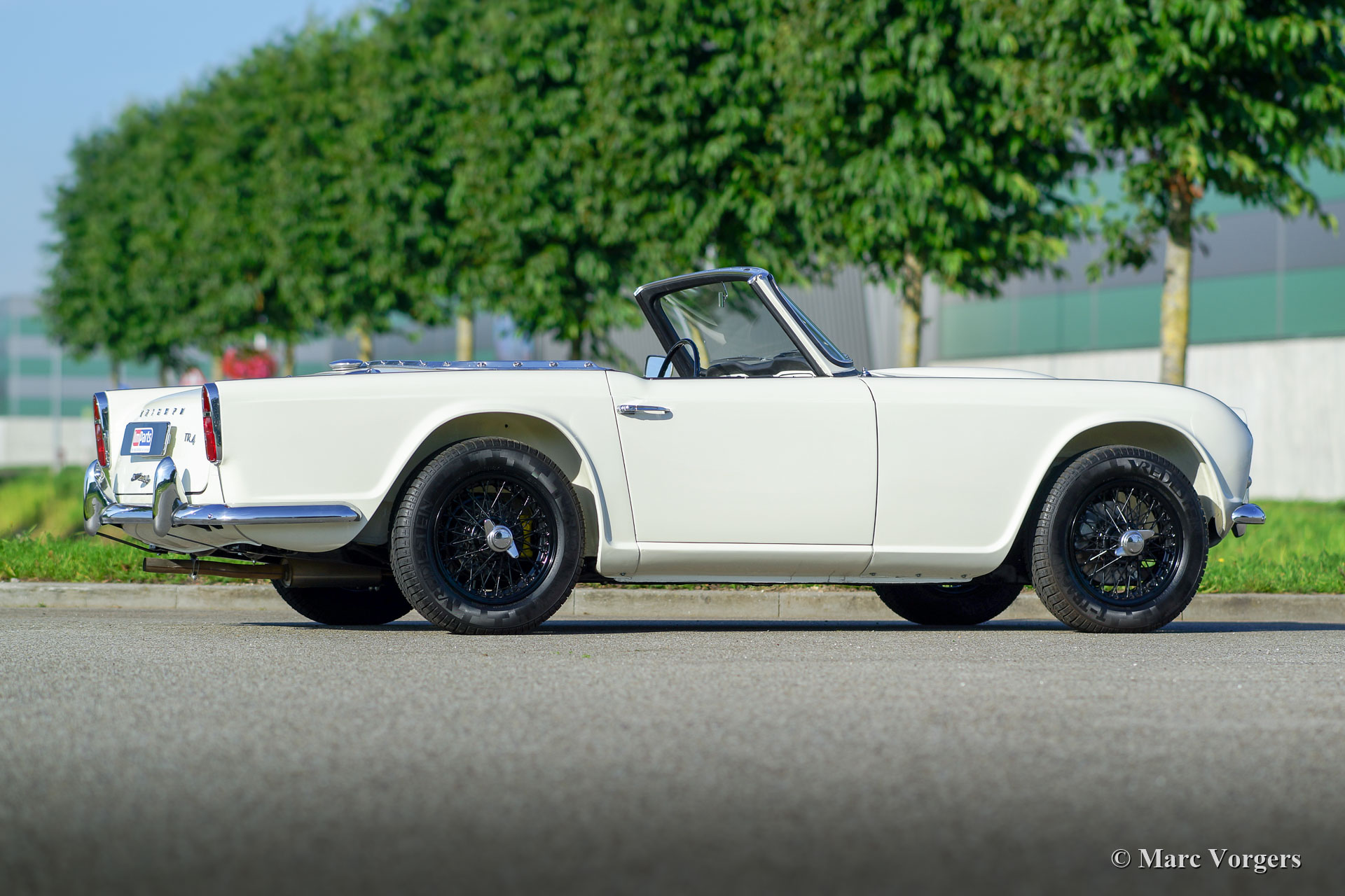Triumph TR 4, jaar 1964. Kleur wit gecombineerd met een zwart kunstleren interieur afgewerkt met witte biezen. Zwart tapijt. Zwarte vinyl soft-top. Deze prachtige Triumph TR 4 is in de afgelopen jaren uitvoerig 'body-off' gerestaureerd. De auto verkeert in sublieme topstaat! Deze TR 4 toont alle originele details zoals het vroege, zelden geziene, gelakte metalen dashboard, het originele stuur en de originele luchtfilters onder de motorkap. Verder is de TR 4 uitgerust met zwartgelakte spaakwielen met verchroomde 'knock-off' wielmoeren. Tijdens de restauratie en revisie is de motor gemodificeerd voor het gebruik van loodvrije benzine. Deze TR 4 is een plaatje; een zeer fraai exemplaar!