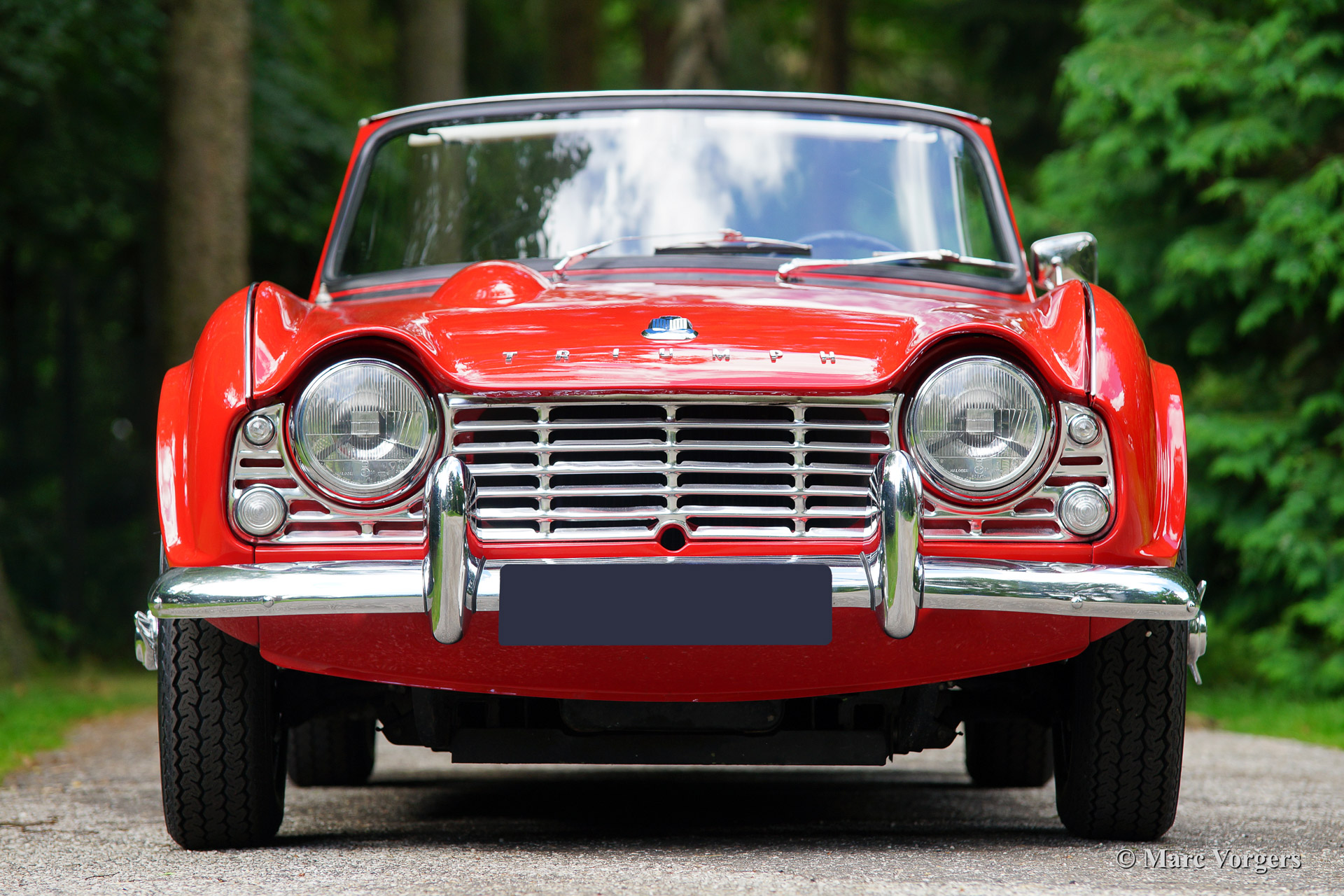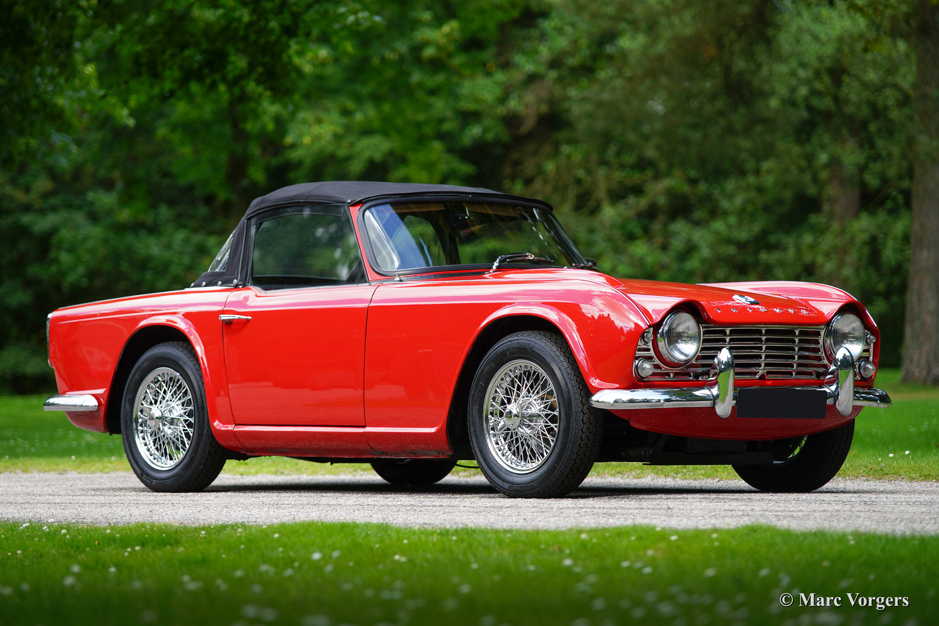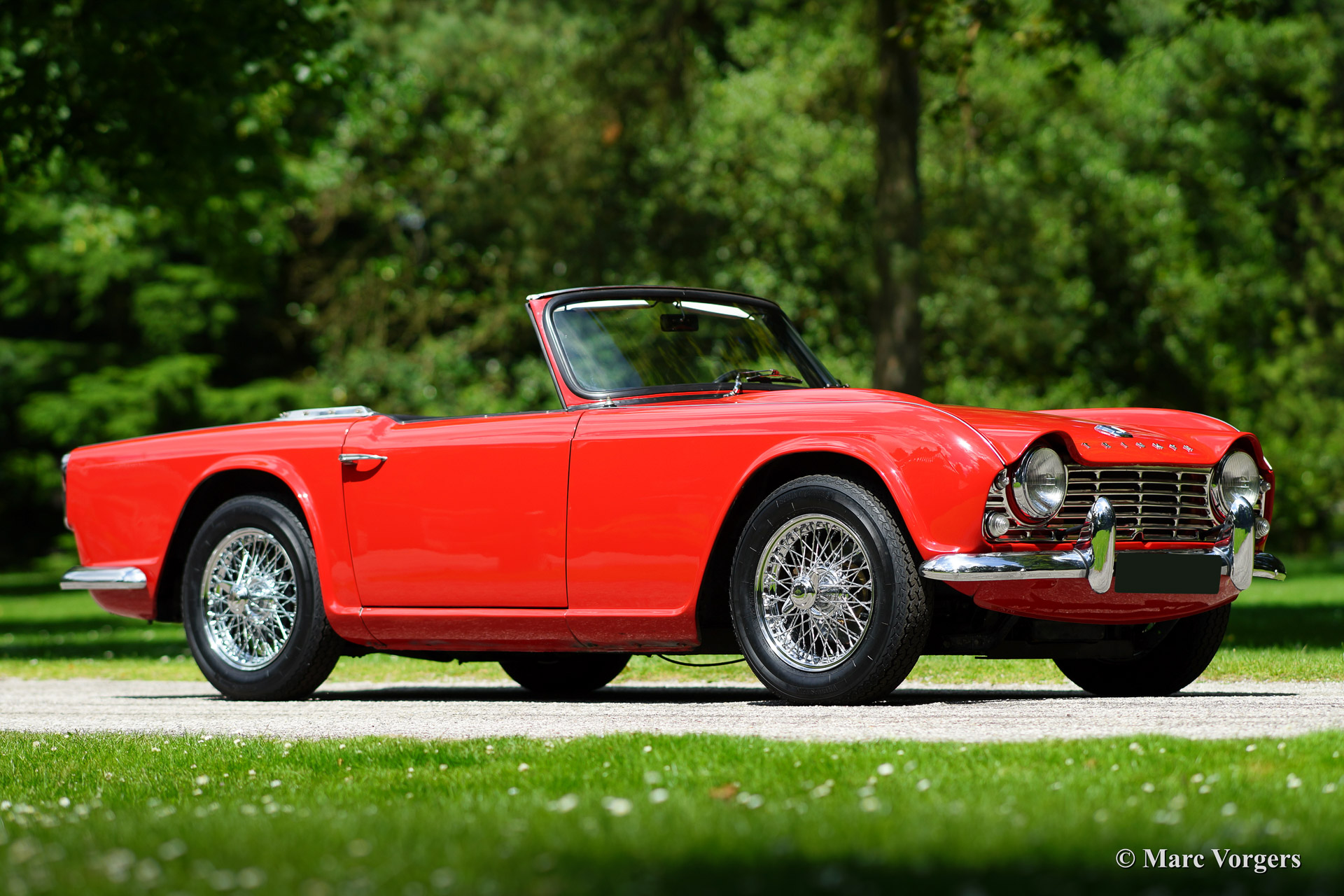 Triumph TR 4, bouwjaar 1965. Kleur rood met een zwart interieur afgebiest met rode 'piping'. Zwarte soft top en hood cover. Deze prachtige door de Italiaan Michelotti getekende Triumph TR 4 werd in 1992 vanuit de USA geïmporteerd. De auto werd eind jaren negentig uitvoerig 'body off' gerestaureerd. Er zijn veel goede foto's van de restauratie beschikbaar evenals rekeningen. Veel delen van het chassis zijn gepoedercoat. De gereviseerde motor werd aangepast om op loodvrije benzine te functioneren. Deze Triumph TR4 is voorzien van chroom spaakwielen, overdrive, een RVS uitlaat, nieuwe Vredestein Classic Sprint banden en een nieuwe mohair soft top. Verder is de auto voorzien van een fraaie 'period' Pianola radio.