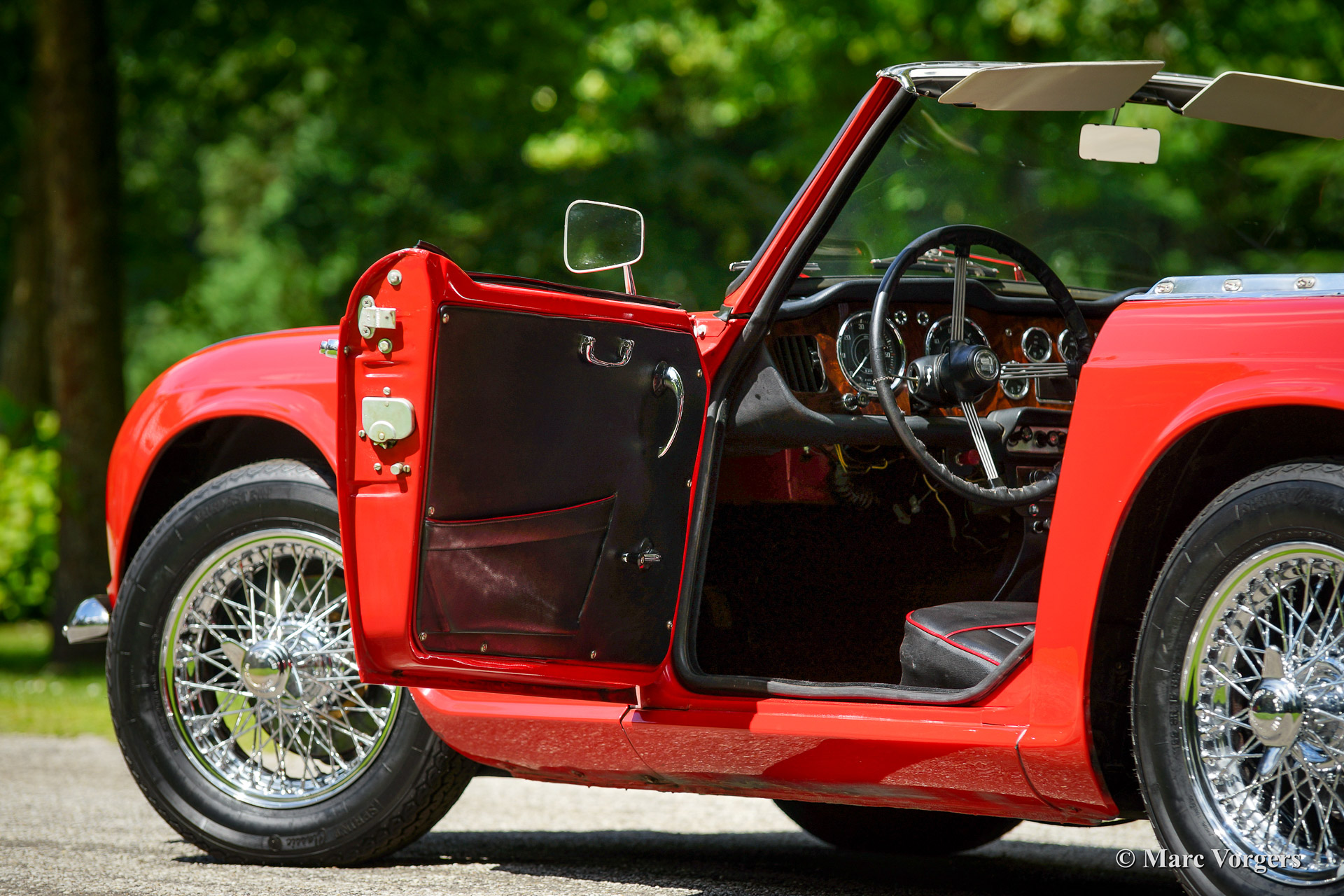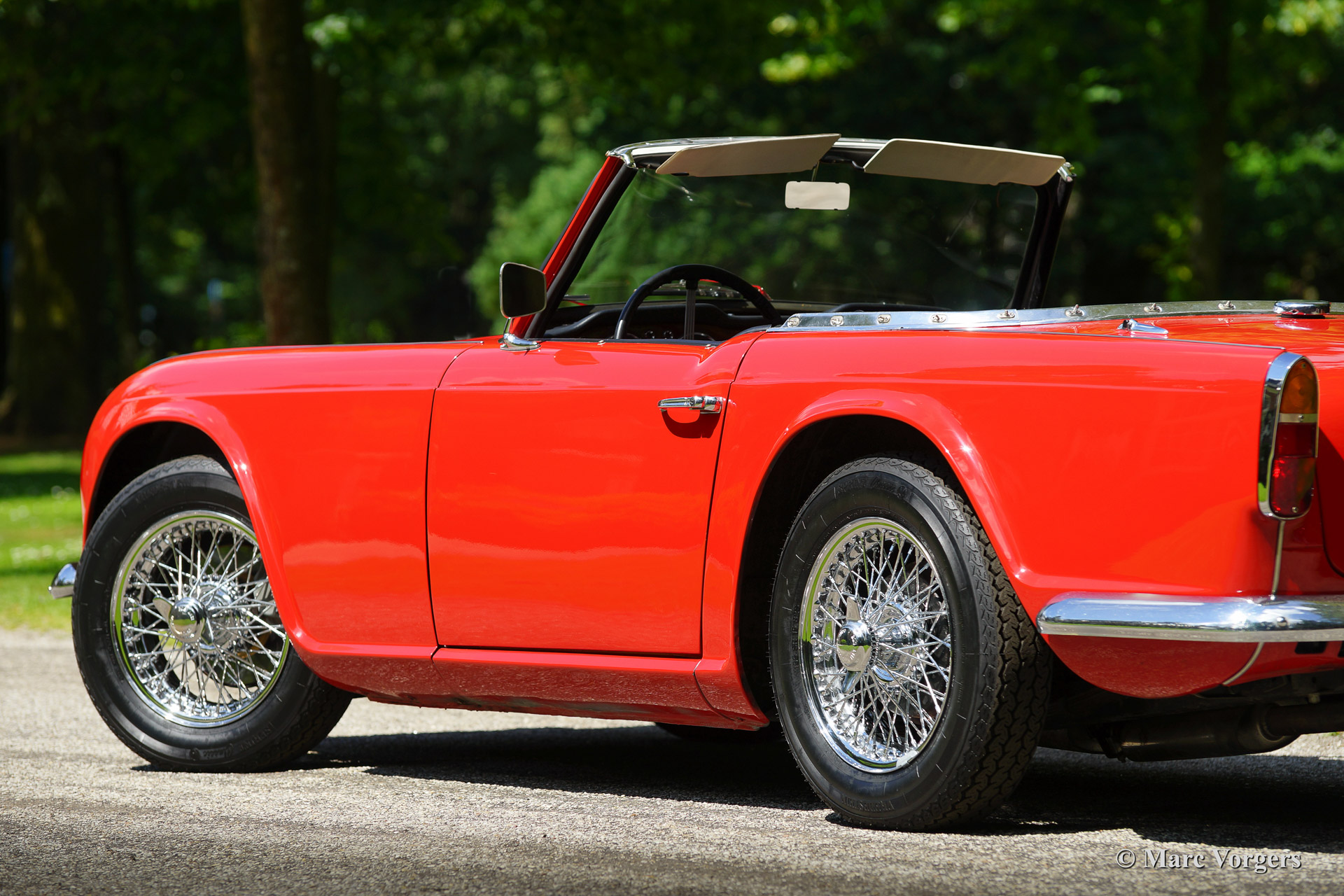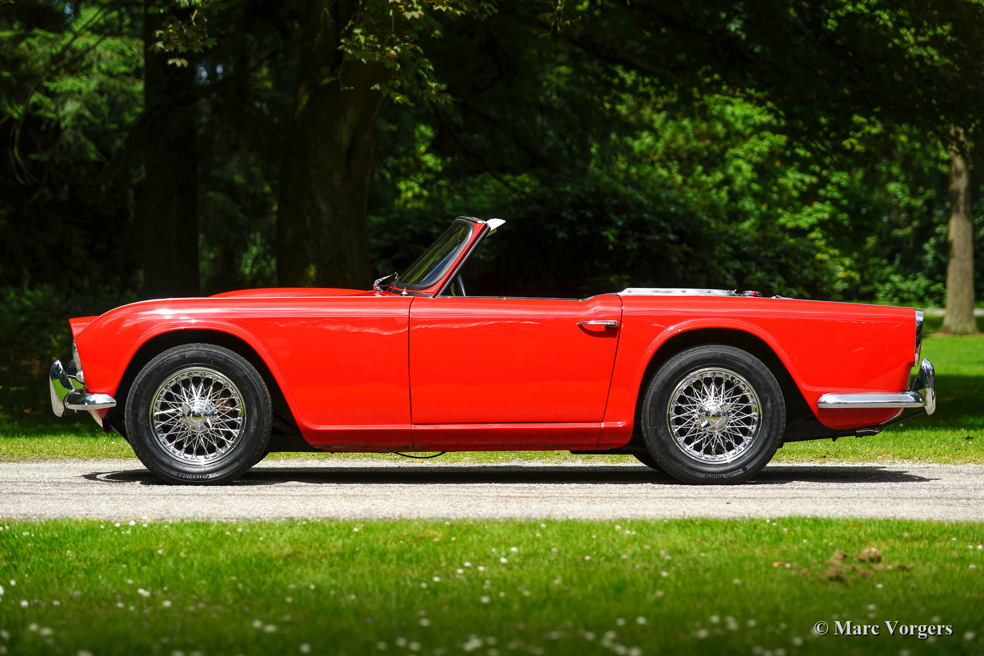 Triumph TR 4, bouwjaar 1965. Kleur rood met een zwart interieur afgebiest met rode 'piping'. Zwarte soft top en hood cover. Deze prachtige door de Italiaan Michelotti getekende Triumph TR 4 werd in 1992 vanuit de USA geïmporteerd. De auto werd eind jaren negentig uitvoerig 'body off' gerestaureerd. Er zijn veel goede foto's van de restauratie beschikbaar evenals rekeningen. Veel delen van het chassis zijn gepoedercoat. De gereviseerde motor werd aangepast om op loodvrije benzine te functioneren. Deze Triumph TR4 is voorzien van chroom spaakwielen, overdrive, een RVS uitlaat, nieuwe Vredestein Classic Sprint banden en een nieuwe mohair soft top. Verder is de auto voorzien van een fraaie 'period' Pianola radio.