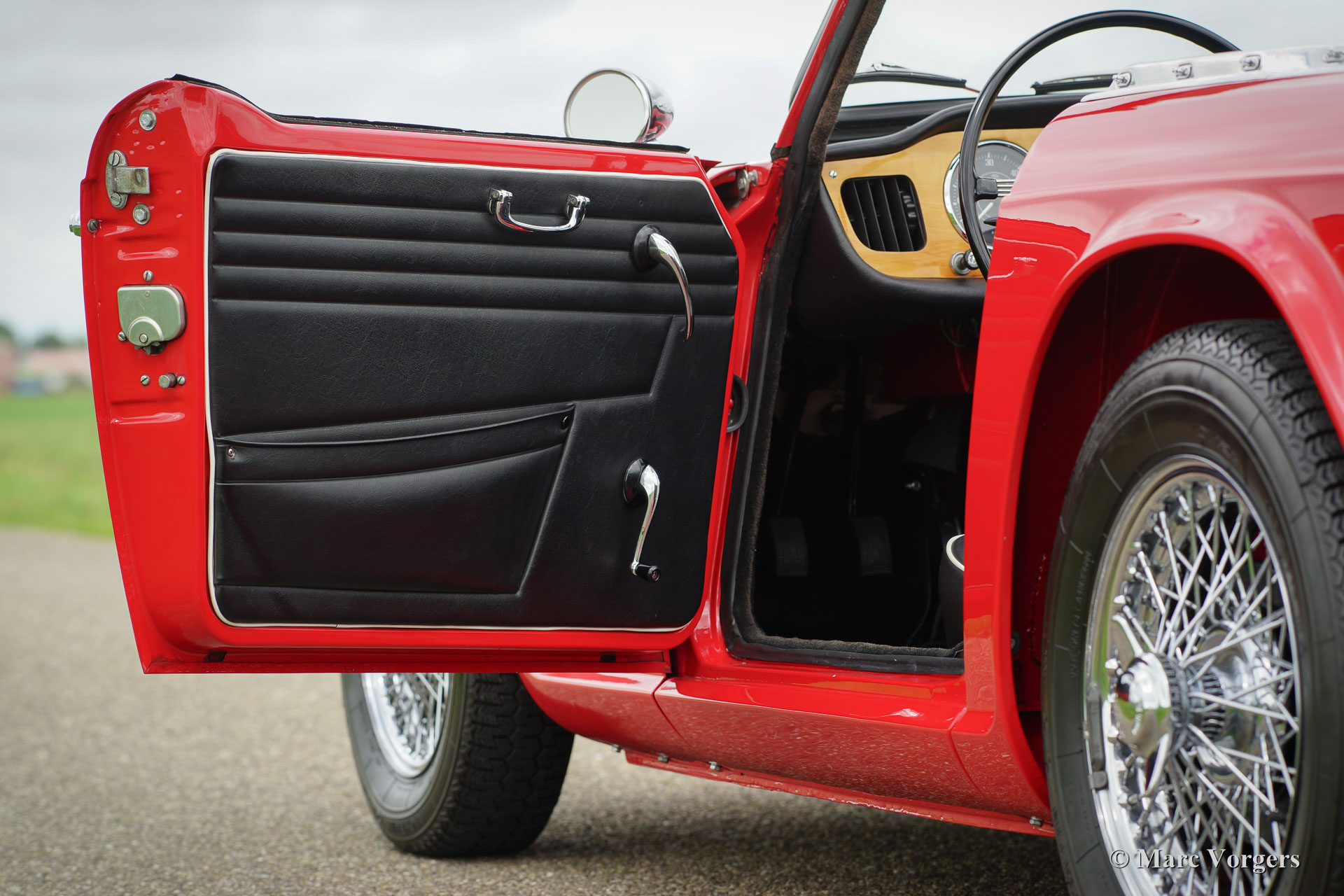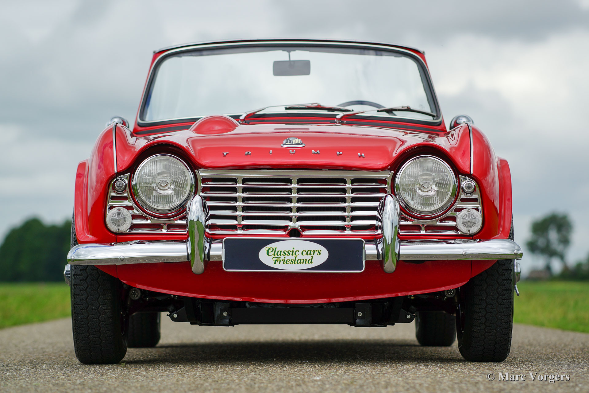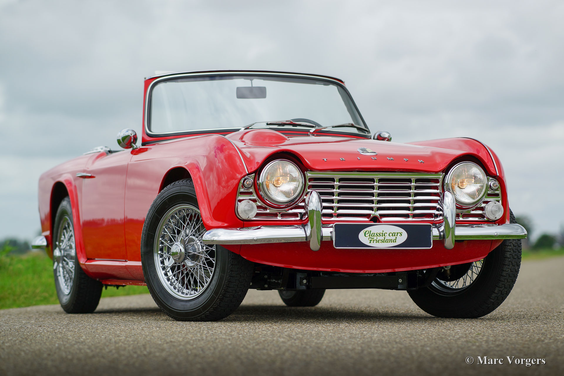 Triumph TR 4, jaar 1965. Kleur Rood met een zwartlederen interieur afgewerkt met witte biezen. De auto is voorzien van een zwarte soft top en tonneaucover. Deze magnifieke Triumph TR 4 werd in Nederland volledig en ‘body off’ gerestaureerd door een specialist. Een prachtig uitgevoerde restauratie waarvan een uitgebreide fotoreportage aanwezig is! Deze Triumph TR 4 heeft meerdere nationale en internationale prijzen gewonnen; de auto verkeert in smetteloze concoursstaat! De auto is uitgerust met overdrive, chroom spaakwielen, Michelin banden, een prachtig origineel houten dashboard en het originele stuurwiel. Een tweede exemplaar in deze SUPER-STAAT zult u niet snel vinden!