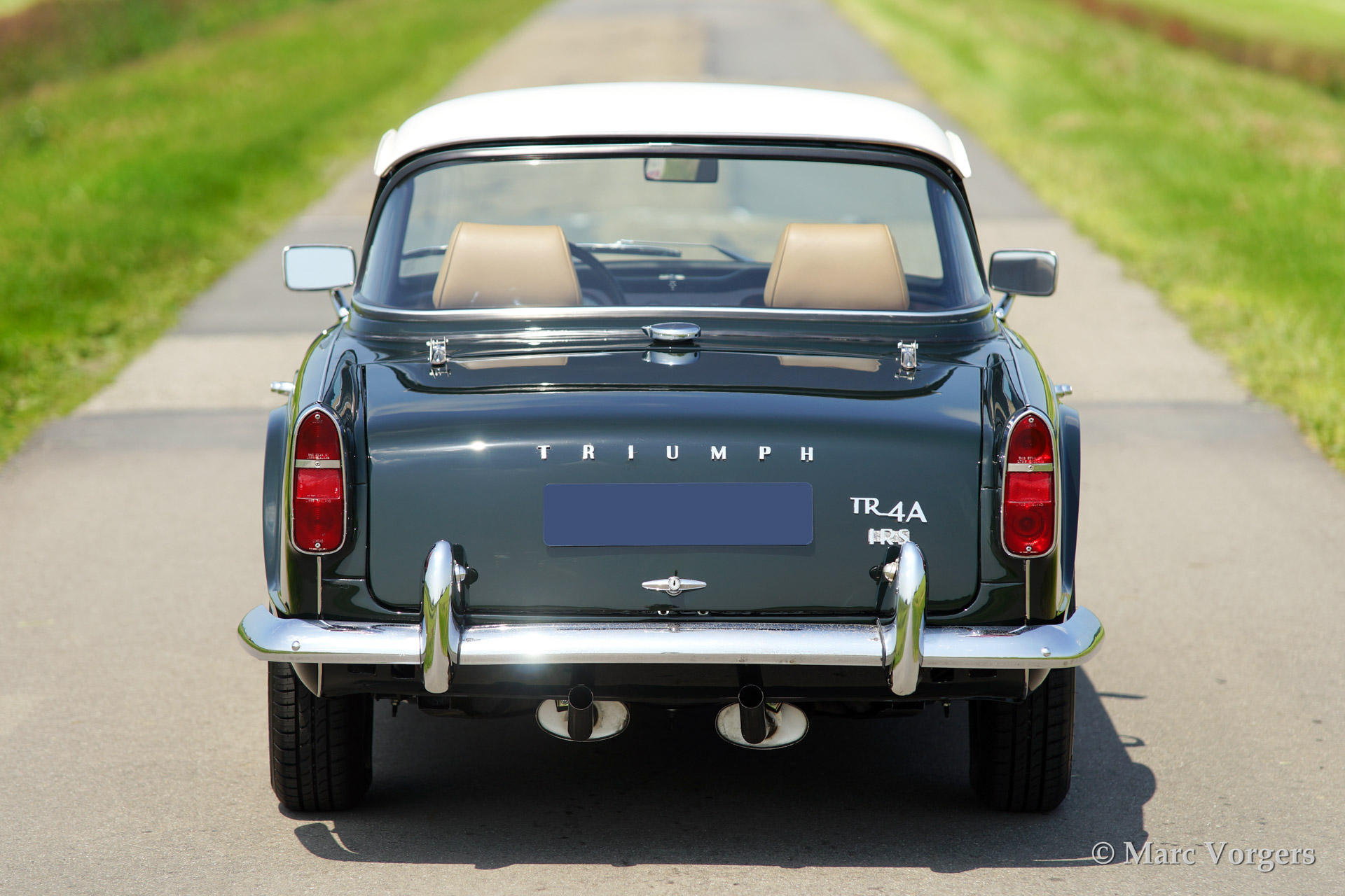 De Triumph TR 4 is de opvolger van de Triumph TR 3. Deze door Michelotti vormgegeven Triumph kwam in 1961 op de markt. De Triumph TR 4is een rasechte roadster zoals deze allen in Engeland gemaakt konden worden, recht door zee, puur en zeer sportief! De TR 4 beschikt over een stevig chassis, onafhankelijke voorwielophanging en een starre as achter. ( De IRS versies beschikken over onafhankelijke wielophanging achter). Op de voorwielen zijn schijfremmen gemonteerd en op de achterwielen trommelremmen. Op de motorkap is een fraaie "powerbulge" te zien die plaats biedt aan de twee carburateurs. De TR 4 beschikt over een zeer fraai en overzichtelijk houten dashboard met grote, duidelijk afleesbare klokken dat klassieke sportiviteit ademt. Als accessoire is voor de TR 4 de zeer fraaie "Surrey-top" verkrijgbaar. Deze "Surrey-top" inspireerde Porsche tot het bouwen van haar "Targa" uitvoeringen.