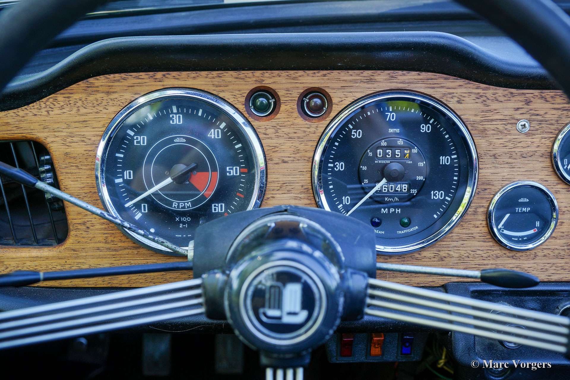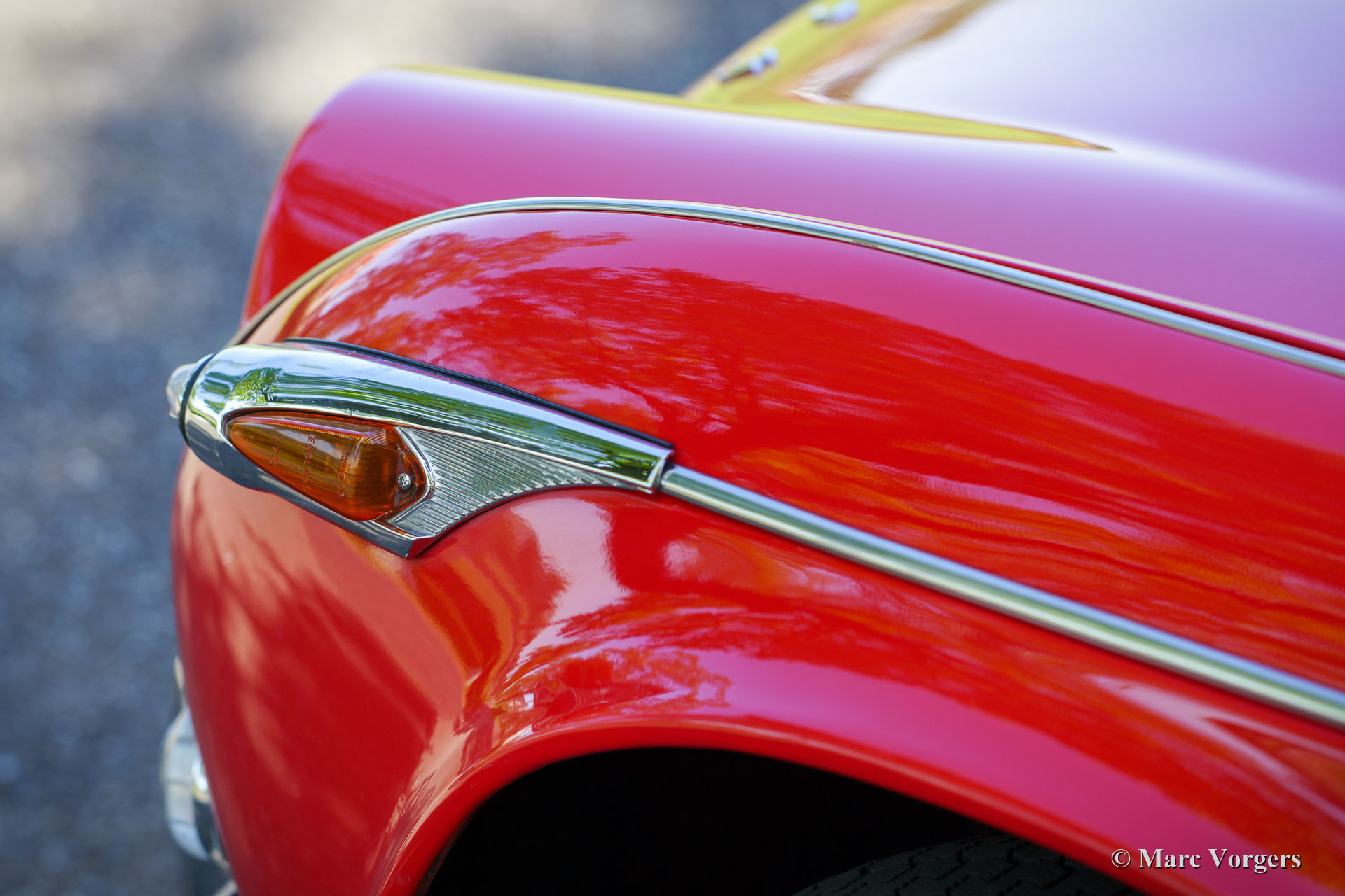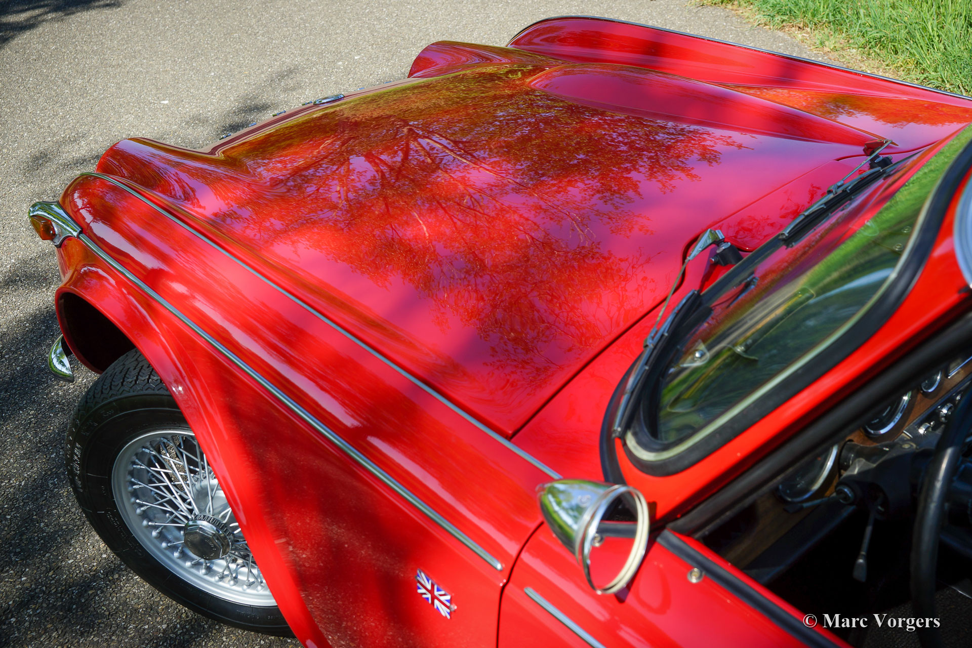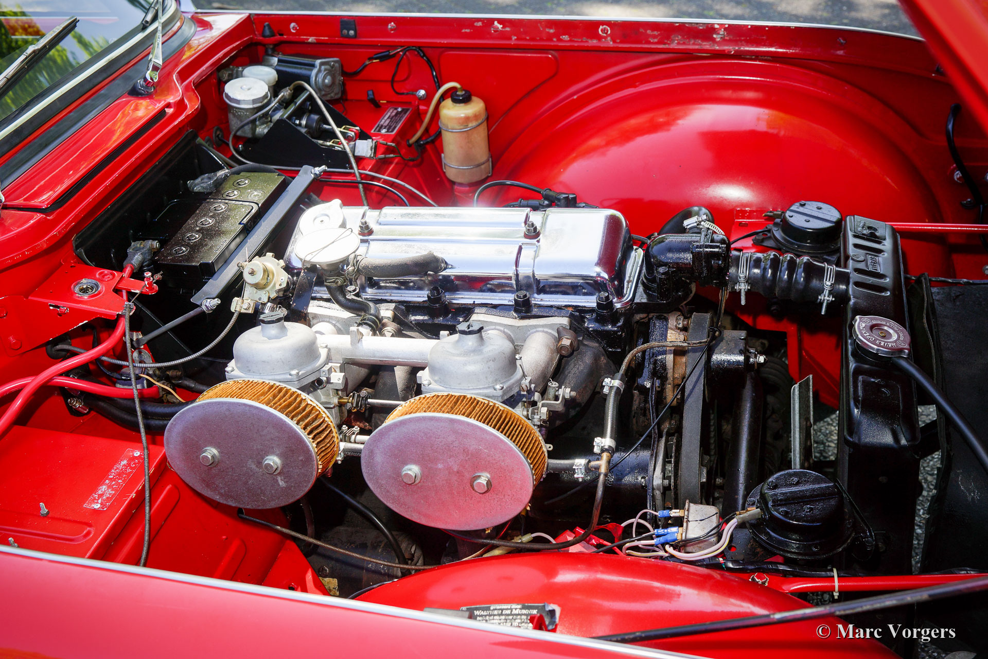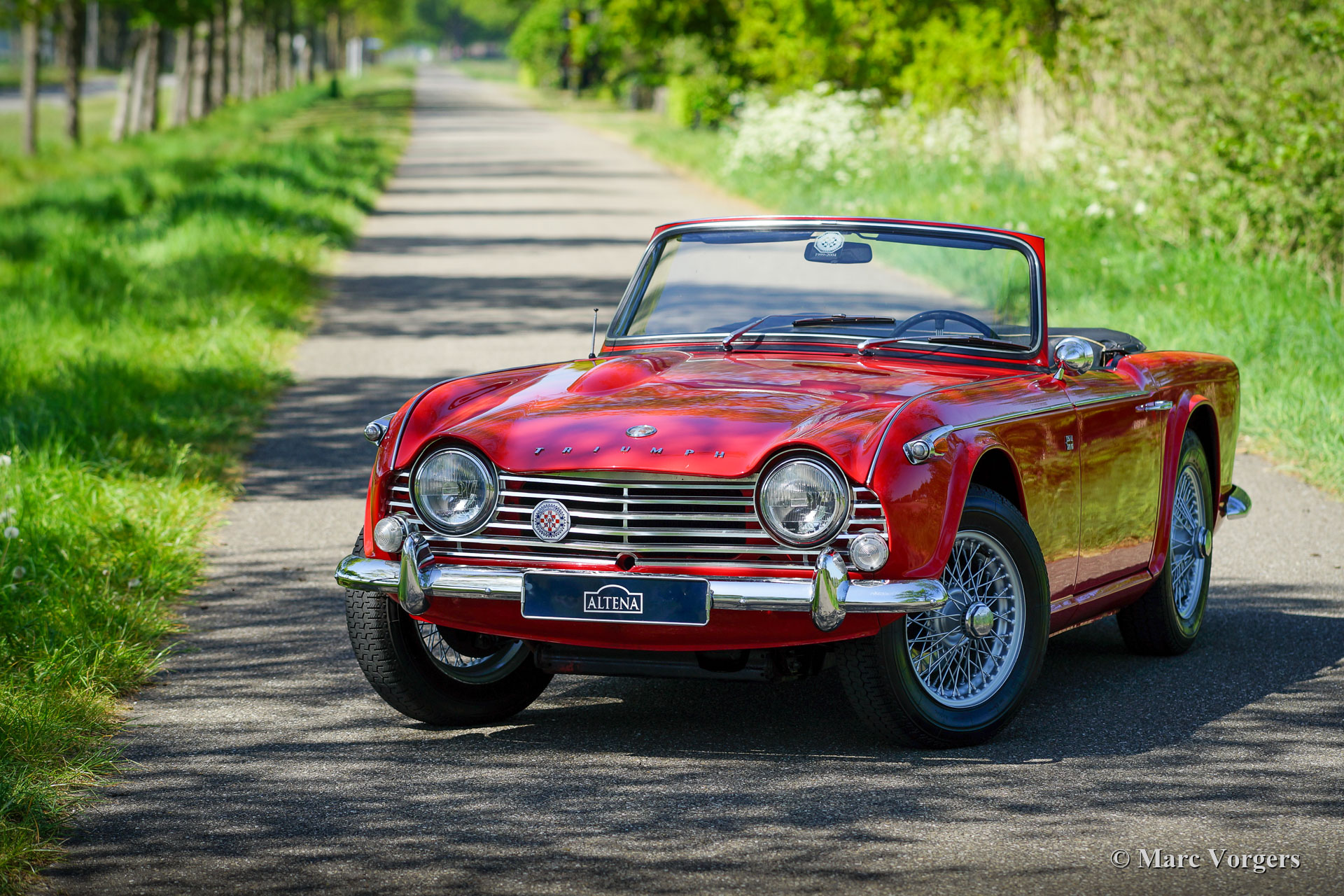 Triumph TR 4A IRS, jaar 1966. Exterieurkleur rood gecombineerd met een zwart kunstlederen interieur en zwart tapijt. Zwarte vinyl ‘soft-top’ en ‘hood-cover’. Deze prachtige Triumph TR 4A IRS is nieuw verkocht in de USA, de auto is in het jaar 2000 naar Nederland geïmporteerd. Na aankomst in NL is de auto gedeeltelijk gerestaureerd. De werkzaamheden zijn prachtig uitgevoerd, de TR toont nog altijd als een plaatje en de auto verkeert in een zeer goede conditie! Deze TR 4A IRS heeft maar één Nederlandse eigenaar gekend die 22 jaar met veel plezier van de auto heeft genoten! De is goed onderhouden en toont lichte sporen van gebruik. Een reparatie en een scheur in de naad van de passagiersstoel zijn noemenswaardige imperfecties. De carrosserie ziet toont zeer strak en onder de motorkap is alles fraai gedetailleerd! Deze Triumph TR 4A is het laatste en meest geavanceerde model van de TR 4 modelserie. De auto is uitgerust met onafhankelijke achterwielophanging (Independent Rear Suspension), vandaar de afkorting IRS in de naam. De auto rijdt sportief en toch comfortabel en is voorzien van een eenvoudig op te zetten en neer te klappen ‘soft-top’. De open rijervaring is geweldig, net als het geluid van de krachtige (meer dan 100 pk) viercilindermotor. De auto is voorzien van overdrive, spaakwielen en het prachtige originele stuur. Een zeer begeerlijke Britse sportwagen!