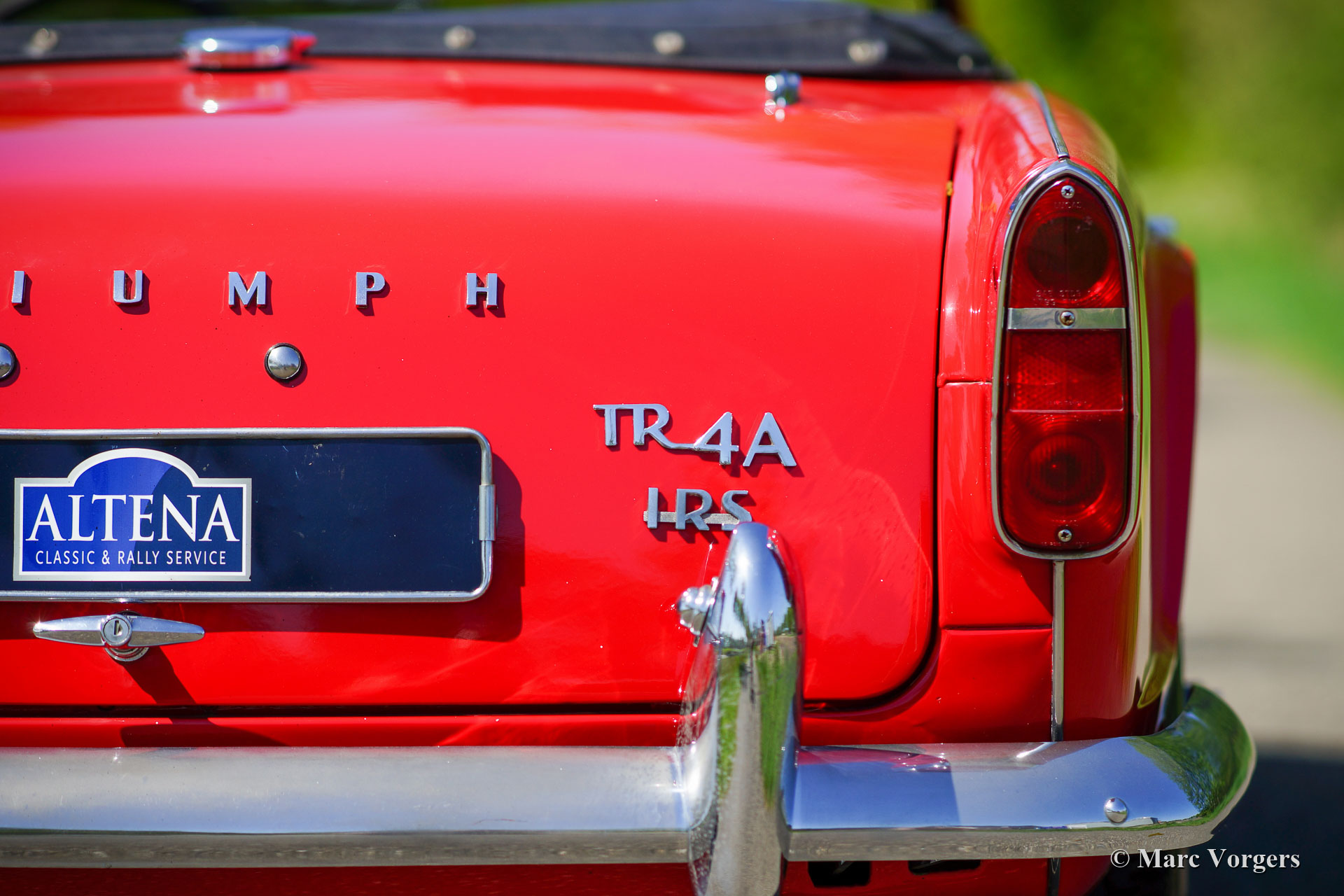 De Triumph TR 4 is de opvolger van de Triumph TR 3. Deze door Michelotti vormgegeven Triumph kwam in 1961 op de markt. De Triumph TR 4is een rasechte roadster zoals deze allen in Engeland gemaakt konden worden, recht door zee, puur en zeer sportief! De TR 4 beschikt over een stevig chassis, onafhankelijke voorwielophanging en een starre as achter. ( De IRS versies beschikken over onafhankelijke wielophanging achter). Op de voorwielen zijn schijfremmen gemonteerd en op de achterwielen trommelremmen. Op de motorkap is een fraaie "powerbulge" te zien die plaats biedt aan de twee carburateurs. De TR 4 beschikt over een zeer fraai en overzichtelijk houten dashboard met grote, duidelijk afleesbare klokken dat klassieke sportiviteit ademt. Als accessoire is voor de TR 4 de zeer fraaie "Surrey-top" verkrijgbaar. Deze "Surrey-top" inspireerde Porsche tot het bouwen van haar "Targa" uitvoeringen.