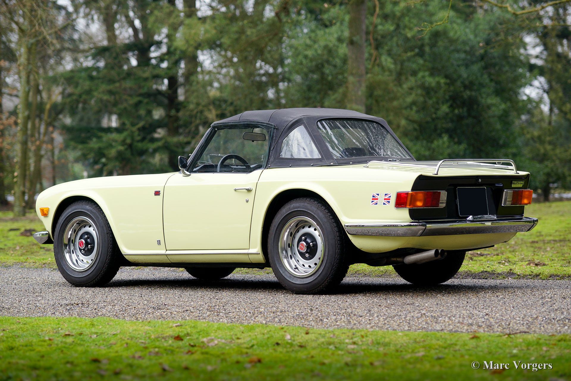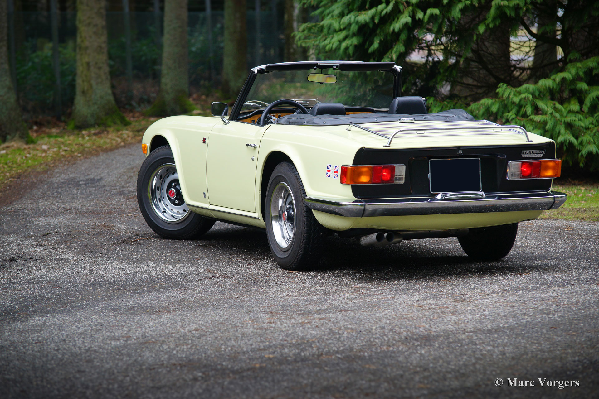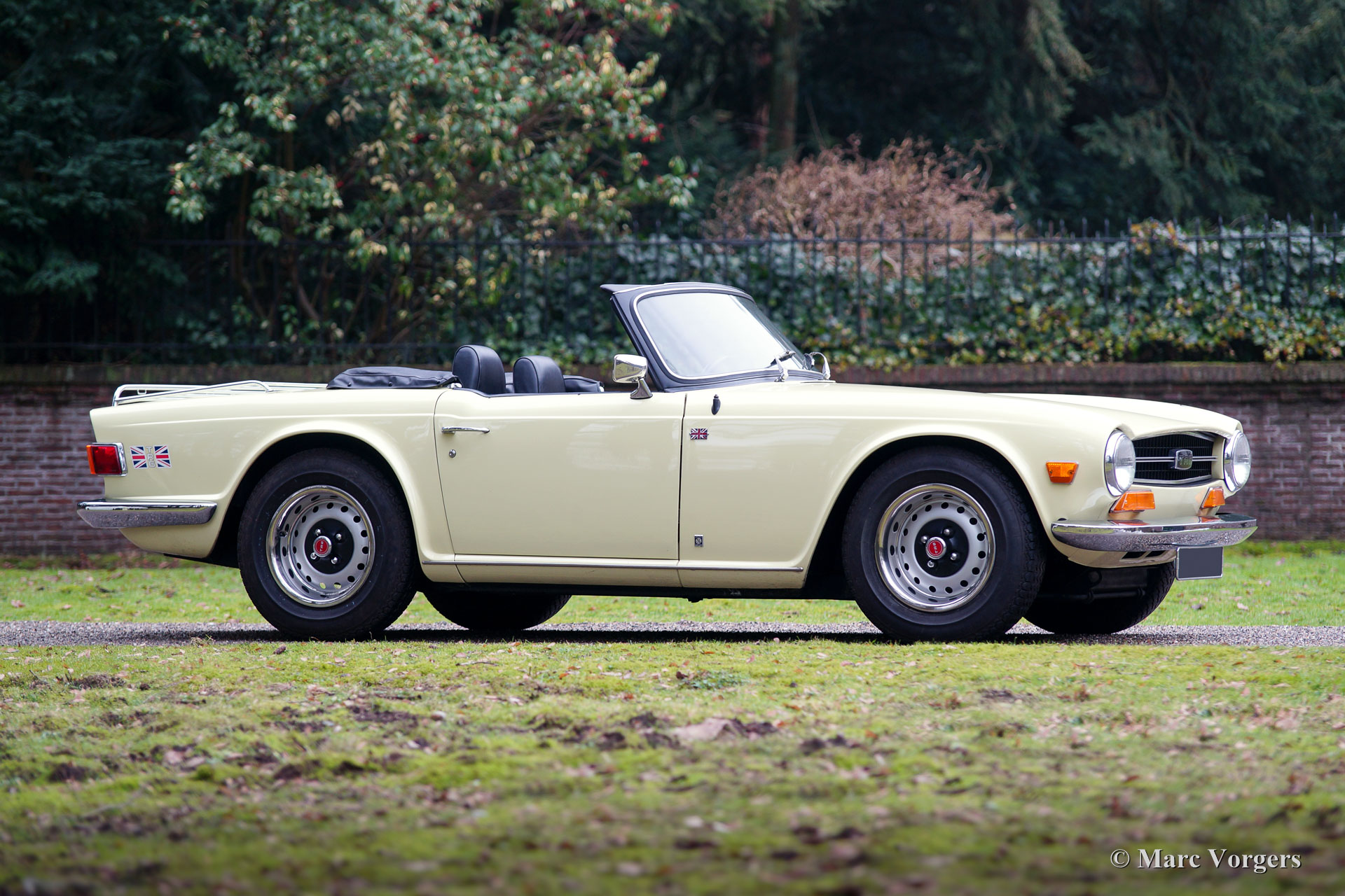 Triumph TR 6, jaar 1969. Kleur pastelgeel met een zwart kunstleren interieur en zwart tapijt. Zwarte ‘soft-top’ en ‘hood-cover’. Deze geweldige Triumph TR 6 werd nieuw verkocht in de USA. De auto werd in het jaar 1995 in Nederland geïmporteerd. Deze TR 6 verkeert in zeer goede staat en de auto rijdt geweldig, het 6-cilinder motorgeluid is magnifiek! Deze vroege TR 6 toont alle originele details zoals de interieurverlichting op de vloer, de het vroege type klokken en meters en de stoere wielen met zwarte naafkappen. De auto is uitgerust met overdrive (bediend vanaf de pookknop), een langere versnellingspook, een chroom kofferrek en een met leer bekleed sportstuur. Dit is een zeer goed en fraai exemplaar voor een interessante prijs.