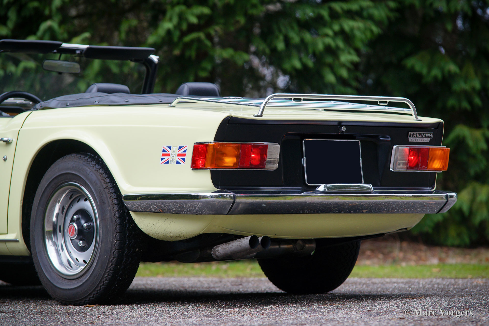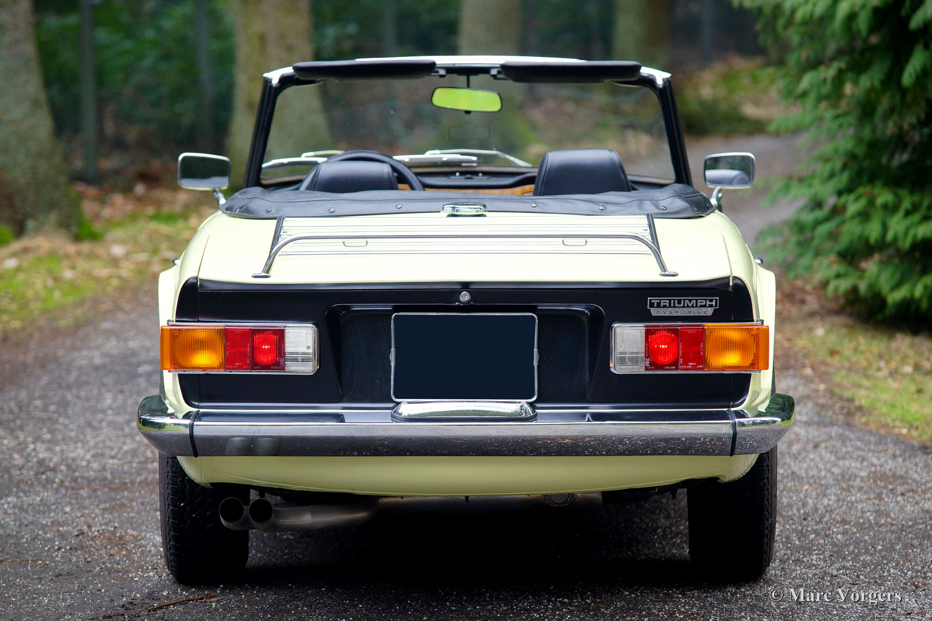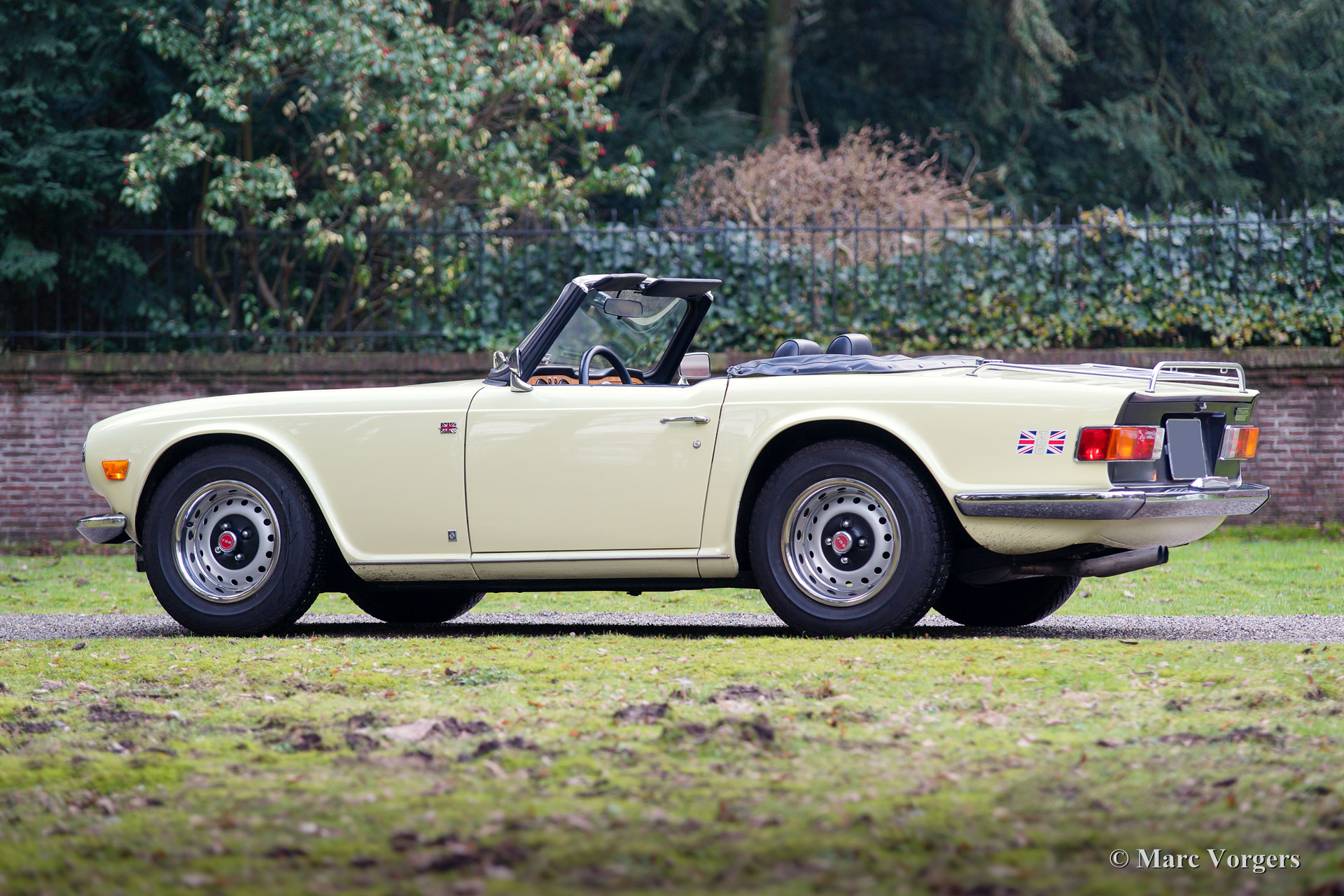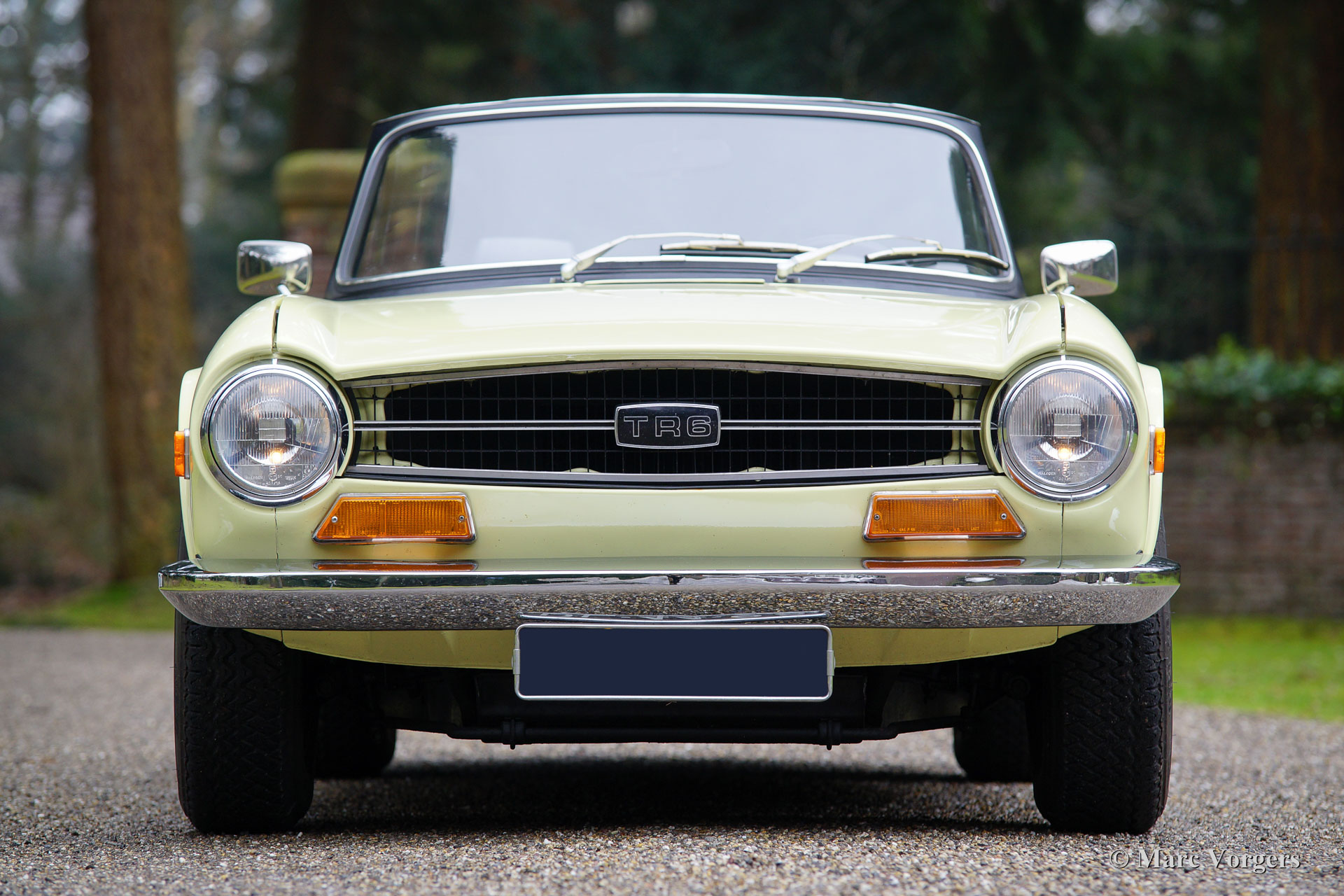 Triumph TR 6, jaar 1969. Kleur pastelgeel met een zwart kunstleren interieur en zwart tapijt. Zwarte ‘soft-top’ en ‘hood-cover’. Deze geweldige Triumph TR 6 werd nieuw verkocht in de USA. De auto werd in het jaar 1995 in Nederland geïmporteerd. Deze TR 6 verkeert in zeer goede staat en de auto rijdt geweldig, het 6-cilinder motorgeluid is magnifiek! Deze vroege TR 6 toont alle originele details zoals de interieurverlichting op de vloer, de het vroege type klokken en meters en de stoere wielen met zwarte naafkappen. De auto is uitgerust met overdrive (bediend vanaf de pookknop), een langere versnellingspook, een chroom kofferrek en een met leer bekleed sportstuur. Dit is een zeer goed en fraai exemplaar voor een interessante prijs.