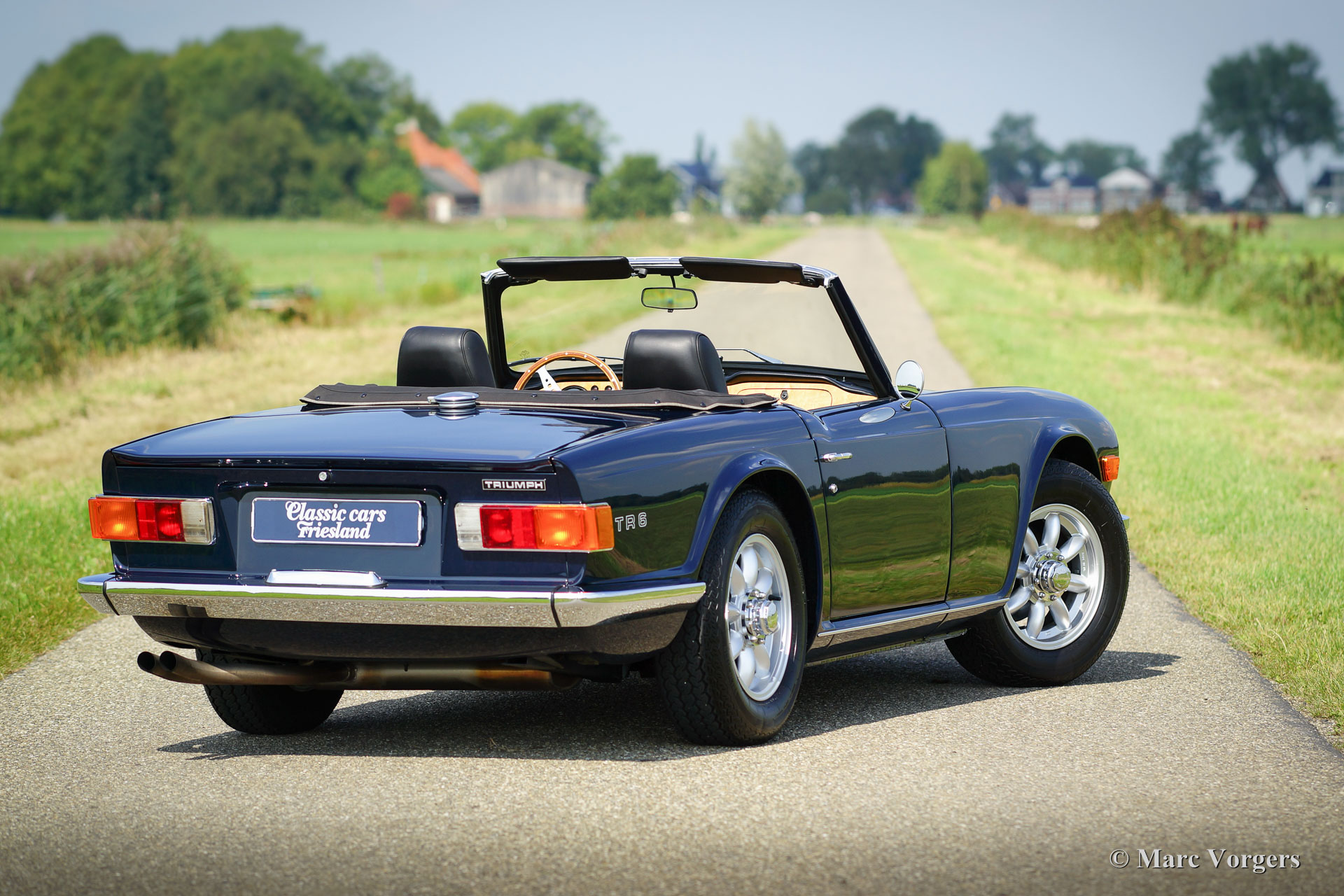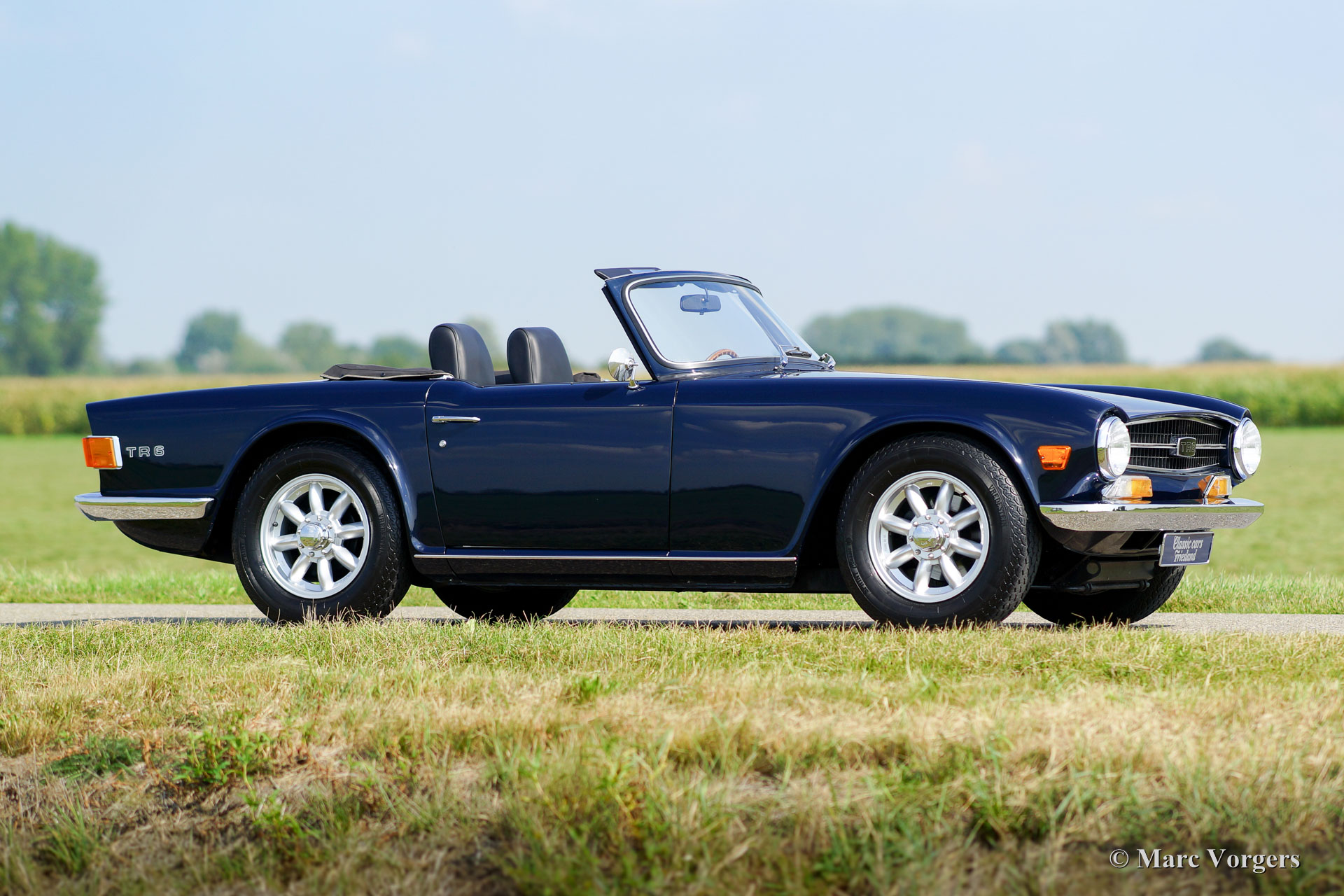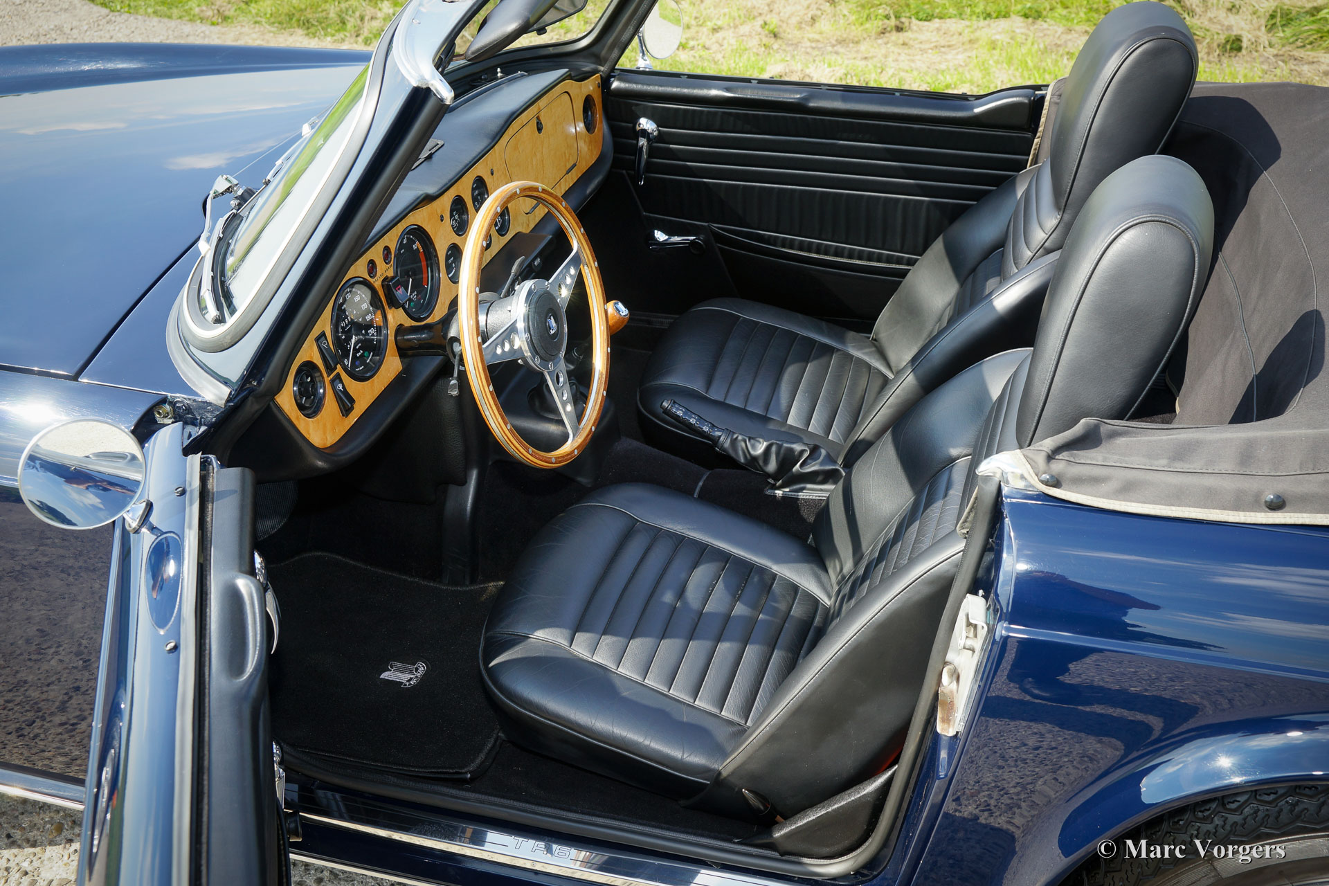 Triumph TR 6, jaar 1969. Kleur donkerblauw met zwart vol-lederen interieur en zwart tapijt. Zwarte mohair soft-top en hood-cover. Deze geweldige TR 6 is enkele jaren geleden uitvoerig en ‘body-off’ gerestaureerd. De auto verkeert in sublieme topstaat! Het chassis werd gestraald en daarna voorzien van een poedercoating. De carrosserie is vanaf de plaat strakgemaakt en voorzien van een perfect nieuw laksysteem. De carrosserie toont perfecte passing van de plaatdelen. Ook de techniek en de mechaniek werden uitvoerig onder handen genomen; de motor en de versnellingsbak zijn gereviseerd en verder werd alles vernieuwd, gereviseerd, en/ of vernieuwd – dit inclusief de dashboard instrumenten. Deze TR 6 is voorzien van Minilite type lichtmetalen wielen, Vredestein Classic banden en een MotoLita stuurwiel. Een fantastisch rijdend top-exemplaar!
