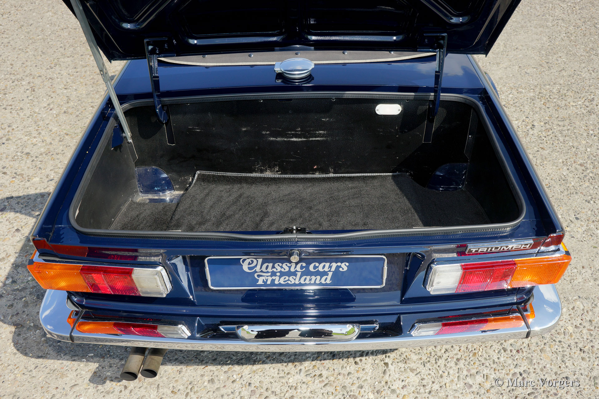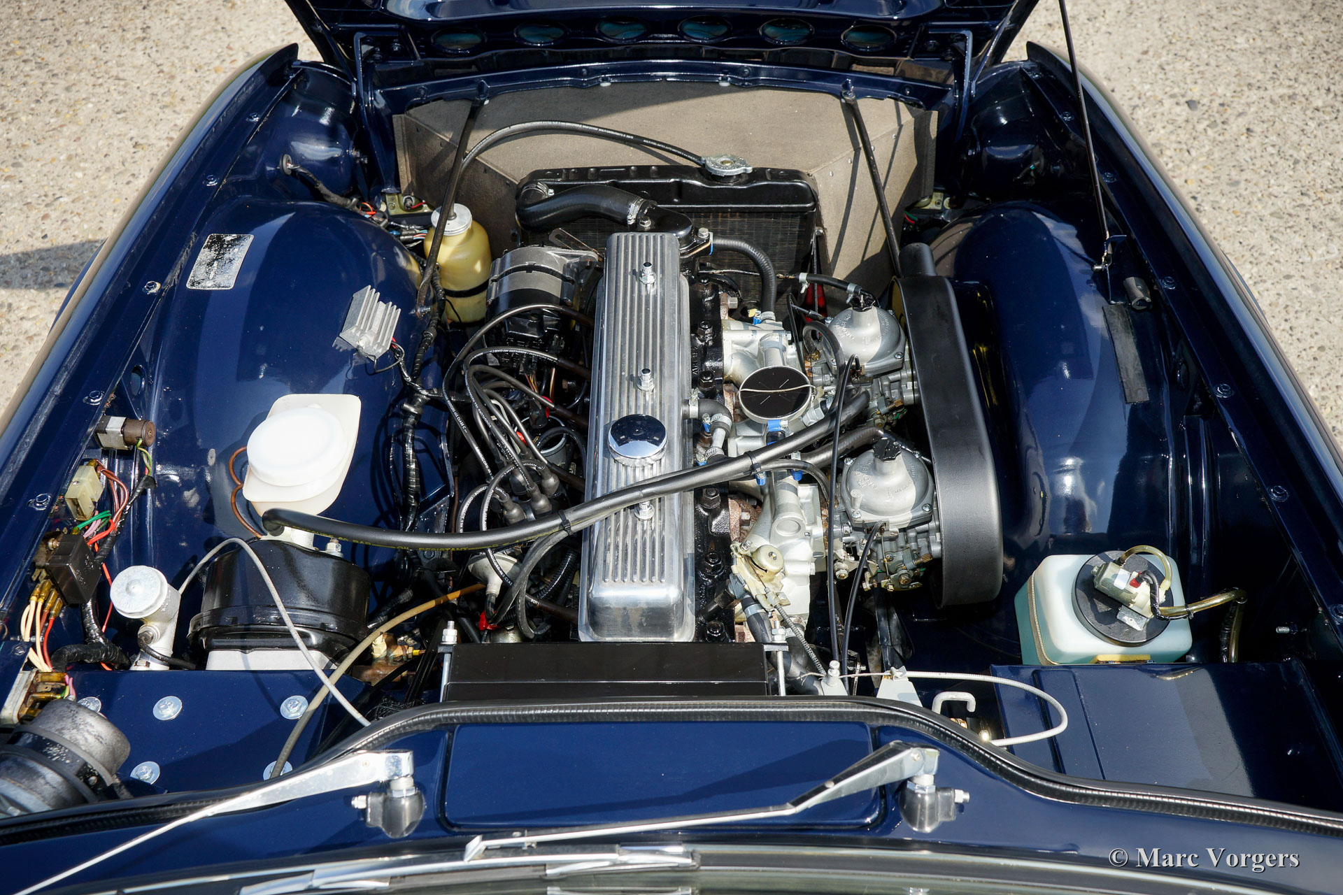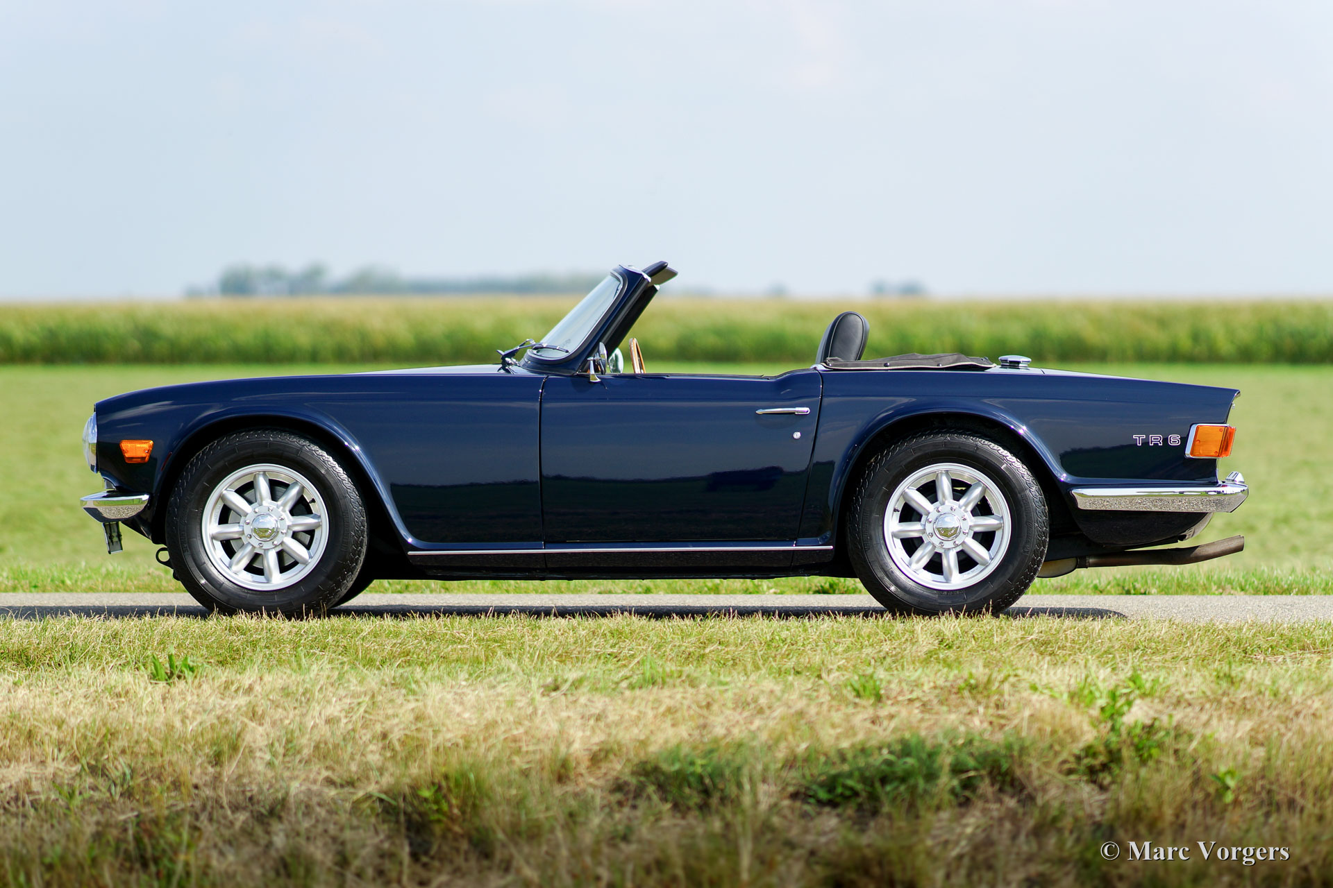 Triumph TR 6, jaar 1969. Kleur donkerblauw met zwart vol-lederen interieur en zwart tapijt. Zwarte mohair soft-top en hood-cover. Deze geweldige TR 6 is enkele jaren geleden uitvoerig en ‘body-off’ gerestaureerd. De auto verkeert in sublieme topstaat! Het chassis werd gestraald en daarna voorzien van een poedercoating. De carrosserie is vanaf de plaat strakgemaakt en voorzien van een perfect nieuw laksysteem. De carrosserie toont perfecte passing van de plaatdelen. Ook de techniek en de mechaniek werden uitvoerig onder handen genomen; de motor en de versnellingsbak zijn gereviseerd en verder werd alles vernieuwd, gereviseerd, en/ of vernieuwd – dit inclusief de dashboard instrumenten. Deze TR 6 is voorzien van Minilite type lichtmetalen wielen, Vredestein Classic banden en een MotoLita stuurwiel. Een fantastisch rijdend top-exemplaar!
