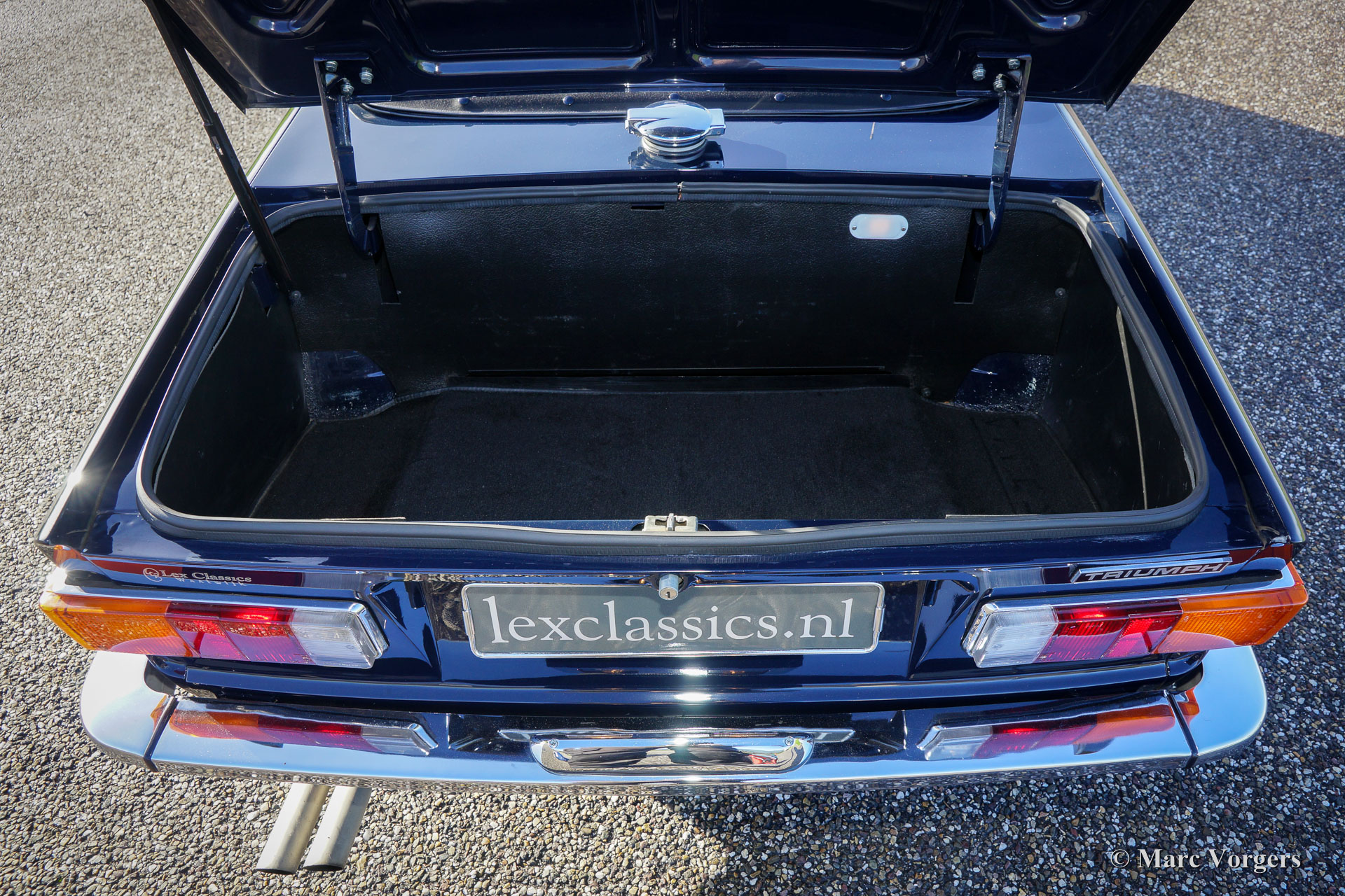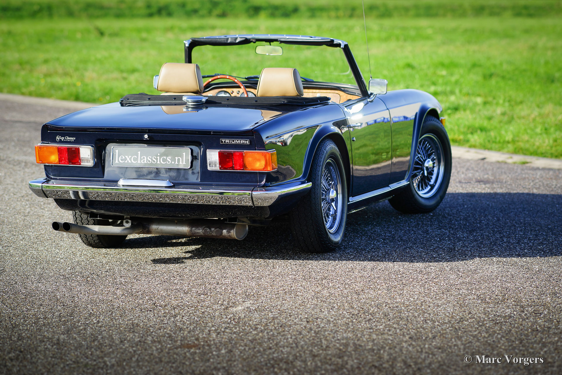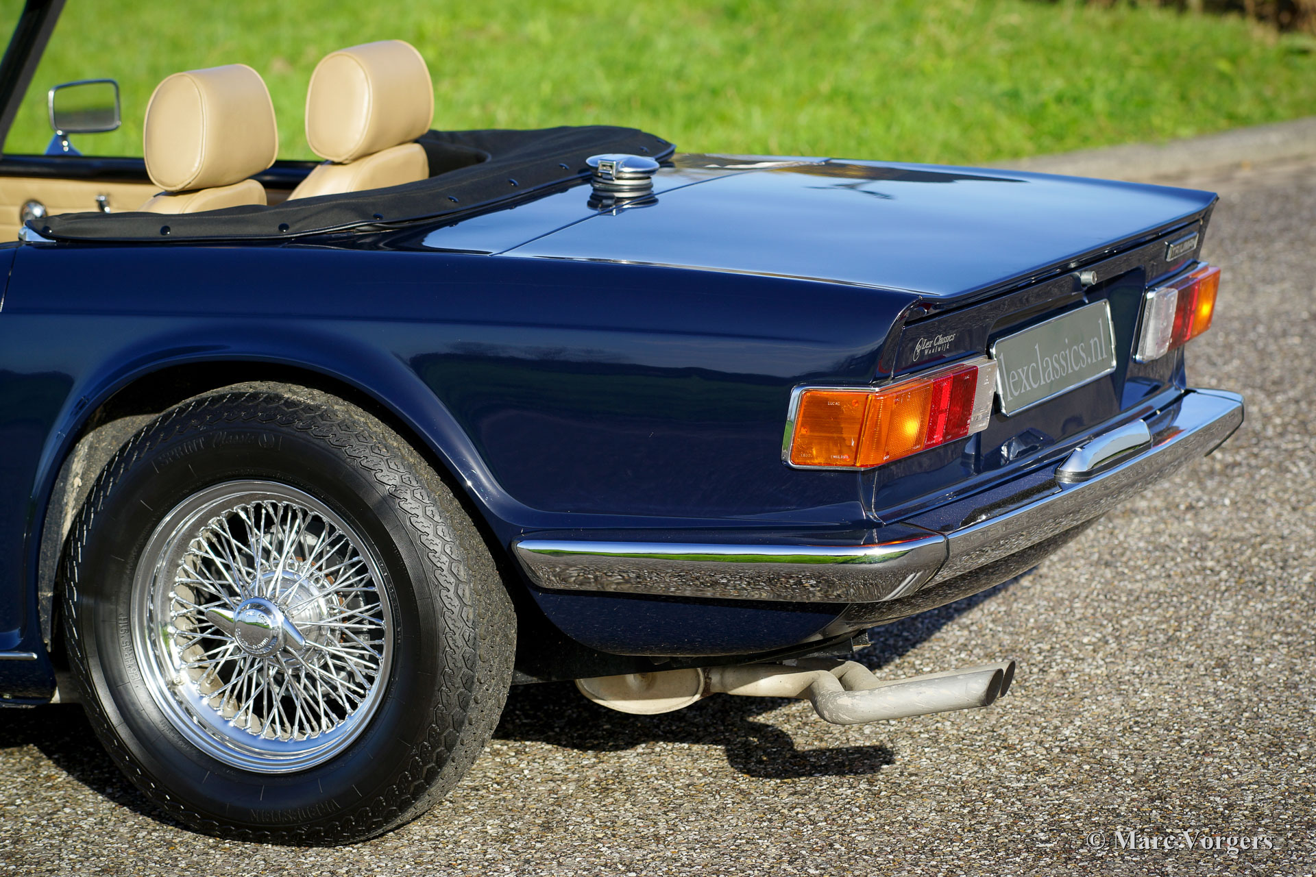 Triumph TR 6, jaar 1969. Kleur donkerblauw (Royal blue) met een beige leren interieur en zwart tapijt. Zwarte vinyl soft-top en een zwarte mohair hood-cover. Deze geweldige Triumph TR 6 werd nieuw verkocht in de USA, in het jaar 2006 werd de auto in Nederland geïmporteerd. Aansluitend werd auto uitvoerig gerestaureerd, de restauratie werd afgerond in 2008. Sindsdien heeft de auto ca. 19.000 kilometer gereden. Deze stoere TR 6 verkeert in excellente staat en de auto rijdt geweldig!