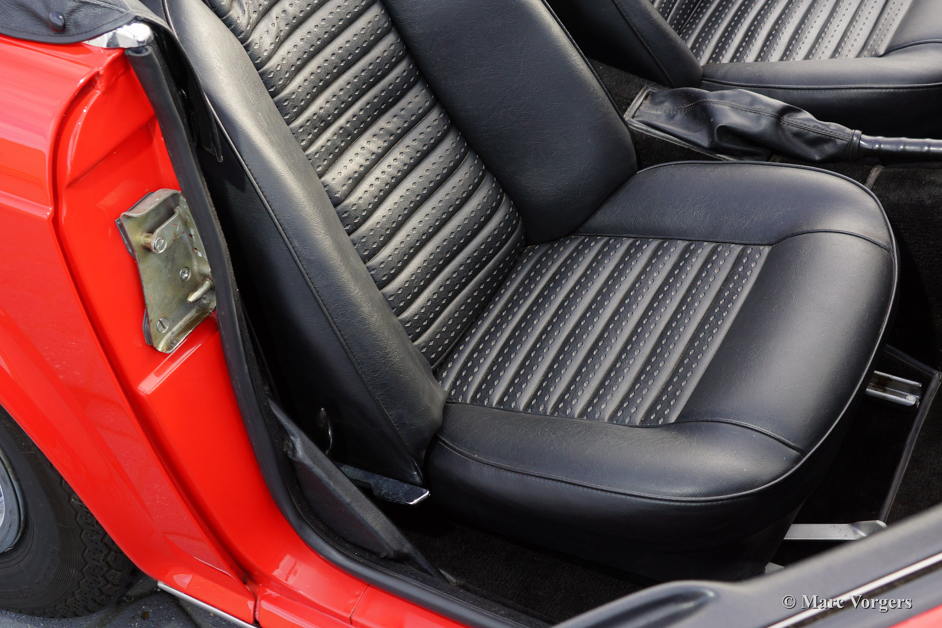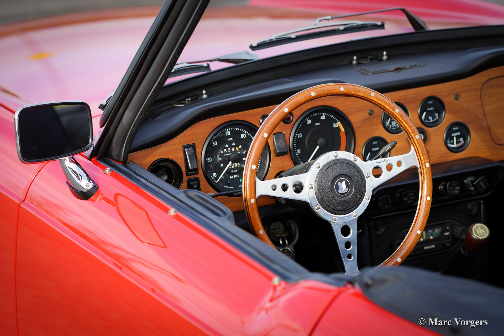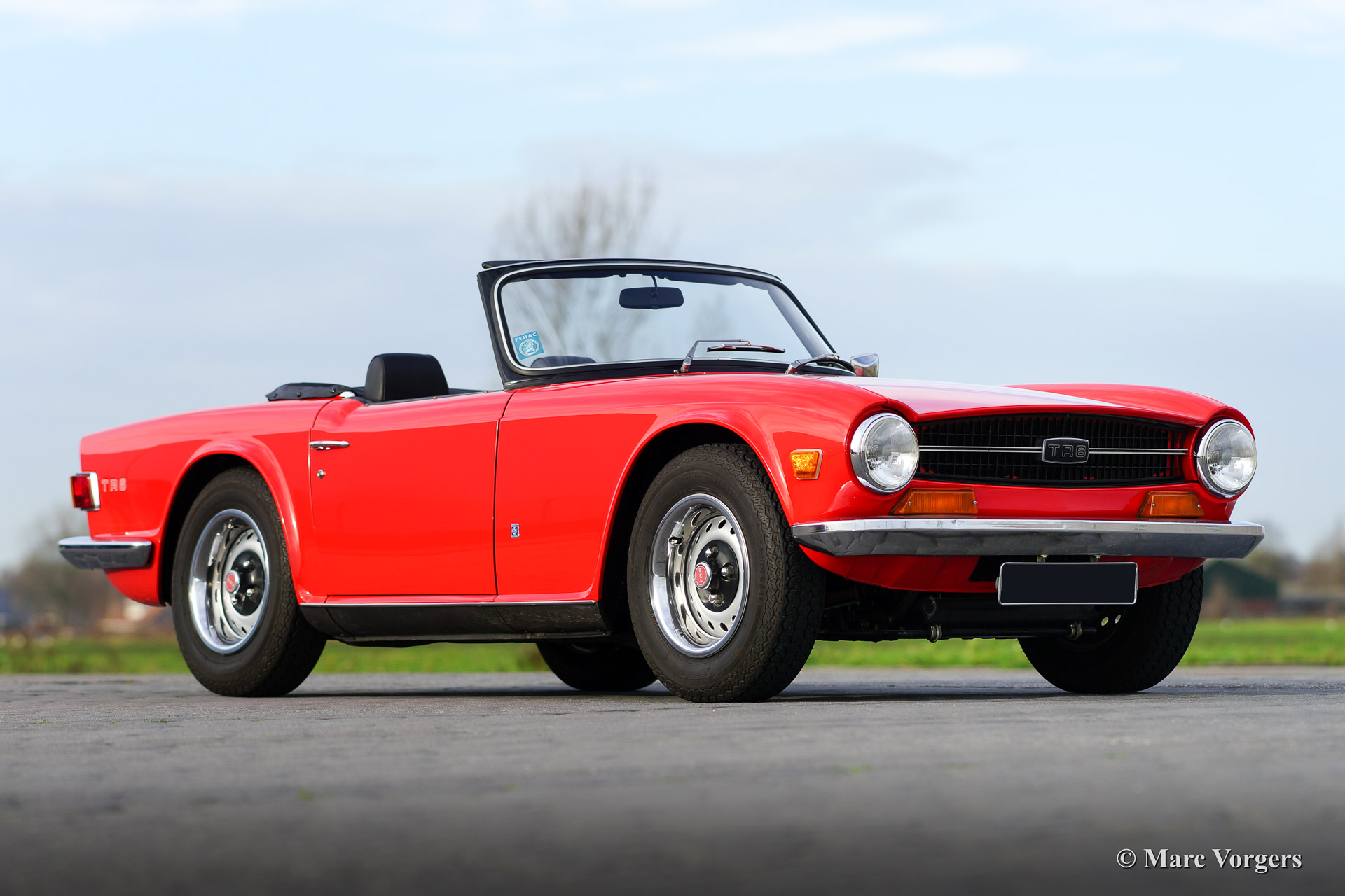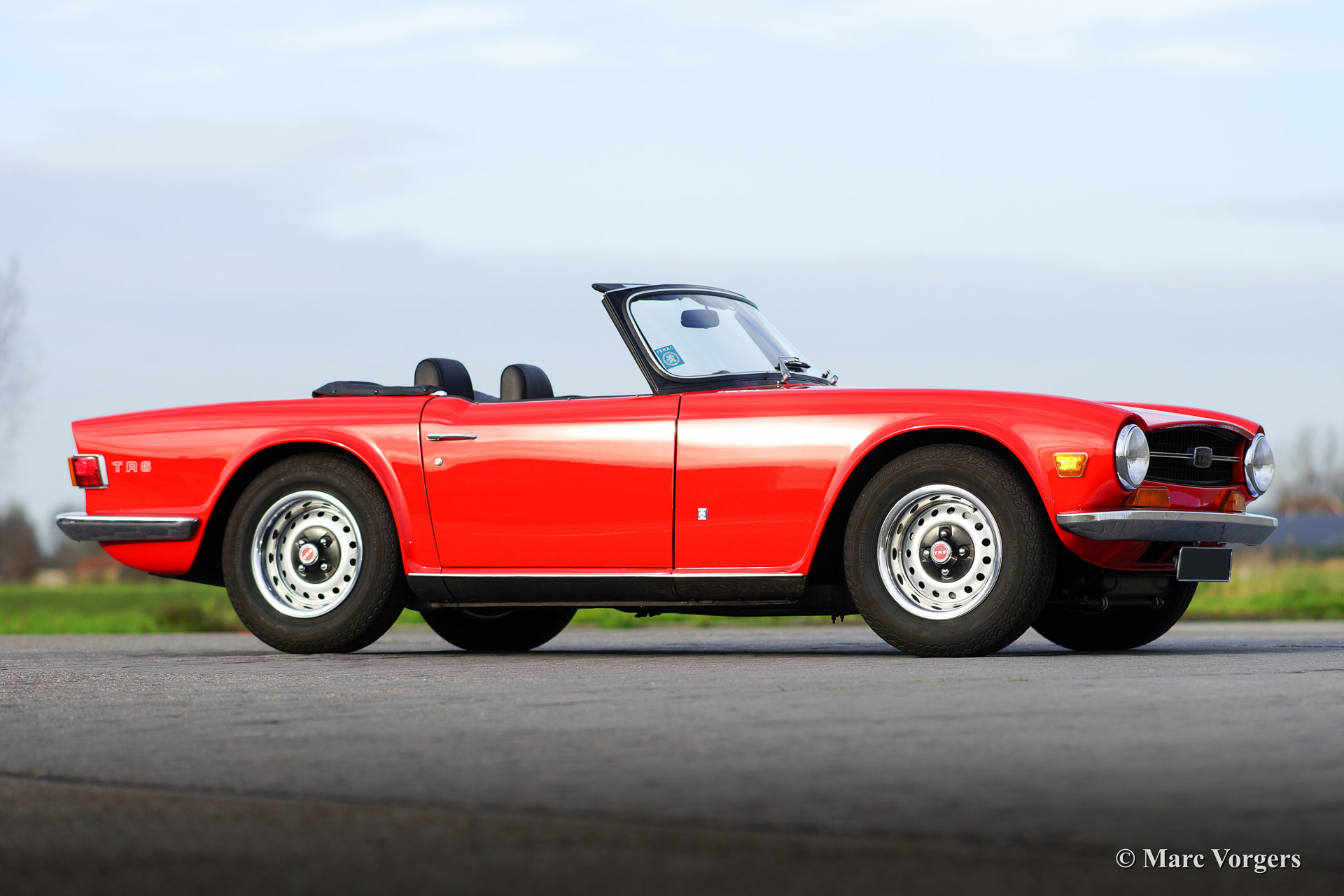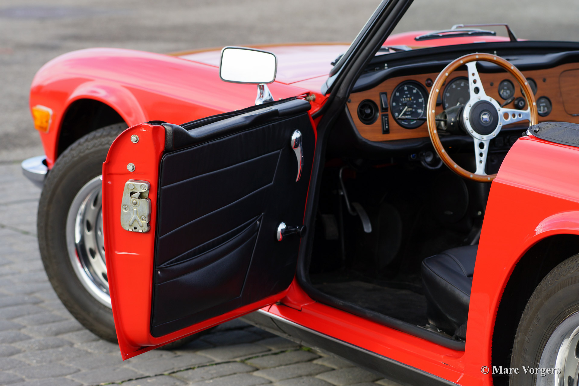 Triumph TR 6, bouwjaar 1972. Kleur rood met een zwart interieur. Zwarte soft top en hood cover. Deze prachtige Triumph TR6 werd een paar jaar geleden uitvoerig gerestaureerd, de auto verkeert in excellente tot sublieme staat! Een fotoreportage van de restauratie is aanwezig evenals facturen die een goed beeld van de onderdelen die zijn vernieuwd. De auto werd gerestaureerd volgens originele specificaties wat betekent dat deze TR6 comfortabel-sportief rijdt; een geweldige combinatie! Deze TR 6 is voorzien van overdrive, een MotoLita sportstuur met houten rand, een klassieke radio, nieuwe SU carburateurs en K & N sport-luchtfilters. Dit is een geweldige Triumph TR 6!