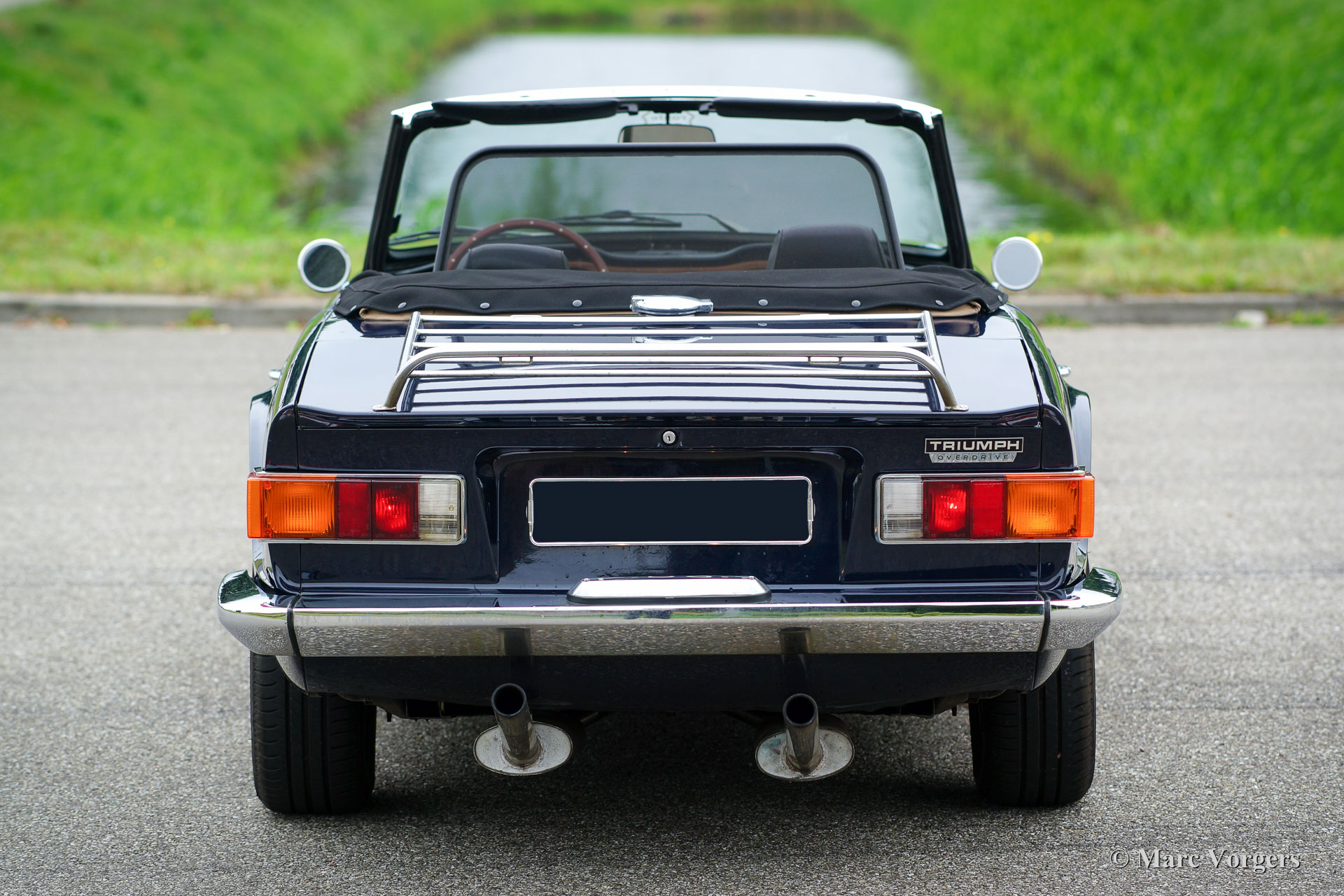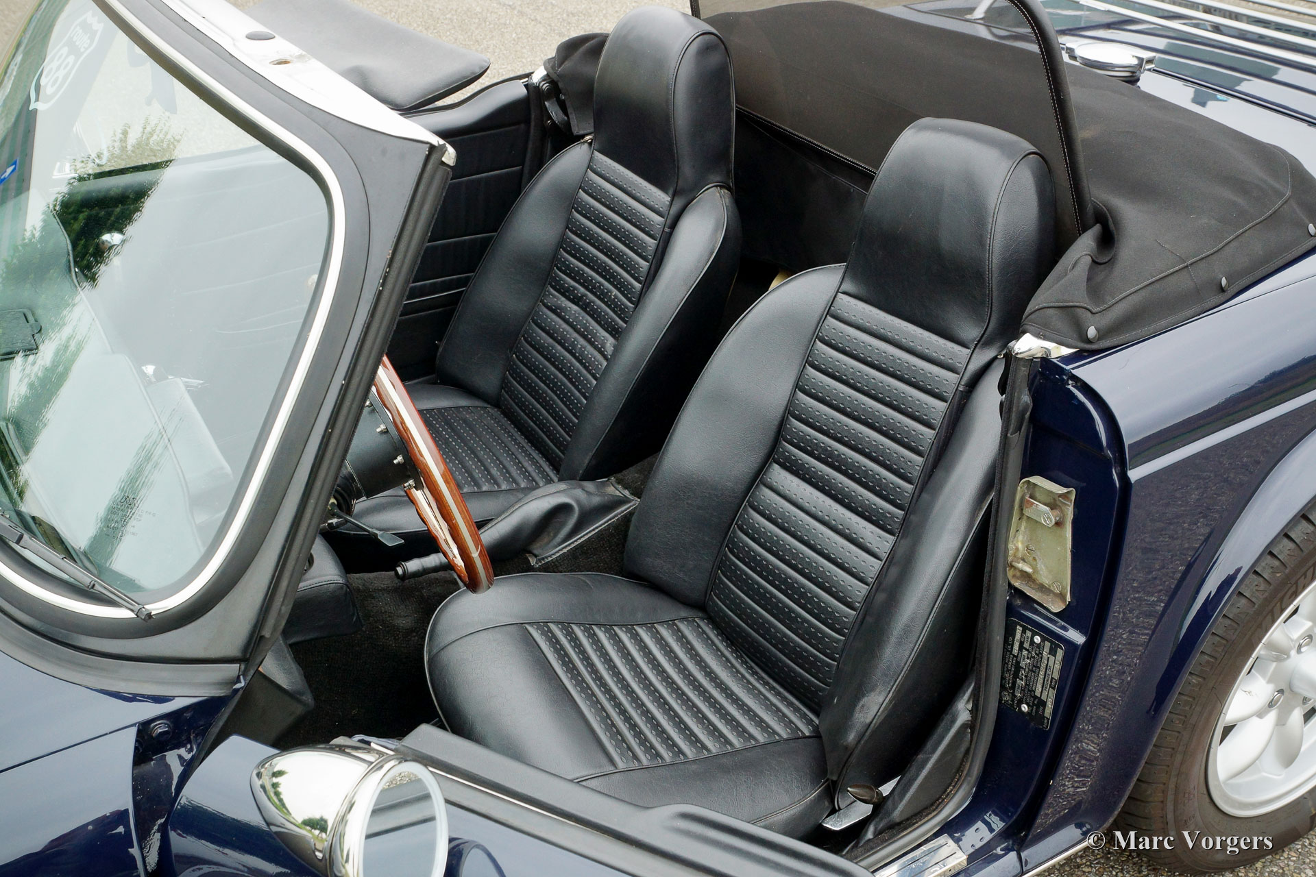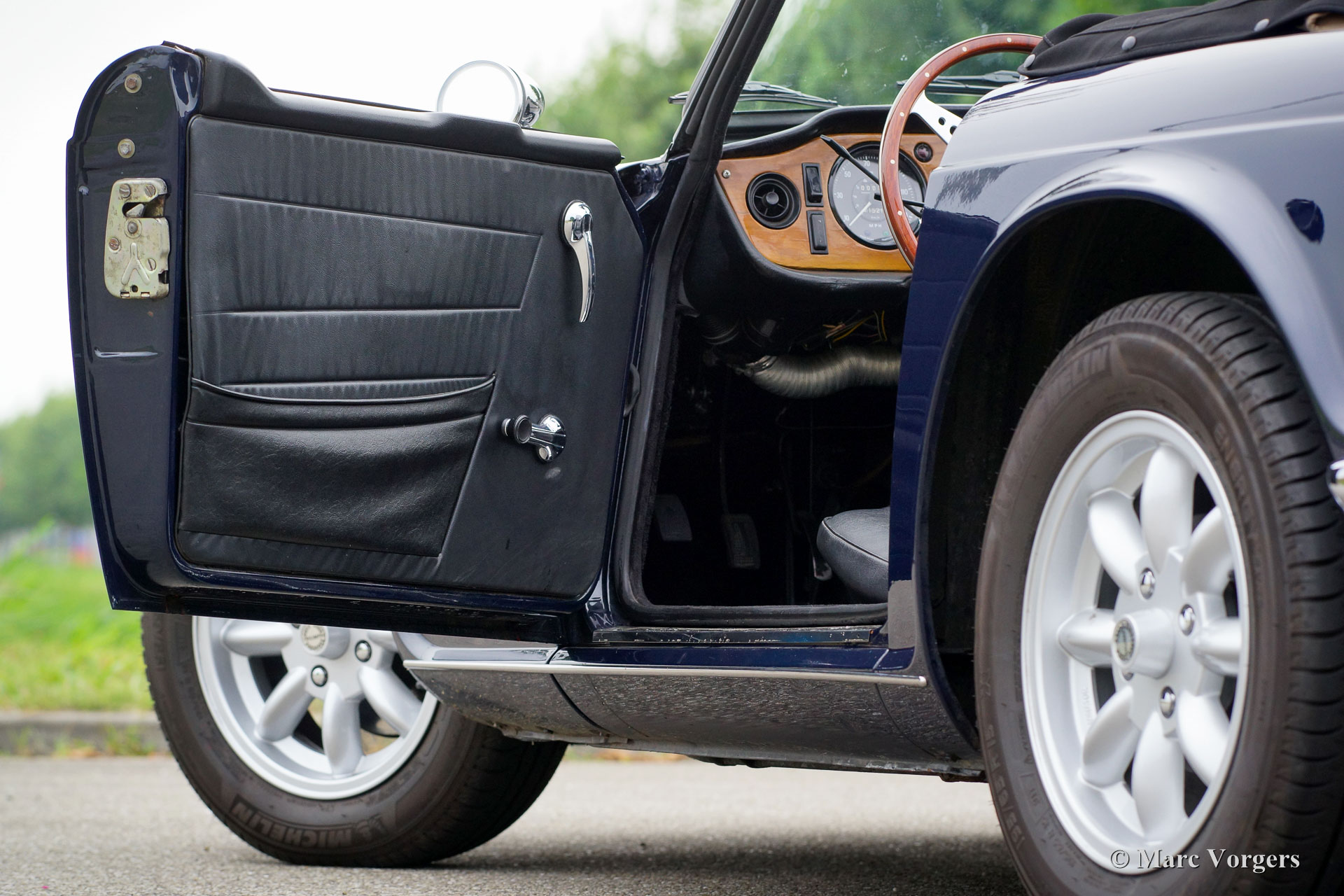 Triumph TR 6, jaar 1972. Kleur donkerblauw met een zwartleren interieur. Beige mohair soft-top en hood-cover. Deze fantastische Triumph TR 6 verkeert in zeer goede tot excellente staat en de auto rijdt geweldig! Dit is deels te danken aan de getunede zescilinder-lijnmotor die is voorzien van drie dubbele Weber carburateurs. De motor is heerlijk sportief, rijdt op loodvrije benzine, en deze maakt een prachtig geluid! Deze TR 6 is voorzien van overdrive, rvs sportuitlaat, Weber carburateurs, K&N-sportluchtfilters, elektronische ontsteking, Minilite lichtmetalen wielen met zeer goede Michelin 195/65-15 banden, een chroom kofferrek, twee buitenspiegels, Moto-Lita sportstuur met houten rand en een inklapbaar windscherm. Voor degene die nog lang niet van plan is zijn wilde haren te verliezen; ‘Let the fun begin!’