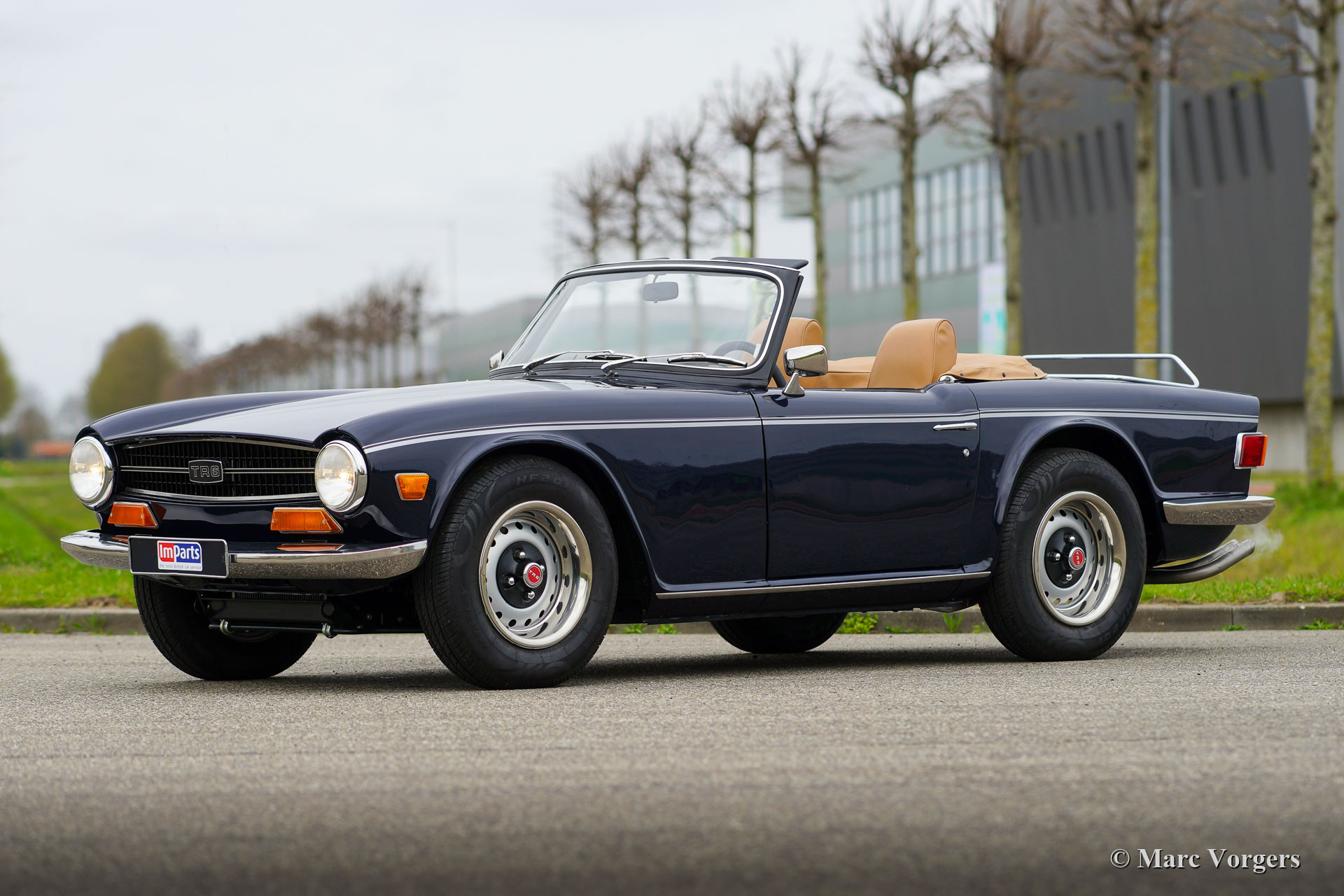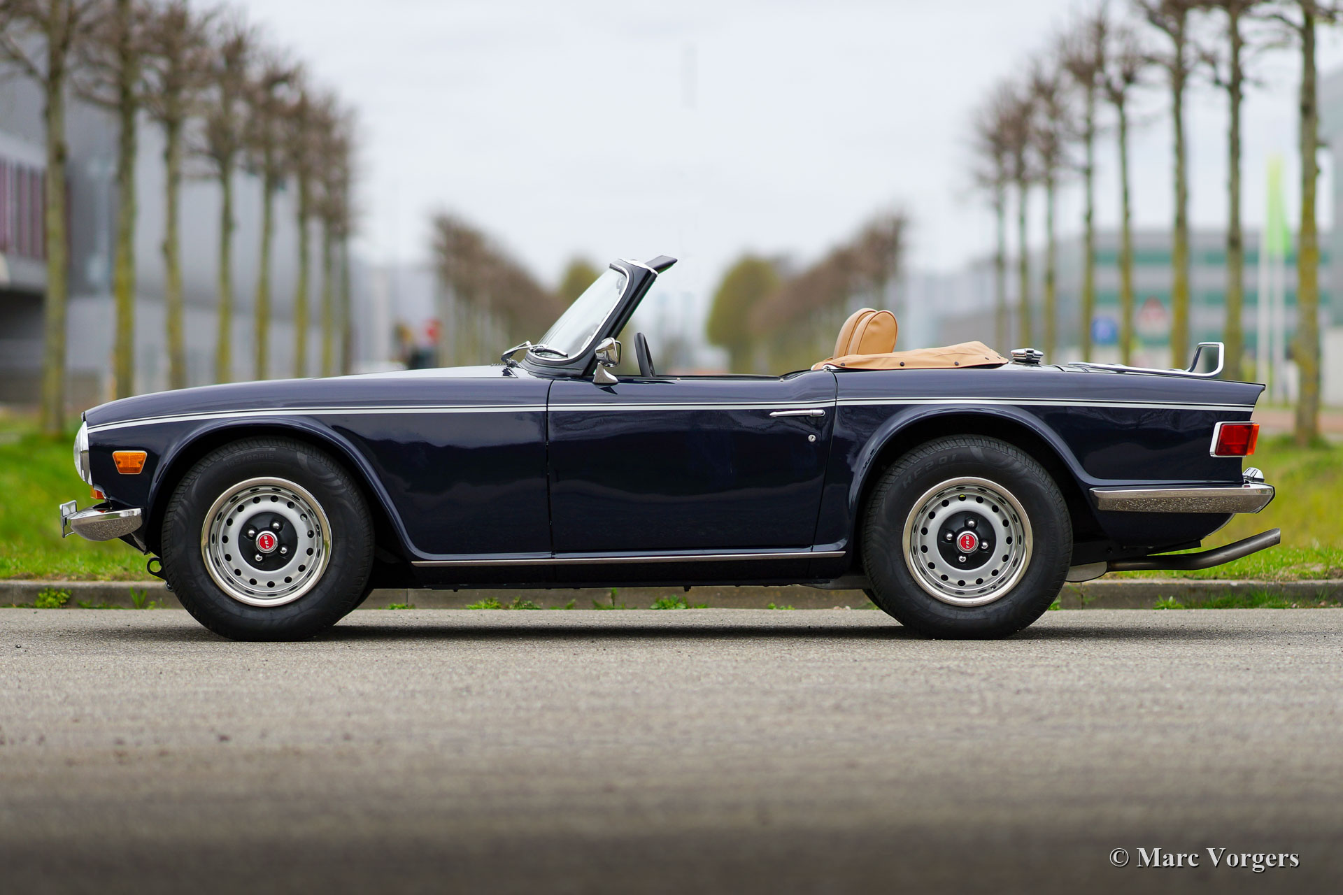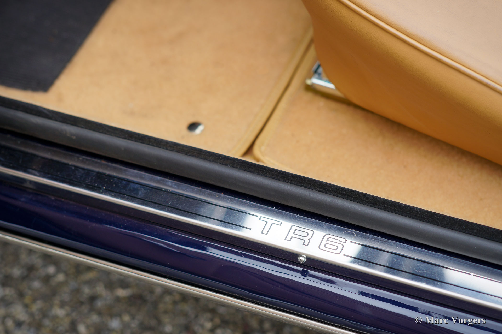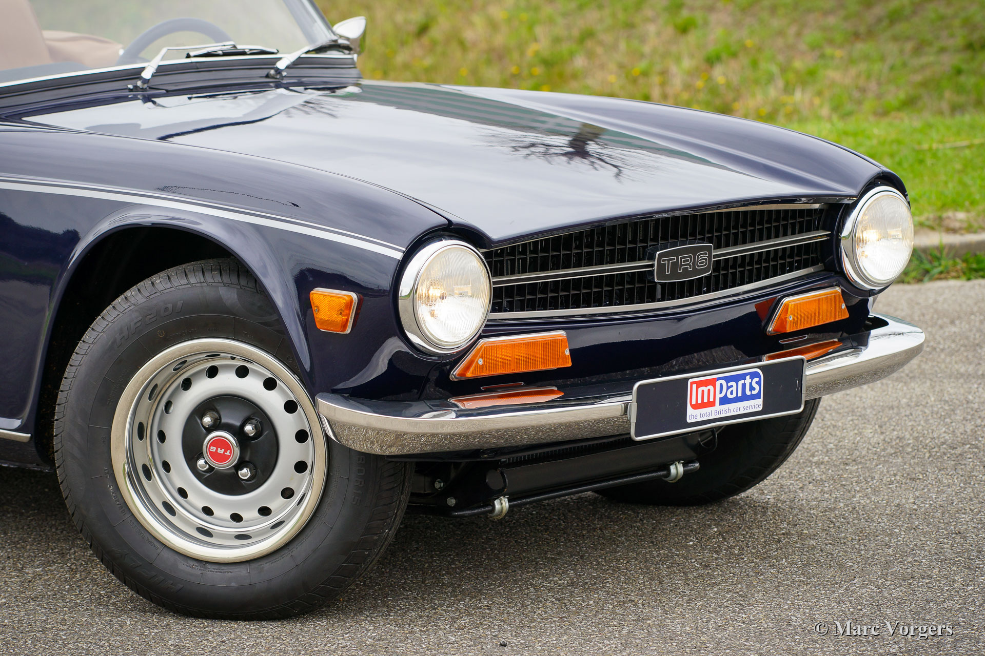 Triumph TR 6, jaar 1972. Kleur donkerblauw gecombineerd met een beige lederen interieur en bijpassend tapijt. Beige vinyl soft-top en kapafdekking. Deze prachtige Triumph TR 6 is in de periode 2019 - 2020 door een particulier uitvoerig gerestaureerd. Carrosserie en chassis zijn gerestaureerd en gespoten, het interieur is vernieuwd, het houten dashboard is vernieuwd, de motorkap is vernieuwd en de overige onderdelen zijn gerestaureerd en/ of vernieuwd. De motor en de versnellingsbak zijn gereviseerd. Bekijk de foto's zorgvuldig om alle nieuwe onderdelen en restauratiedetails te zien. Deze TR 6 is uitgerust met een nieuwe originele stalen uitlaat die een fantastisch zescilinder geluid produceert. Verder is de auto voorzien van een aluminium radiator met hoge capaciteit, een elektrische koelventilator, S.U.-carburateurs met sportluchtfilters, een nieuw MotoLita sportstuur met leren rand en een moderne autoradio. Deze Triumph TR 6 rijdt erg goed en de auto staat klaar om met volle teugen genoten te worden!