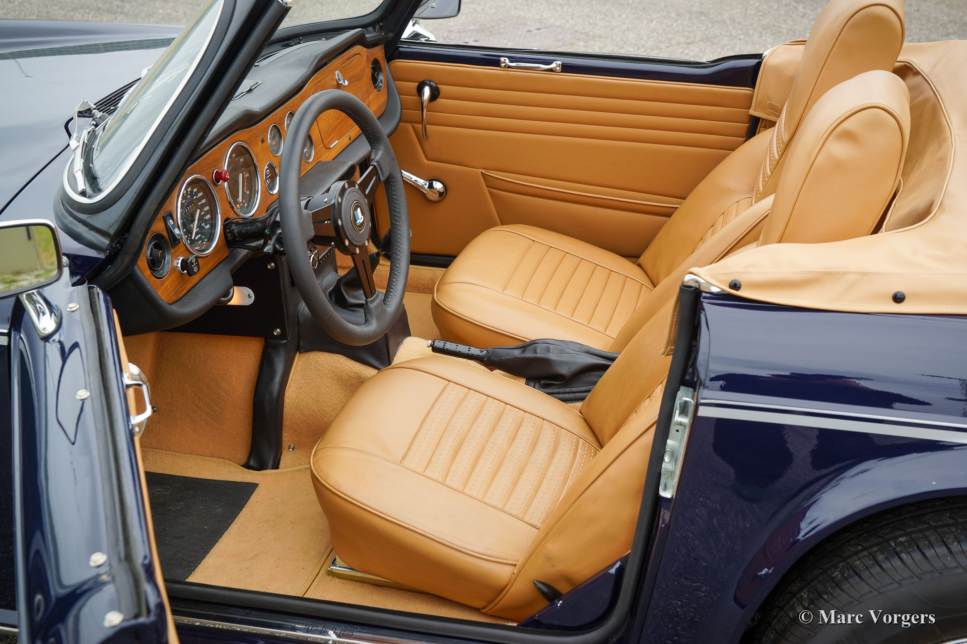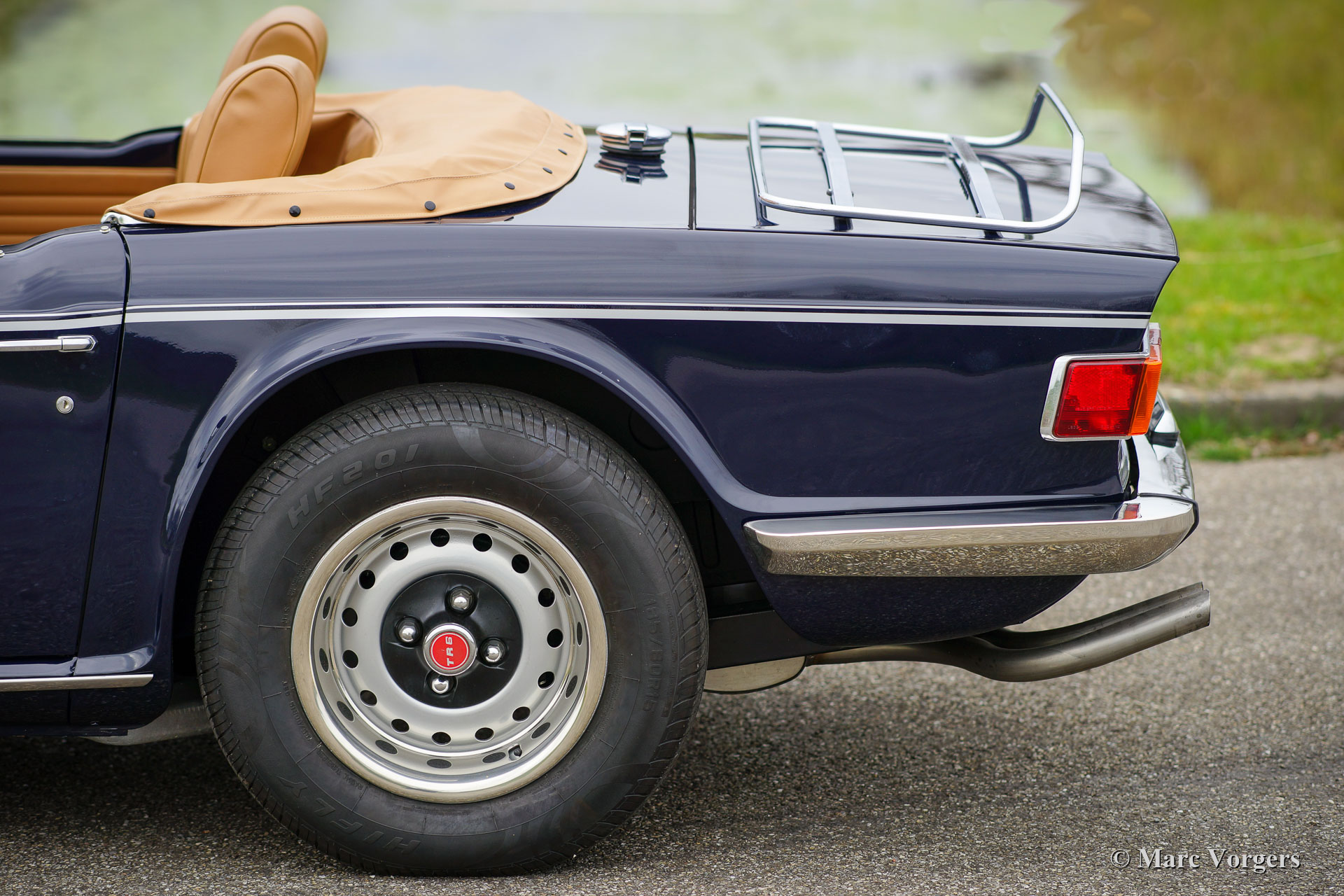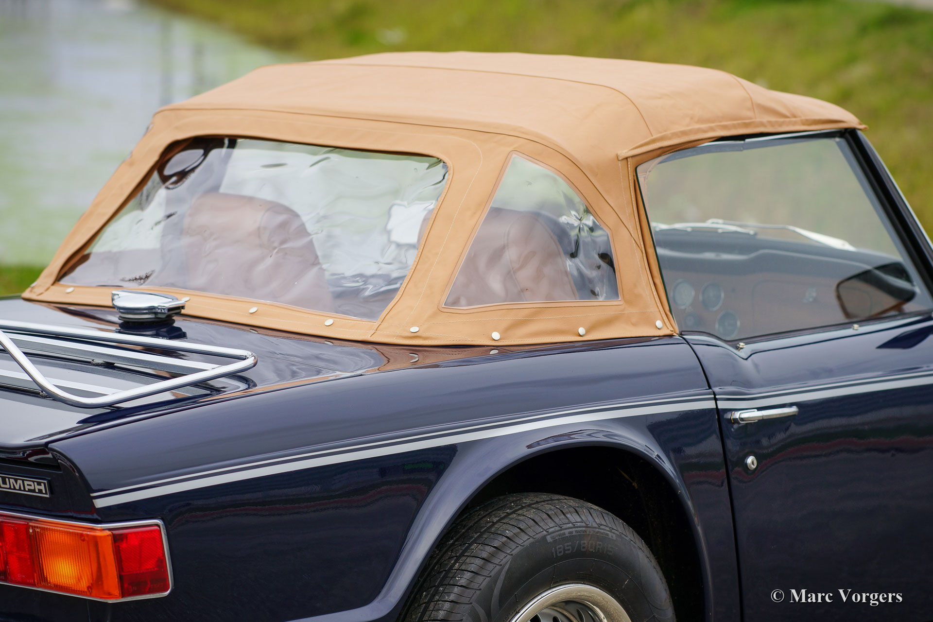 Triumph TR 6, jaar 1972. Kleur donkerblauw gecombineerd met een beige lederen interieur en bijpassend tapijt. Beige vinyl soft-top en kapafdekking. Deze prachtige Triumph TR 6 is in de periode 2019 - 2020 door een particulier uitvoerig gerestaureerd. Carrosserie en chassis zijn gerestaureerd en gespoten, het interieur is vernieuwd, het houten dashboard is vernieuwd, de motorkap is vernieuwd en de overige onderdelen zijn gerestaureerd en/ of vernieuwd. De motor en de versnellingsbak zijn gereviseerd. Bekijk de foto's zorgvuldig om alle nieuwe onderdelen en restauratiedetails te zien. Deze TR 6 is uitgerust met een nieuwe originele stalen uitlaat die een fantastisch zescilinder geluid produceert. Verder is de auto voorzien van een aluminium radiator met hoge capaciteit, een elektrische koelventilator, S.U.-carburateurs met sportluchtfilters, een nieuw MotoLita sportstuur met leren rand en een moderne autoradio. Deze Triumph TR 6 rijdt erg goed en de auto staat klaar om met volle teugen genoten te worden!