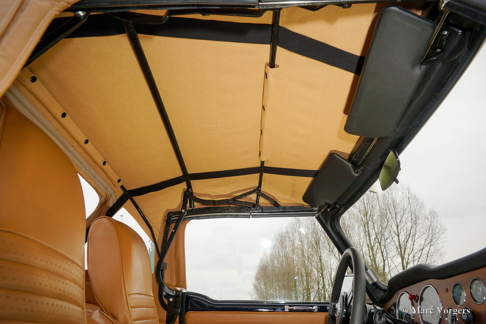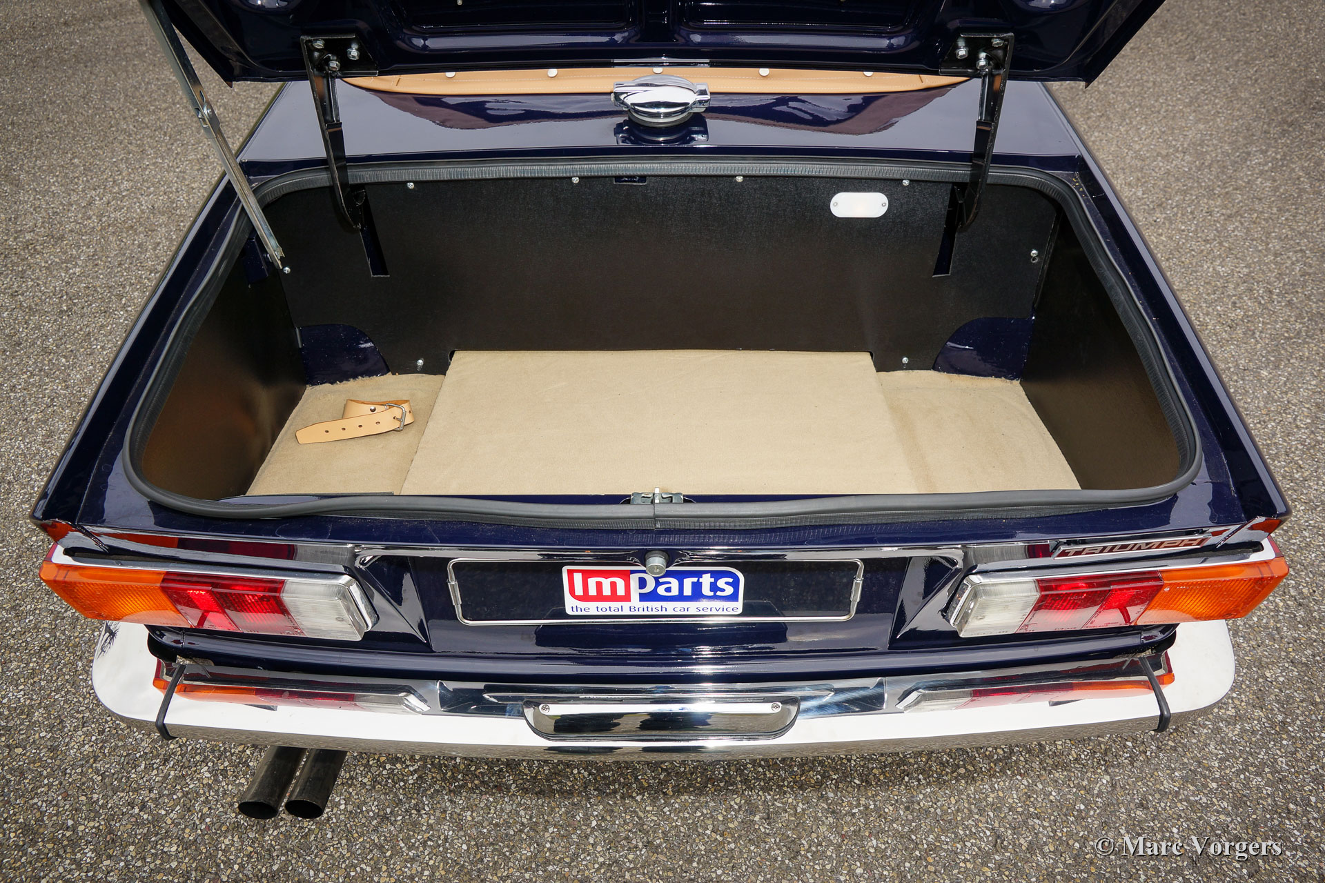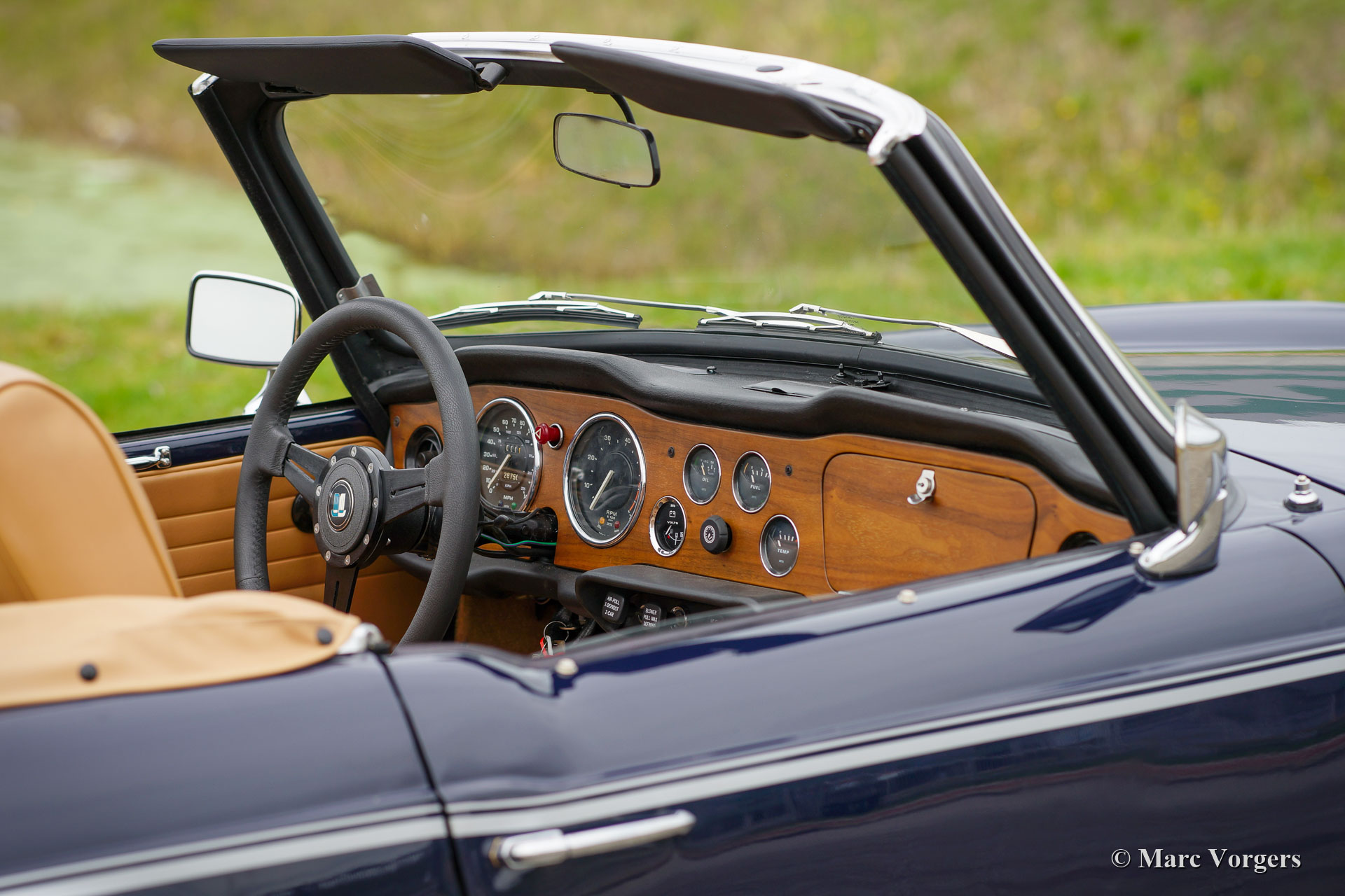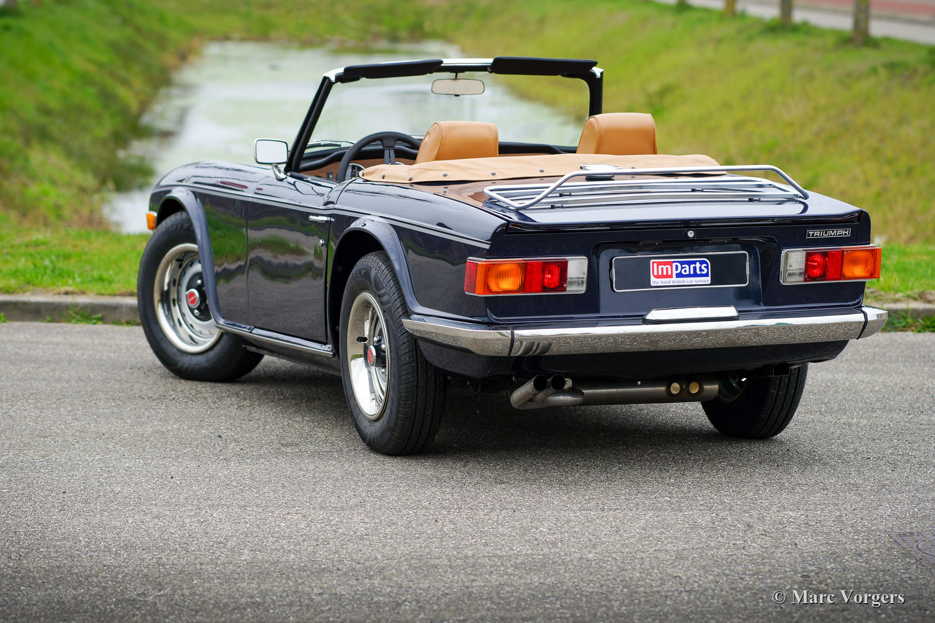Triumph TR 6, jaar 1972. Kleur donkerblauw gecombineerd met een beige lederen interieur en bijpassend tapijt. Beige vinyl soft-top en kapafdekking. Deze prachtige Triumph TR 6 is in de periode 2019 - 2020 door een particulier uitvoerig gerestaureerd. Carrosserie en chassis zijn gerestaureerd en gespoten, het interieur is vernieuwd, het houten dashboard is vernieuwd, de motorkap is vernieuwd en de overige onderdelen zijn gerestaureerd en/ of vernieuwd. De motor en de versnellingsbak zijn gereviseerd. Bekijk de foto's zorgvuldig om alle nieuwe onderdelen en restauratiedetails te zien. Deze TR 6 is uitgerust met een nieuwe originele stalen uitlaat die een fantastisch zescilinder geluid produceert. Verder is de auto voorzien van een aluminium radiator met hoge capaciteit, een elektrische koelventilator, S.U.-carburateurs met sportluchtfilters, een nieuw MotoLita sportstuur met leren rand en een moderne autoradio. Deze Triumph TR 6 rijdt erg goed en de auto staat klaar om met volle teugen genoten te worden!