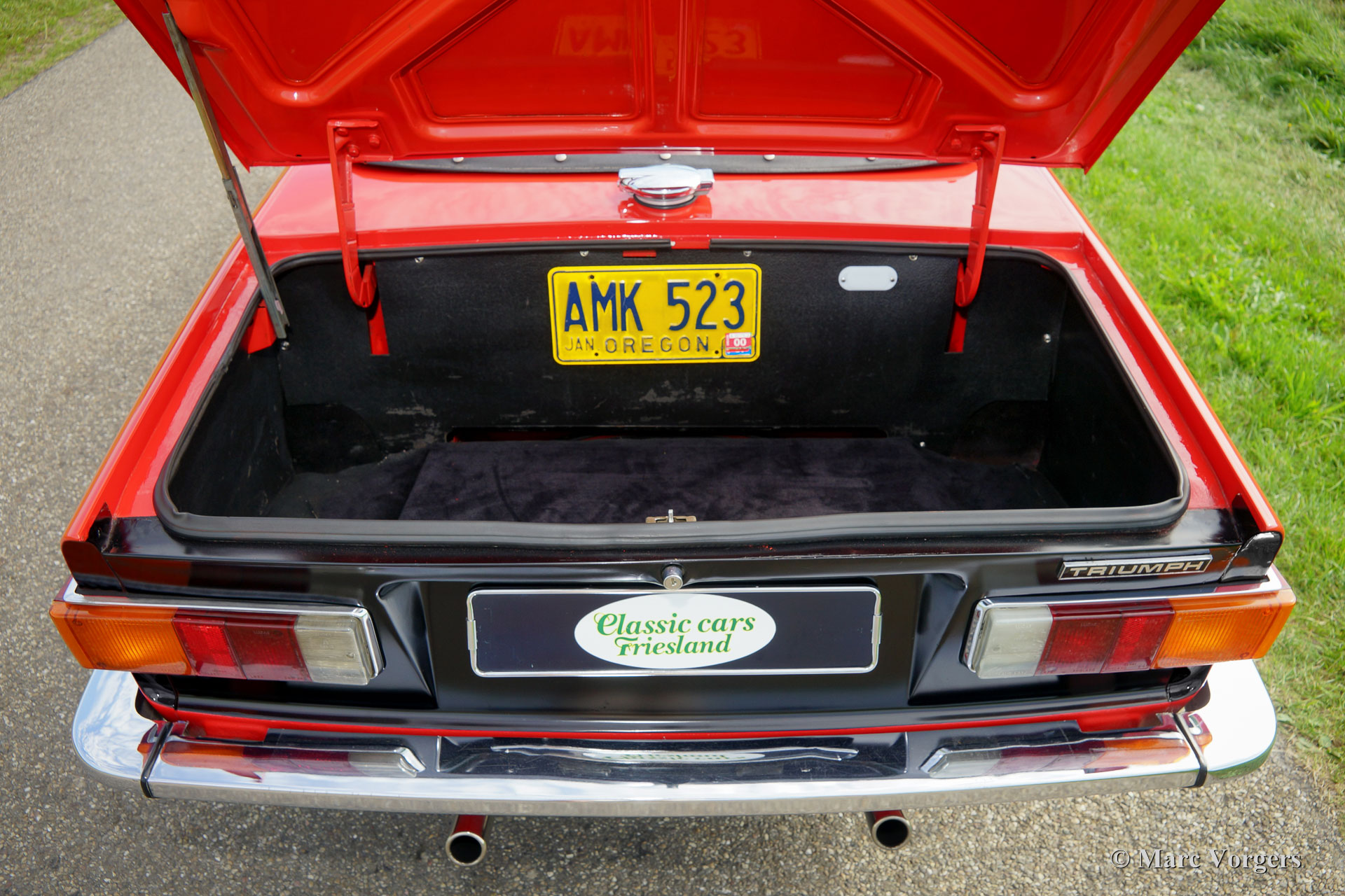 Triumph TR 6, jaar 1973. Kleur Rood met een zwart interieur en zwart tapijt. Zwarte soft-top en hood-cover. Deze stoere Triumph TR 6 werd in het verleden ‘body-off’ gerestaureerd, foto’s en facturen van de restauratie zijn aanwezig. Deze voortreffelijke Britse roadster met zescilinder motor en lange motorkap rijdt en klinkt geweldig! Deze Triumph TR 6 is uitgerust met een rvs uitlaat, chroom kofferrek en elektronische ontsteking. De auto verkeert in zeer goede en fraaie staat en de auto is geheel klaar om mooie avonturen te beleven. Het grote genieten kan beginnen!