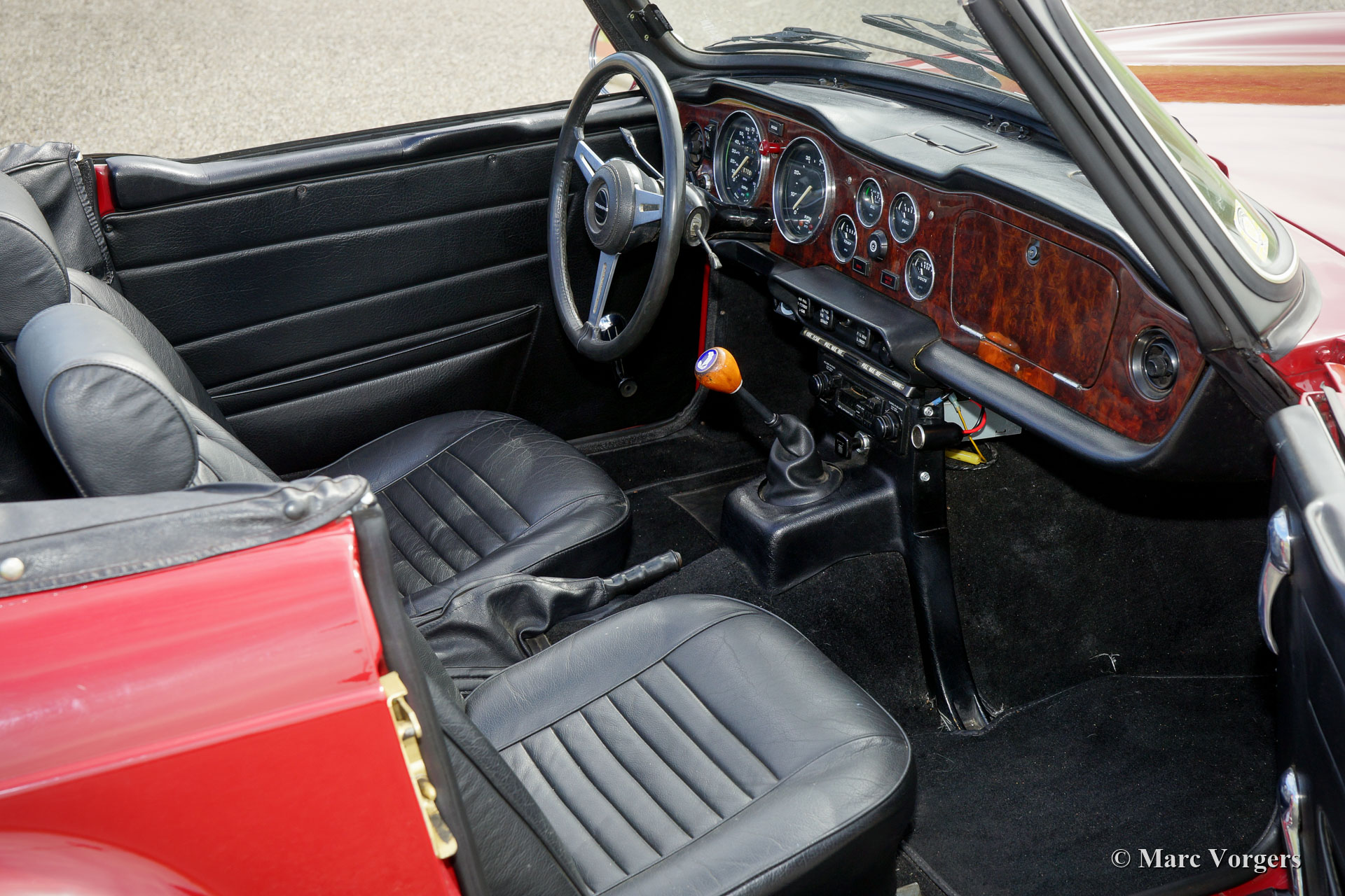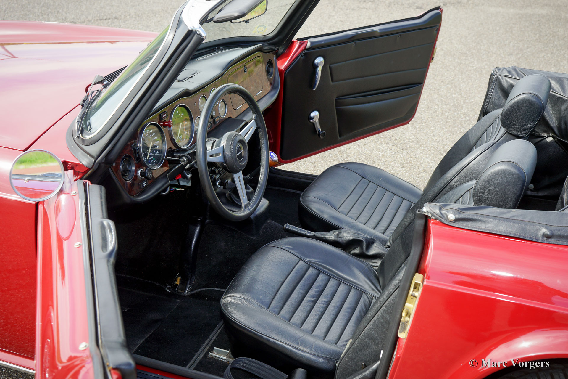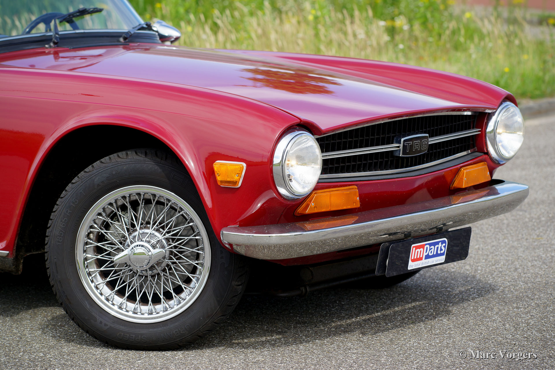 Triumph TR 6, jaar 1973. Kleur donkerrood (Carmine Red) gecombineerd met een zwartleren interieur en zwart tapijt. Zwarte vinyl soft-top en hood-cover. Deze fantastische Triumph TR 6 is nieuw verkocht in de USA. De auto verkeert in excellente rijdersconditie met slechts een paar sporen van normaal gebruik. De auto rijdt en klinkt perfect! De carburateurmotor is gemodificeerd naar ‘Fast-road’-specificaties met een hogere compressieverhouding, S.U.-carburateurs en een ‘Fast-road”-nokkenas. Deze TR 6 uitgerust met overdrive, elektronische ontsteking, verchroomde spaakwielen en een dashboard met walnootfineer. De Triumph TR 6 is de laatste in de legendarische rij van ‘Hairy-Chested’ Britse sportwagens!