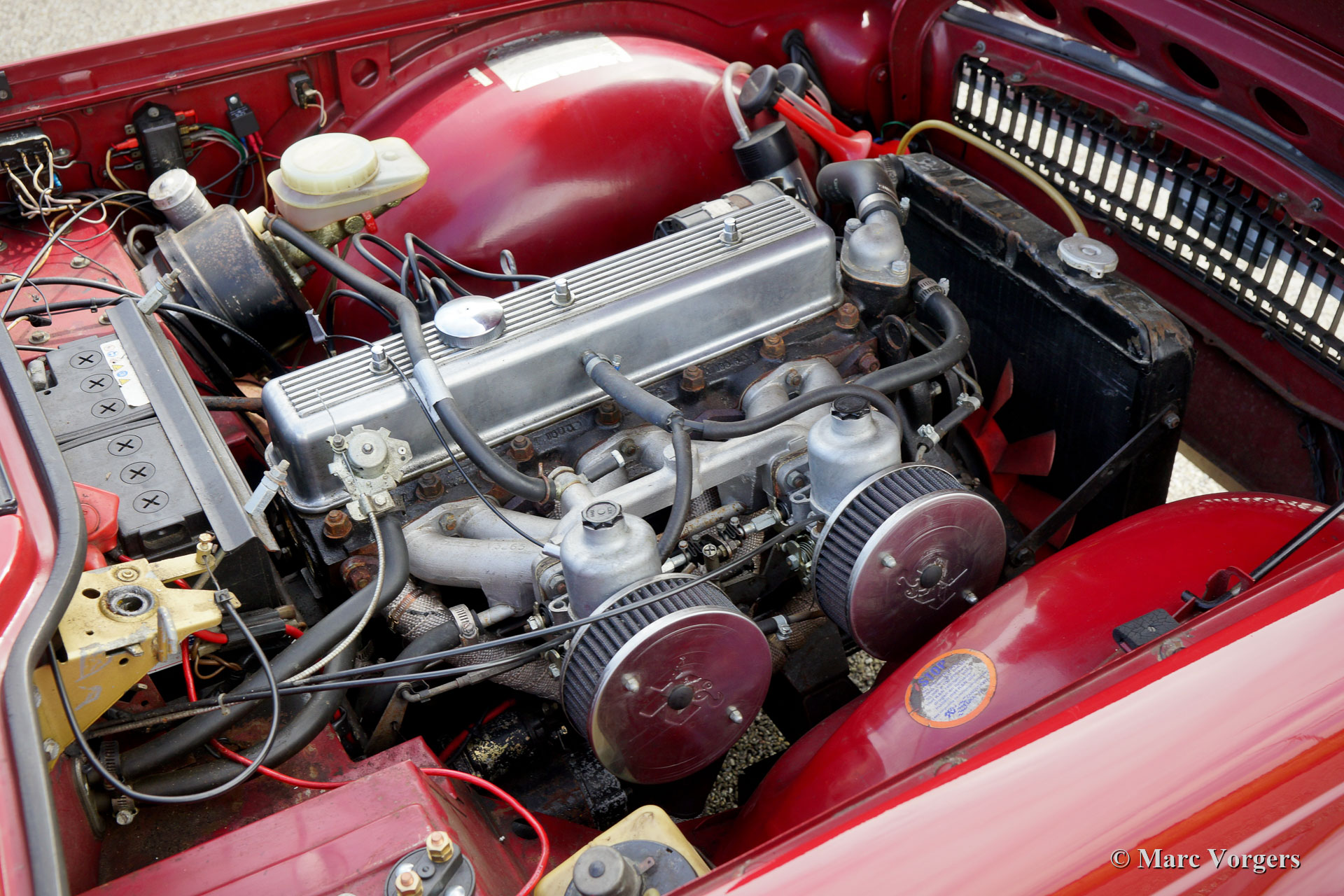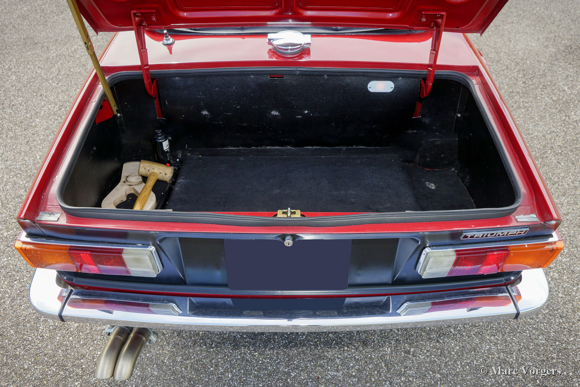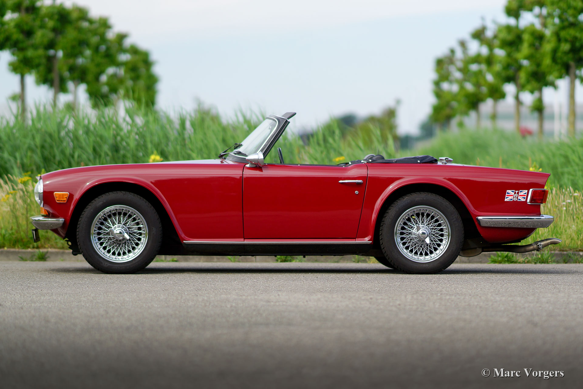 Triumph TR 6, jaar 1973. Kleur donkerrood (Carmine Red) gecombineerd met een zwartleren interieur en zwart tapijt. Zwarte vinyl soft-top en hood-cover. Deze fantastische Triumph TR 6 is nieuw verkocht in de USA. De auto verkeert in excellente rijdersconditie met slechts een paar sporen van normaal gebruik. De auto rijdt en klinkt perfect! De carburateurmotor is gemodificeerd naar ‘Fast-road’-specificaties met een hogere compressieverhouding, S.U.-carburateurs en een ‘Fast-road”-nokkenas. Deze TR 6 uitgerust met overdrive, elektronische ontsteking, verchroomde spaakwielen en een dashboard met walnootfineer. De Triumph TR 6 is de laatste in de legendarische rij van ‘Hairy-Chested’ Britse sportwagens!