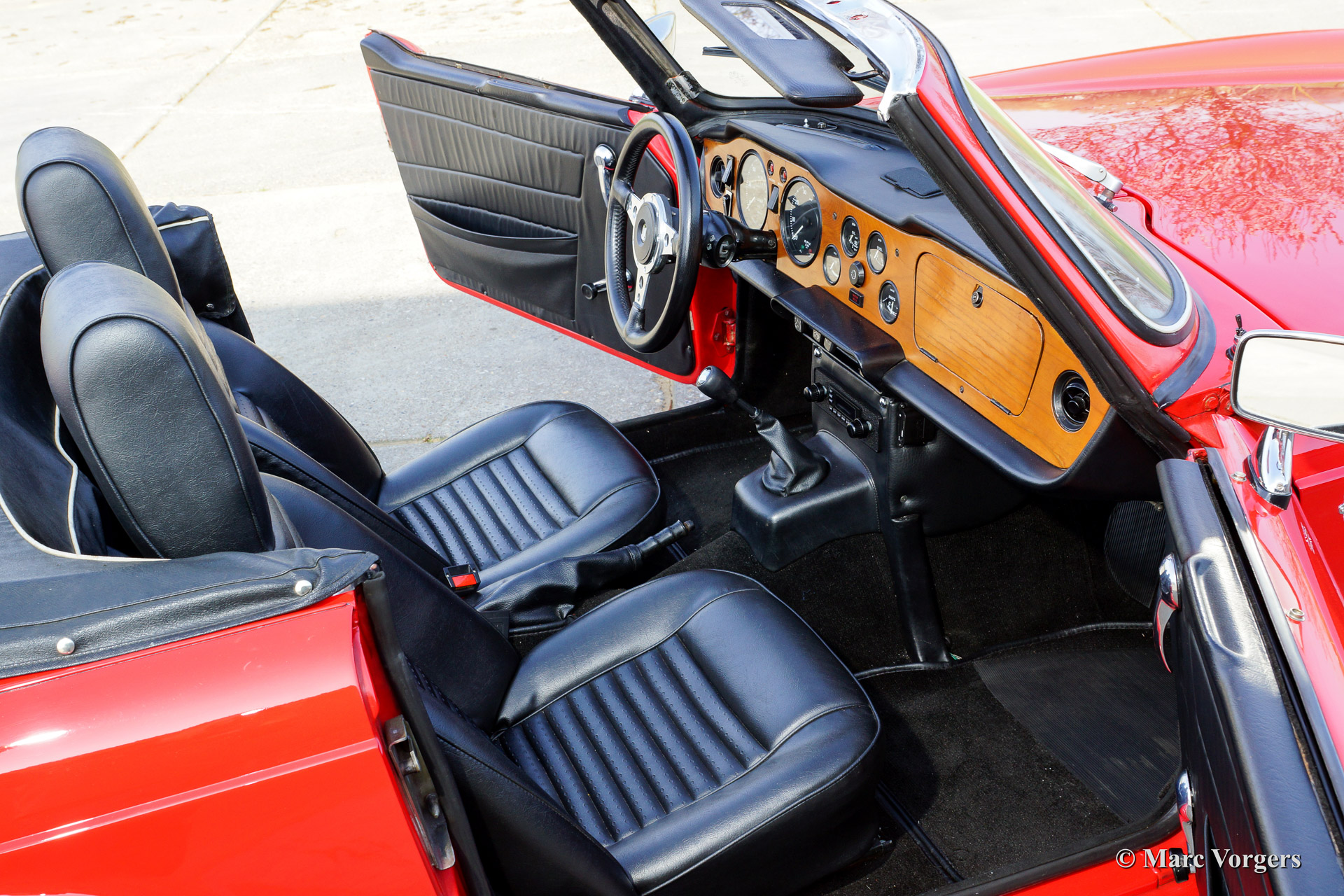 Triumph TR 6, model 1969, eerste registratie 1974. Kleur rood met een zwart lederen interieur en een zwarte soft top. Deze mannelijke Triumph TR 6 verkeert in sublieme topstaat en de auto rijdt geweldig! De motor werd 'fast road' getuned en voorzien van SU carburateurs en K&N sport luchtfilters. Verder is de auto uitgerust met overdrive, een RVS sport uitlaat en een chroom kofferrek.