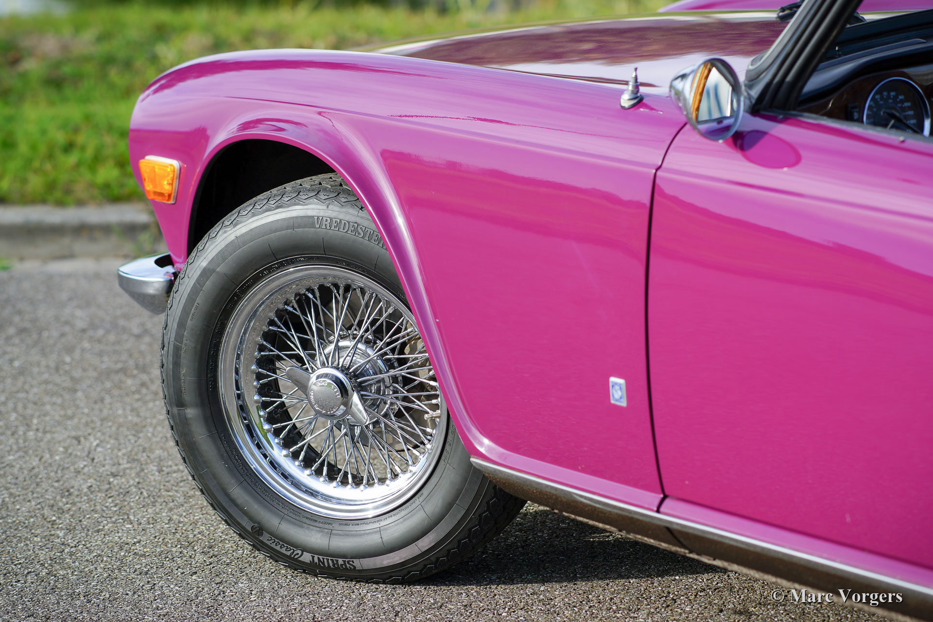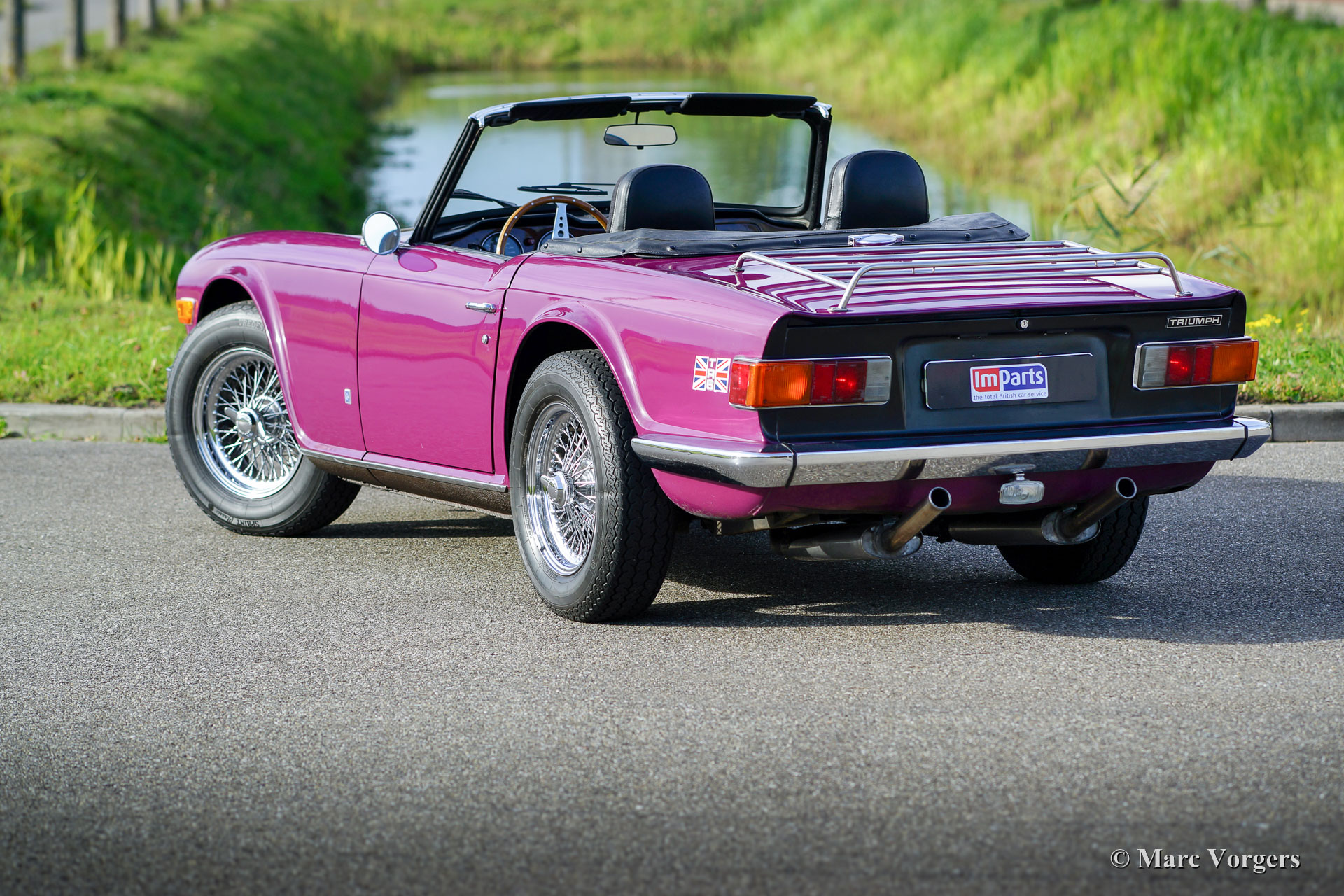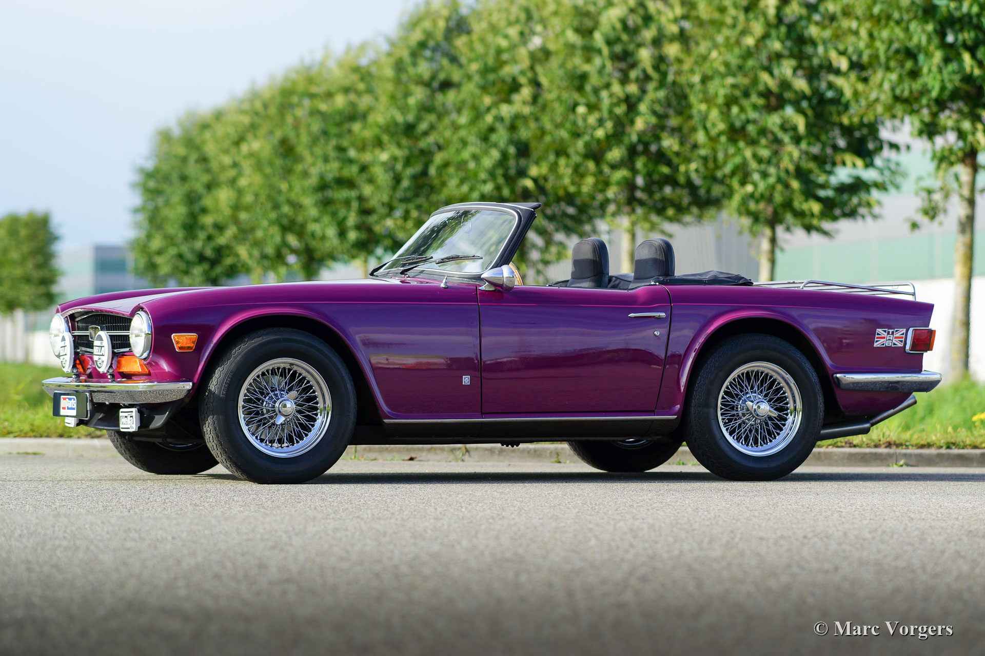 Triumph TR6, jaar 1974. Kleur magenta gecombineerd met een zwart interieur en een zwarte mohair soft-top. Deze Triumph heeft de meest extraverte Triumph-kleur uit de jaren 1970; je houdt ervan of je haat het, maar de stoere, door Karmann gestileerde, TR6 is een van de zeldzame modellen waarop Magenta het innerlijke karakter onderstreept! Deze fraaie Triumph TR6 verkeert in zeer goede staat en de auto is in de loop der jaren zeer goed onderhouden. De motor werd gereviseerd en uitgerust met twee S.U.-carburateurs en een aluminium kleppendeksel. Het roestvrijstalen uitlaatsysteem produceert een fantastisch zescilinder uitlaatgeluid! De sportstoelen met hoge rugleuningen en geïntegreerde hoofdsteunen zijn niet origineel, maar ze passen en zitten perfect. Verder is deze TR6 voorzien van overdrive, brede verchroomde spaakwielen (vorig jaar gemonteerd), extra Cibié mistlampen en vérstralers (met originele afdekkappen), een stuurwiel met houten rand, een walnoothouten dashboard, een armsteun met opbergruimte, veiligheidsgordels, een zwarte vinyl tonneau cover, 12V aansluiting op het dashboard en een verchroomd bagagerek op het kofferdeksel. Dit is een perfect rijdende en super complete Triumph TR6!