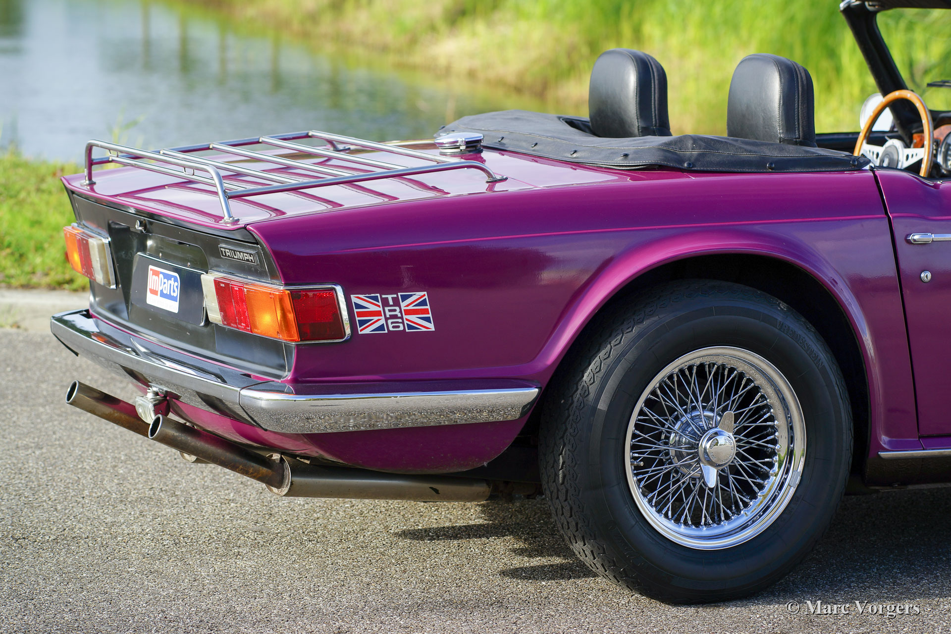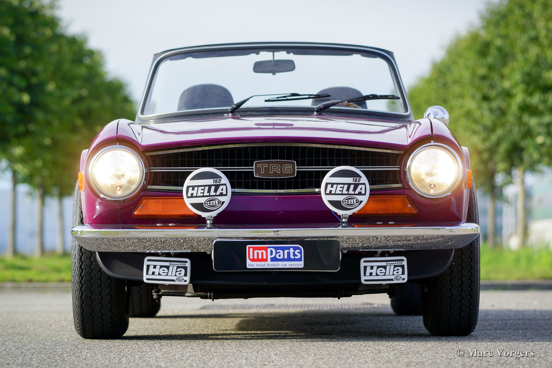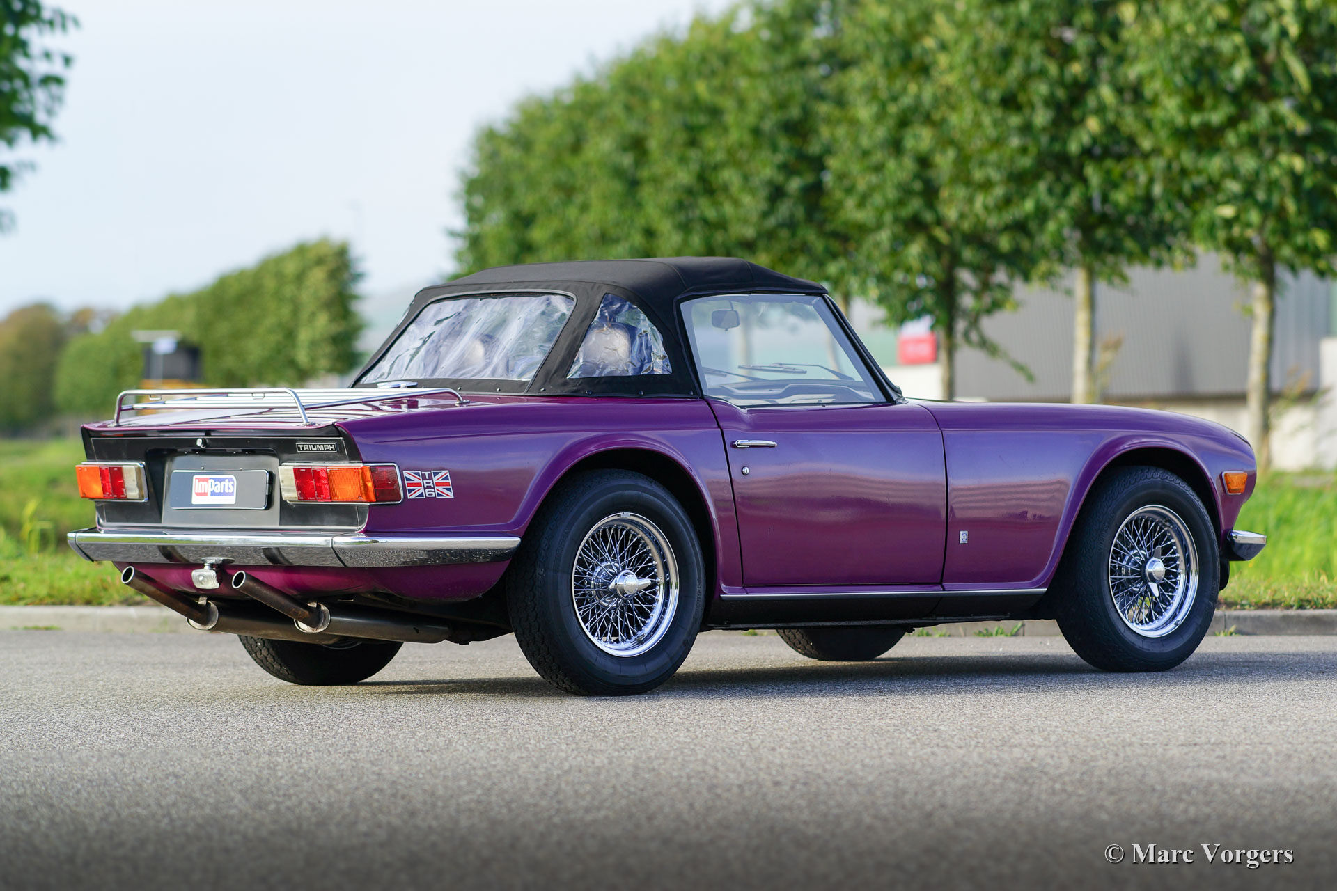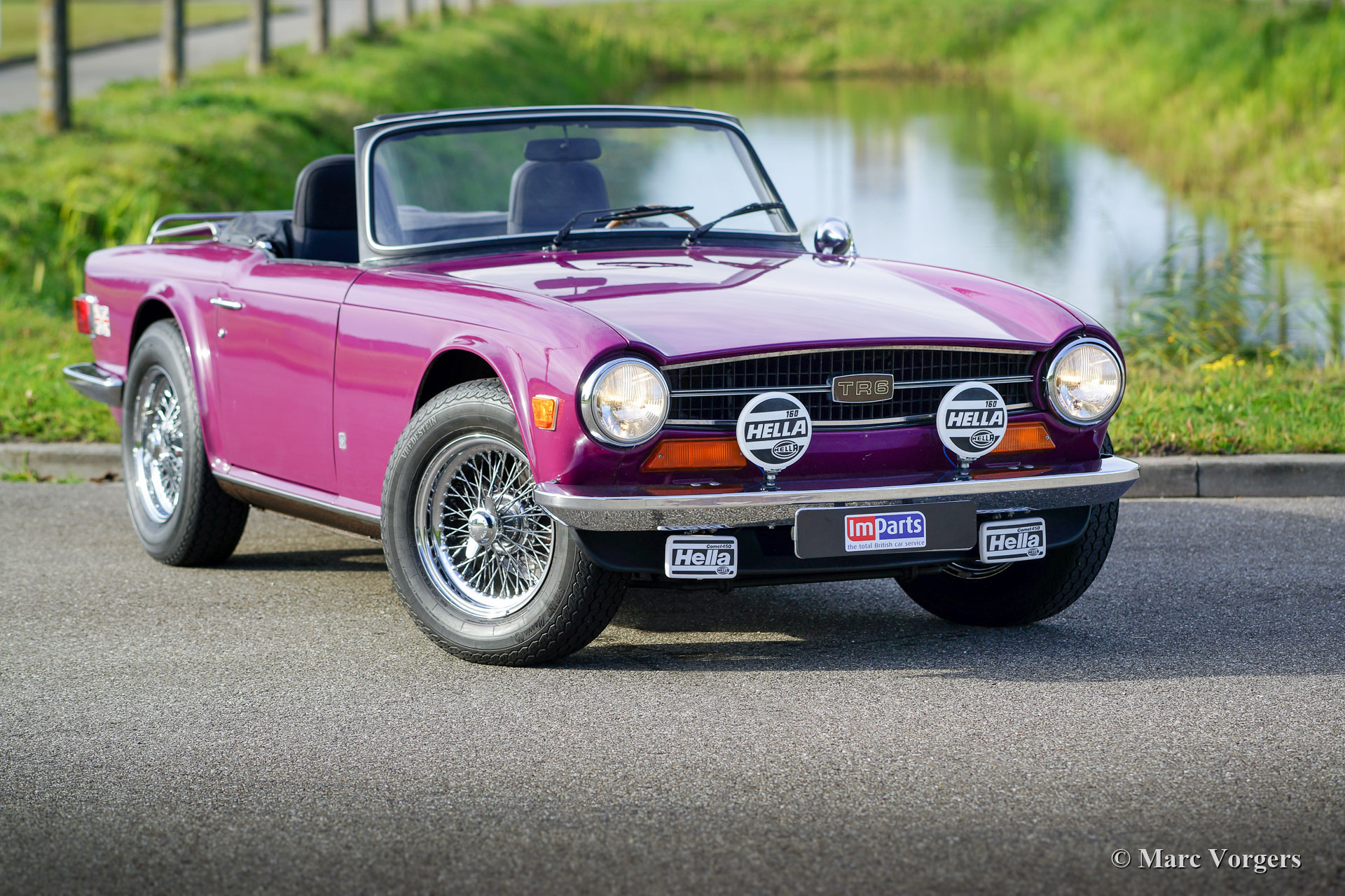 Triumph TR6, jaar 1974. Kleur magenta gecombineerd met een zwart interieur en een zwarte mohair soft-top. Deze Triumph heeft de meest extraverte Triumph-kleur uit de jaren 1970; je houdt ervan of je haat het, maar de stoere, door Karmann gestileerde, TR6 is een van de zeldzame modellen waarop Magenta het innerlijke karakter onderstreept! Deze fraaie Triumph TR6 verkeert in zeer goede staat en de auto is in de loop der jaren zeer goed onderhouden. De motor werd gereviseerd en uitgerust met twee S.U.-carburateurs en een aluminium kleppendeksel. Het roestvrijstalen uitlaatsysteem produceert een fantastisch zescilinder uitlaatgeluid! De sportstoelen met hoge rugleuningen en geïntegreerde hoofdsteunen zijn niet origineel, maar ze passen en zitten perfect. Verder is deze TR6 voorzien van overdrive, brede verchroomde spaakwielen (vorig jaar gemonteerd), extra Cibié mistlampen en vérstralers (met originele afdekkappen), een stuurwiel met houten rand, een walnoothouten dashboard, een armsteun met opbergruimte, veiligheidsgordels, een zwarte vinyl tonneau cover, 12V aansluiting op het dashboard en een verchroomd bagagerek op het kofferdeksel. Dit is een perfect rijdende en super complete Triumph TR6!