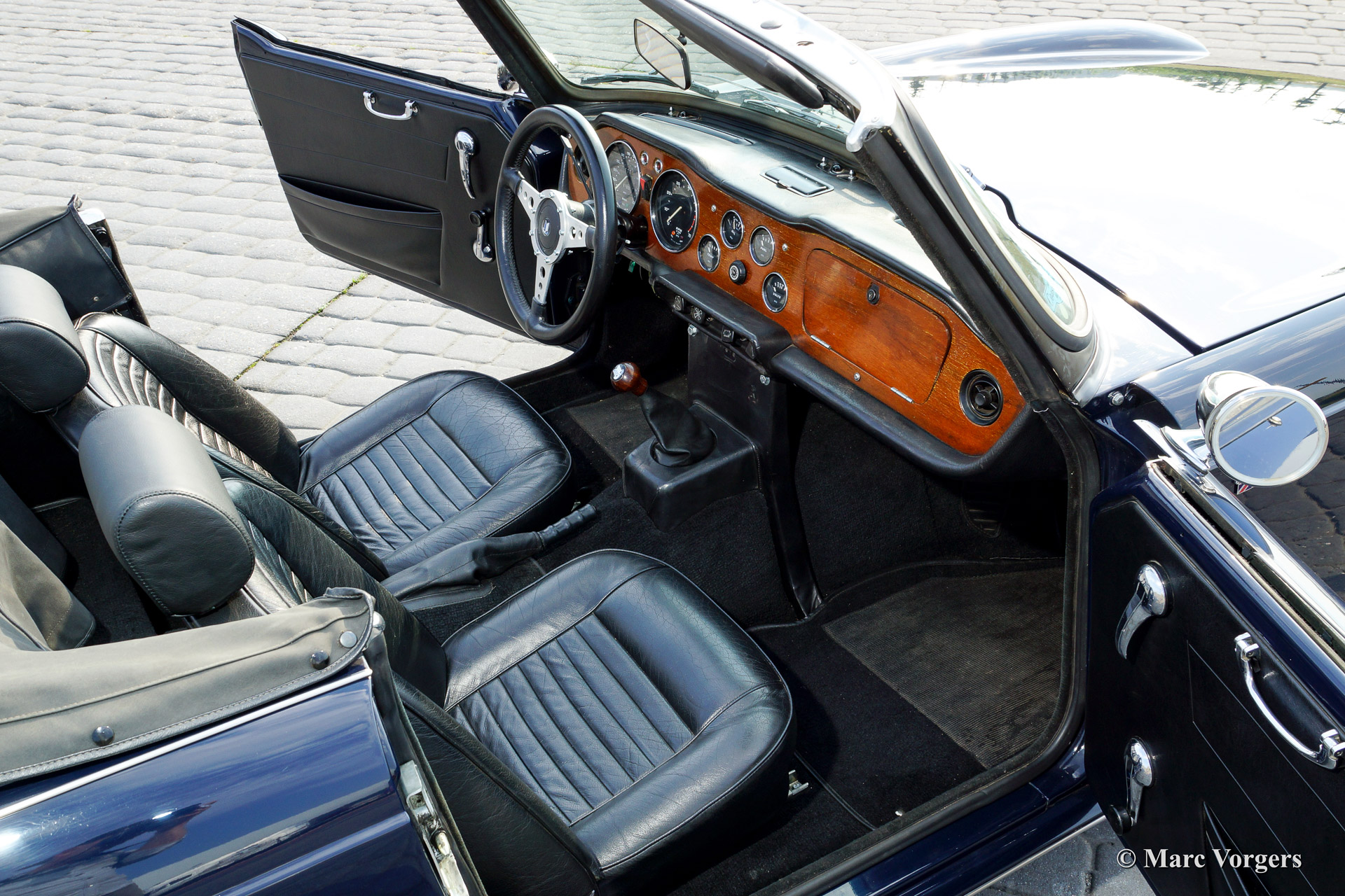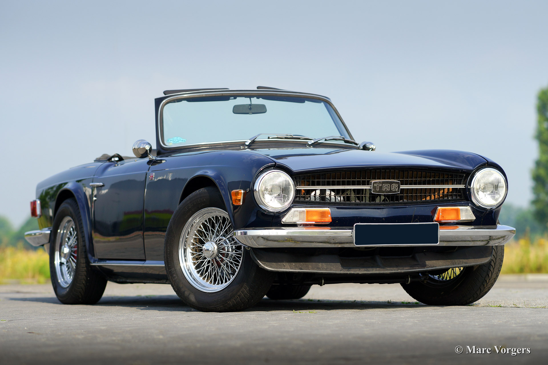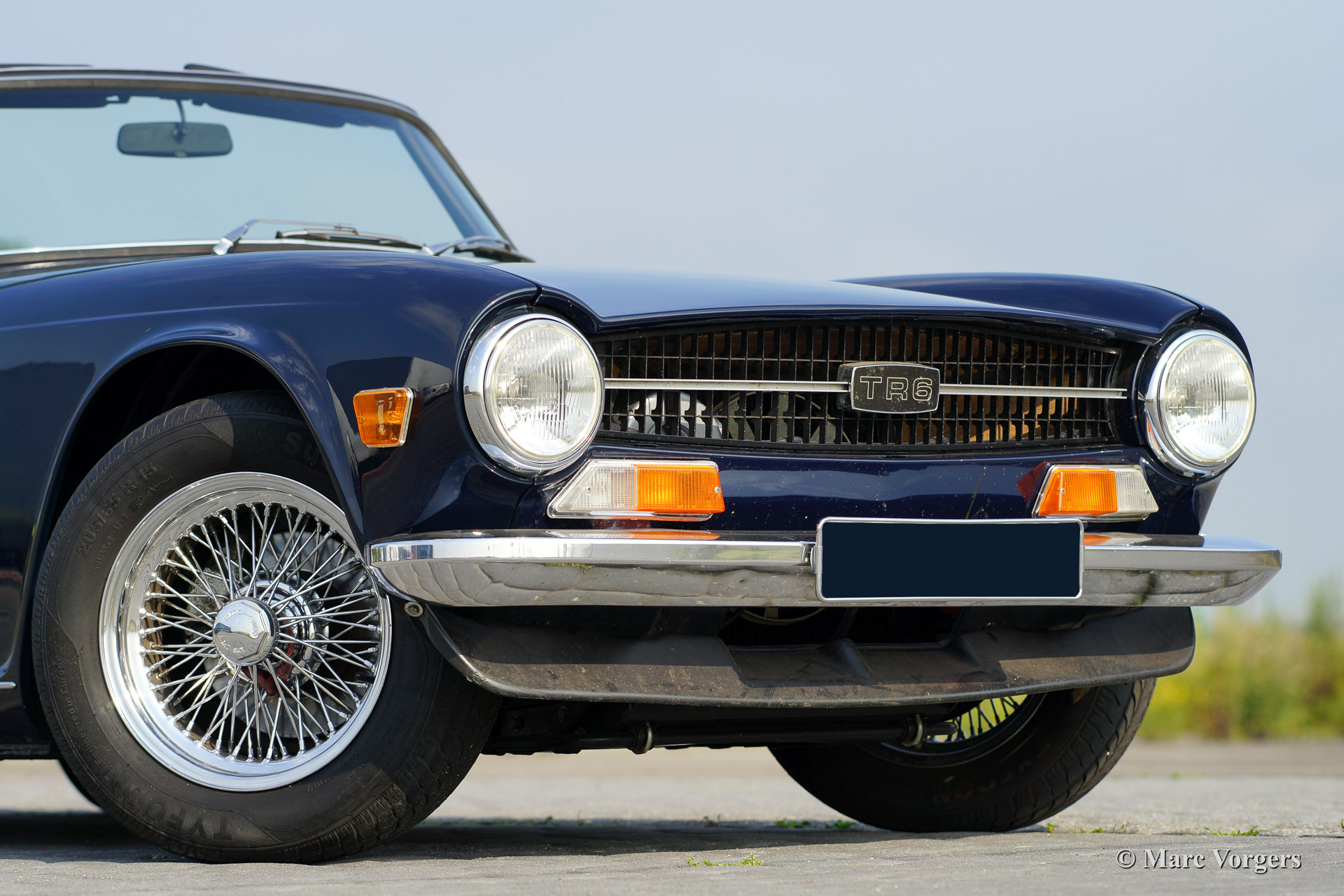 Triumph TR 6 PI, bouwjaar 1971. Kleur donkerblauw met een zwrt lederen interieur en een zwarte soft top. Deze fantastische Triumph TR 6 PI (Petrol Injection) verkeert in zeer goede staat. De auto is uitgerust met overdrive, een MotoLita sportstuur met lederen rand, brede chroom spaakwielen, een RVS uitlaat, aluminium kleppendeksel, polyurethaan bussen in de wielophanging, Koni schokdempers en een Bosch benzinepomp. Een geweldige roadster met een prachtig geluid.