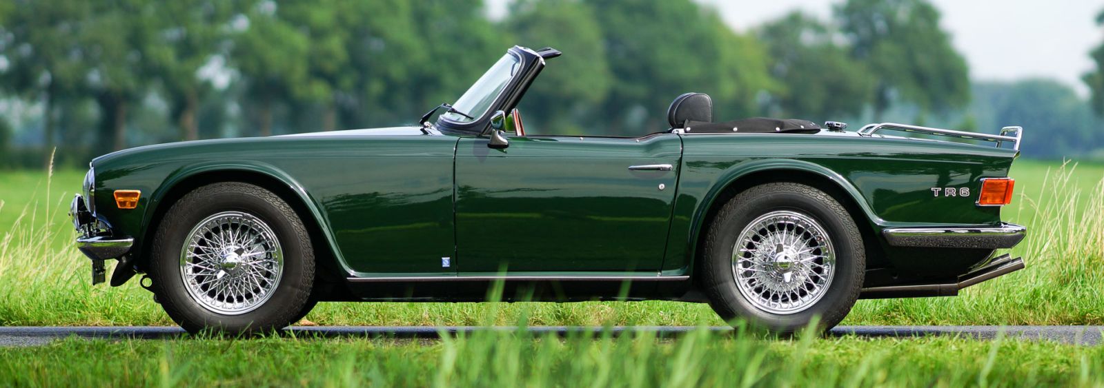 Triumph TR 6 PI, jaar 1974. Kleur British Racing Green met een zwartleren interieur en zwart tapijt. Zwarte mohair soft-top en hood-cover. Chassisnummer 1CR2196L7X. Het betreft een zeer zeldzame origineel Nederlandse TR 6 PI van het latere 124 pk. CR type. De auto is in Nederland naar perfectie gerestaureerd en gereviseerd, deze TR 6 PI verkeert in sublieme topstaat! De auto is voorzien van overdrive, chroom spaakwielen, extra vérstralers op de voorbumper en een fraai MotoLita sportstuur met houten rand. Een zeldzaam top-exemplaar!