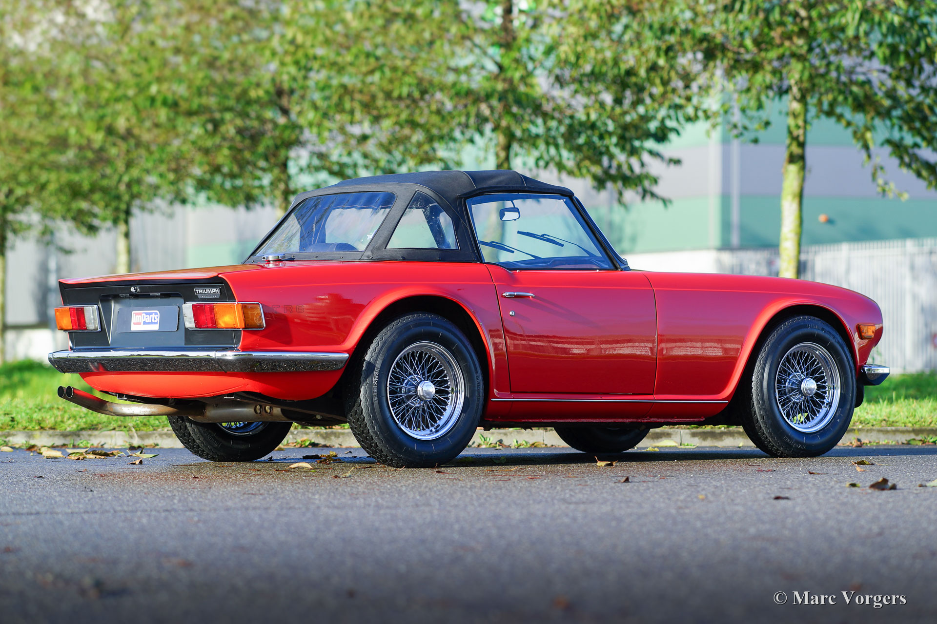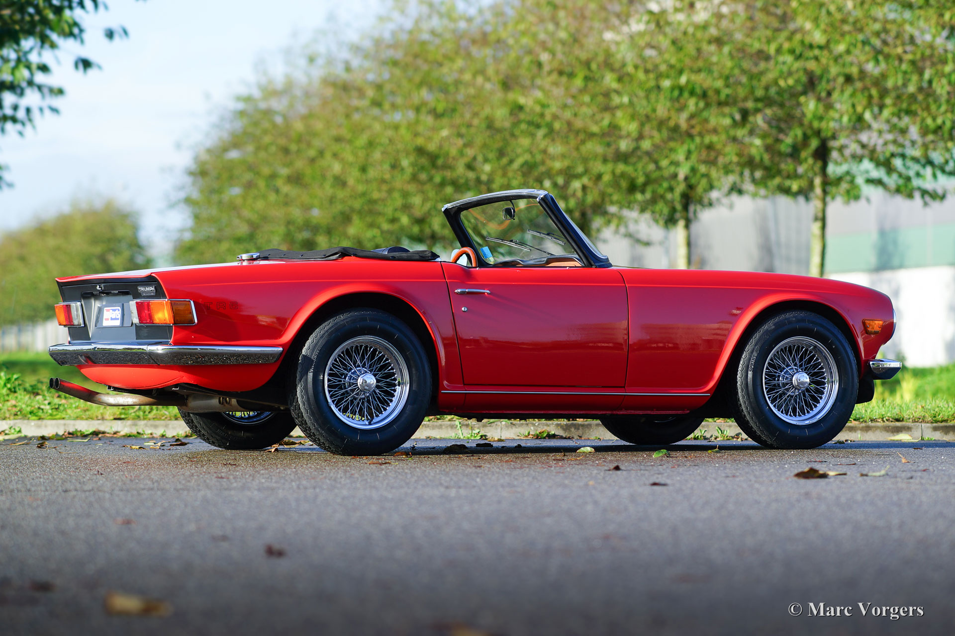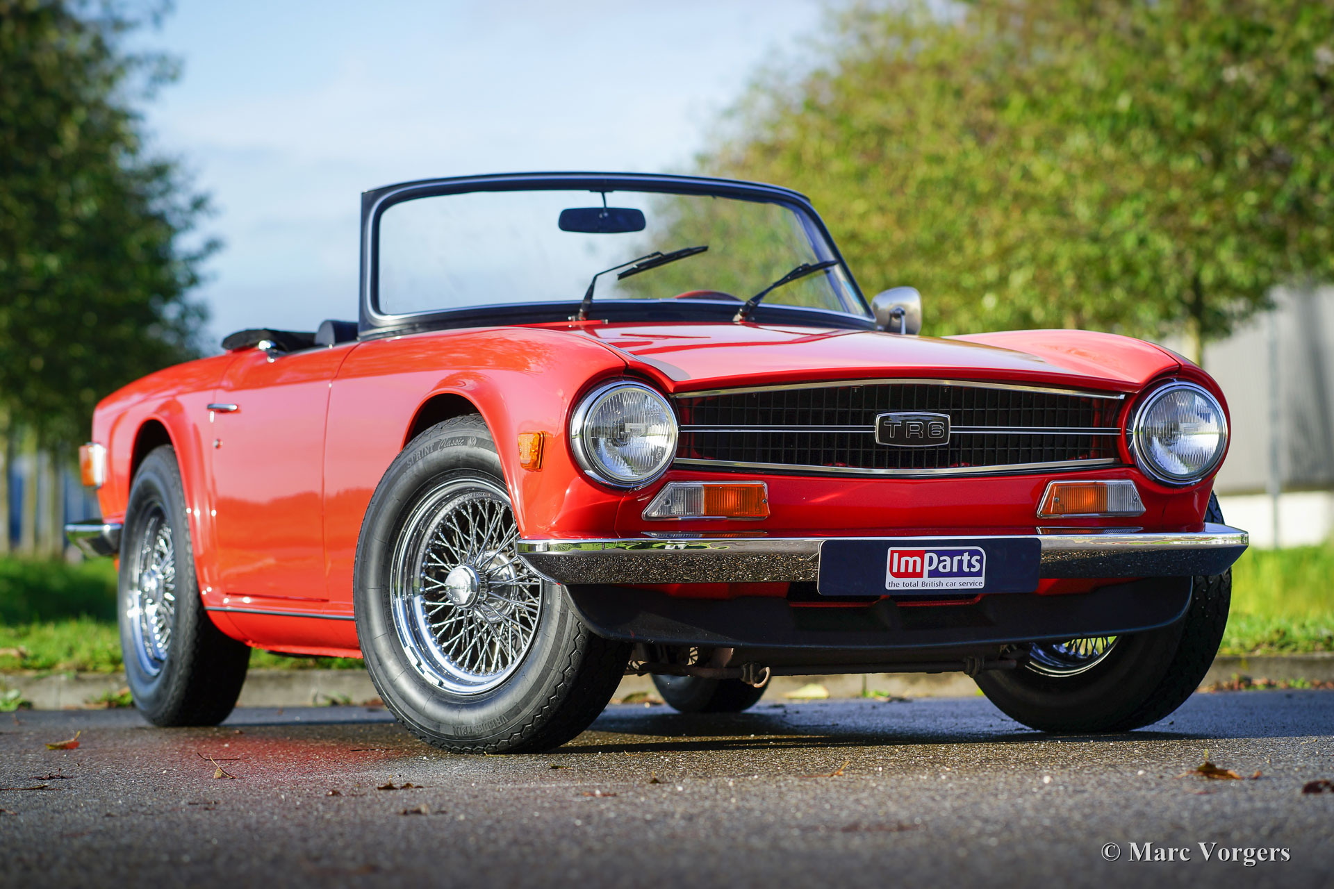 Triumph TR 6 PI, jaar 1974. Kleur rood (Pimento red) met een zwart kunstleren interieur en zwart tapijt. Zwarte vinyl soft-top met uitritsbare achterruit en een zwarte mohair hood-cover. Deze geweldige Triumph TR6 PI is een zogenaamd CKD model dat in 1974 in België werd geassembleerd en niet, zoals de meeste TR 6 modellen, in het Engelse Liverpool. In 1975 is de auto in Nederland geïmporteerd. Het betreft een late CR-serie PI (Petrol Injection) uitvoering met 128 pk. Het mechanische Lucas injectiesysteem functioneert uitstekend, de zescilindermotor loopt mooi stationair en deze TR 6 reageert bliksemsnel op het gaspedaal! Het injectiesysteem is voorzien van speciale K&N-luchtfilters waardoor de motor beter ‘ademt’ en nog beter klinkt! Deze Triumph TR 6 is een jaar geleden volledig nieuw gespoten in de originele kleur en weer perfect opgebouwd. In de loop der jaren is de auto uitstekend onderhouden en is het interieur grotendeels vernieuwd. Ook zijn de bumpers perfect nieuw verchroomd, zijn er brede chroom spaakwielen aangebracht en is er een rvs uitlaat gemonteerd. Deze TR 6 PI verkeert in zeer goede tot excellente staat en de auto rijdt geweldig!