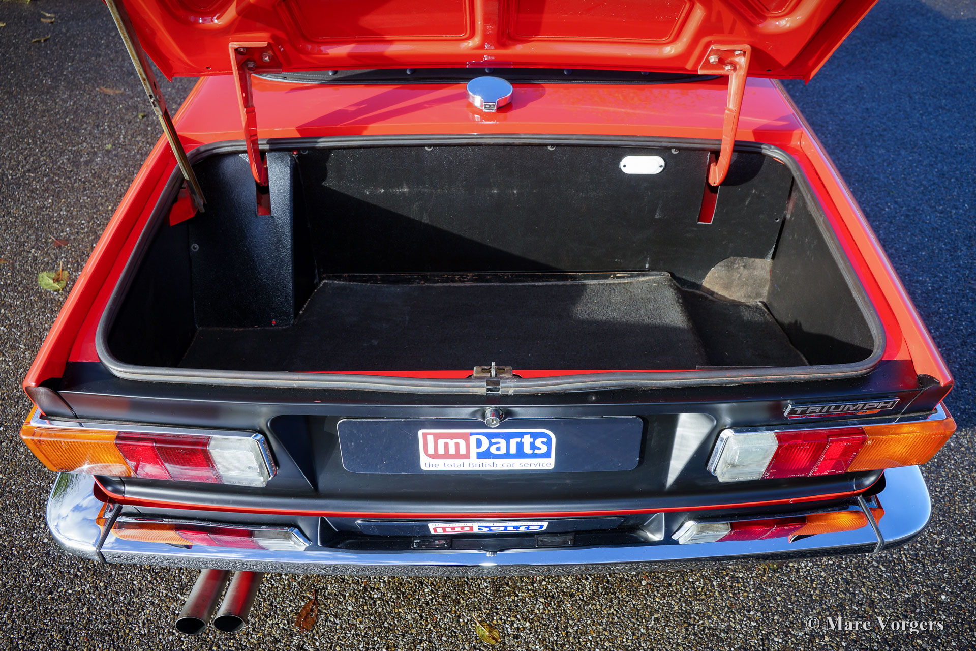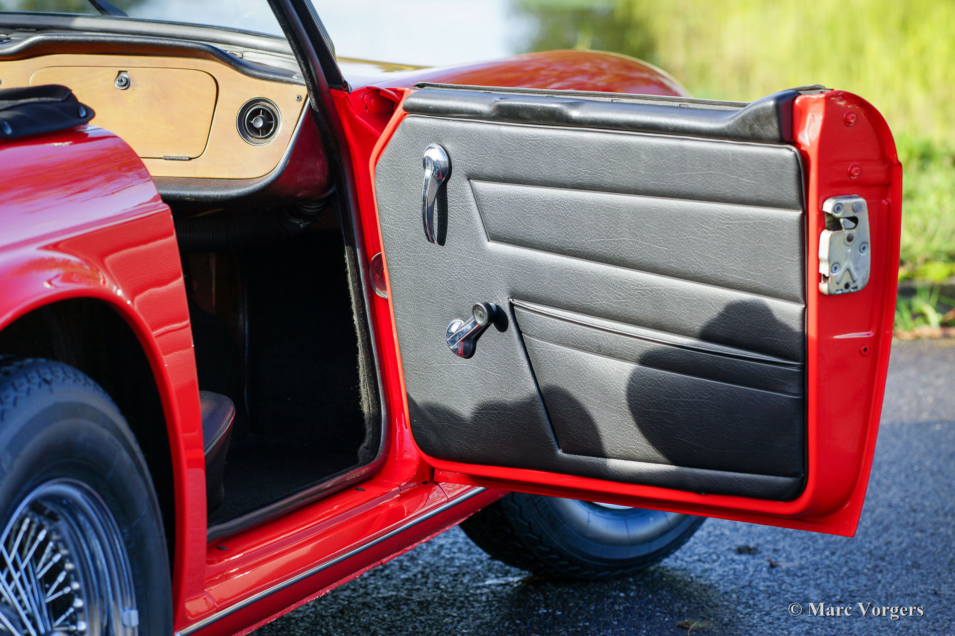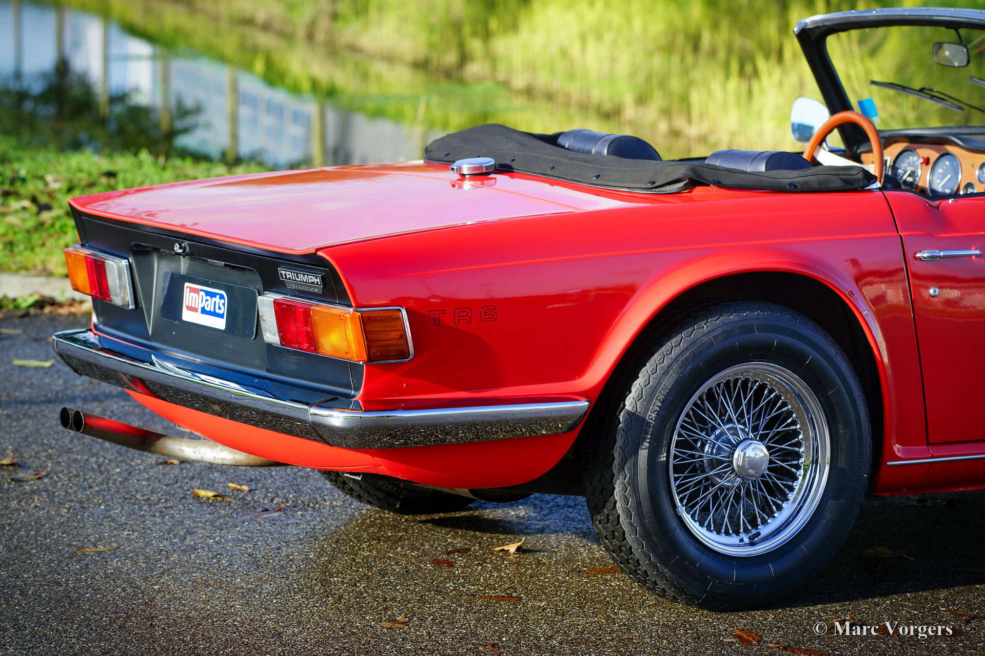 Triumph TR 6 PI, jaar 1974. Kleur rood (Pimento red) met een zwart kunstleren interieur en zwart tapijt. Zwarte vinyl soft-top met uitritsbare achterruit en een zwarte mohair hood-cover. Deze geweldige Triumph TR6 PI is een zogenaamd CKD model dat in 1974 in België werd geassembleerd en niet, zoals de meeste TR 6 modellen, in het Engelse Liverpool. In 1975 is de auto in Nederland geïmporteerd. Het betreft een late CR-serie PI (Petrol Injection) uitvoering met 128 pk. Het mechanische Lucas injectiesysteem functioneert uitstekend, de zescilindermotor loopt mooi stationair en deze TR 6 reageert bliksemsnel op het gaspedaal! Het injectiesysteem is voorzien van speciale K&N-luchtfilters waardoor de motor beter ‘ademt’ en nog beter klinkt! Deze Triumph TR 6 is een jaar geleden volledig nieuw gespoten in de originele kleur en weer perfect opgebouwd. In de loop der jaren is de auto uitstekend onderhouden en is het interieur grotendeels vernieuwd. Ook zijn de bumpers perfect nieuw verchroomd, zijn er brede chroom spaakwielen aangebracht en is er een rvs uitlaat gemonteerd. Deze TR 6 PI verkeert in zeer goede tot excellente staat en de auto rijdt geweldig!