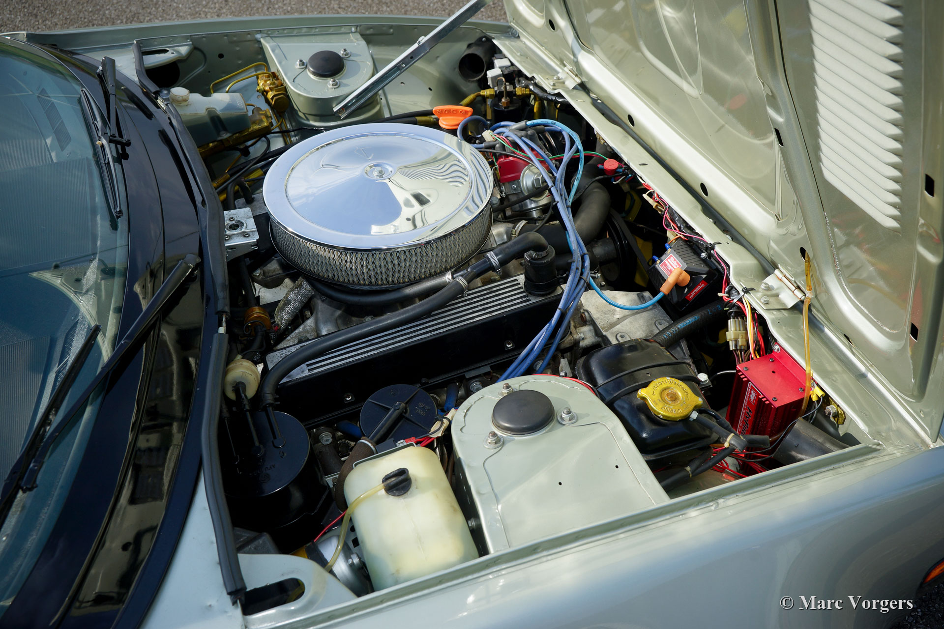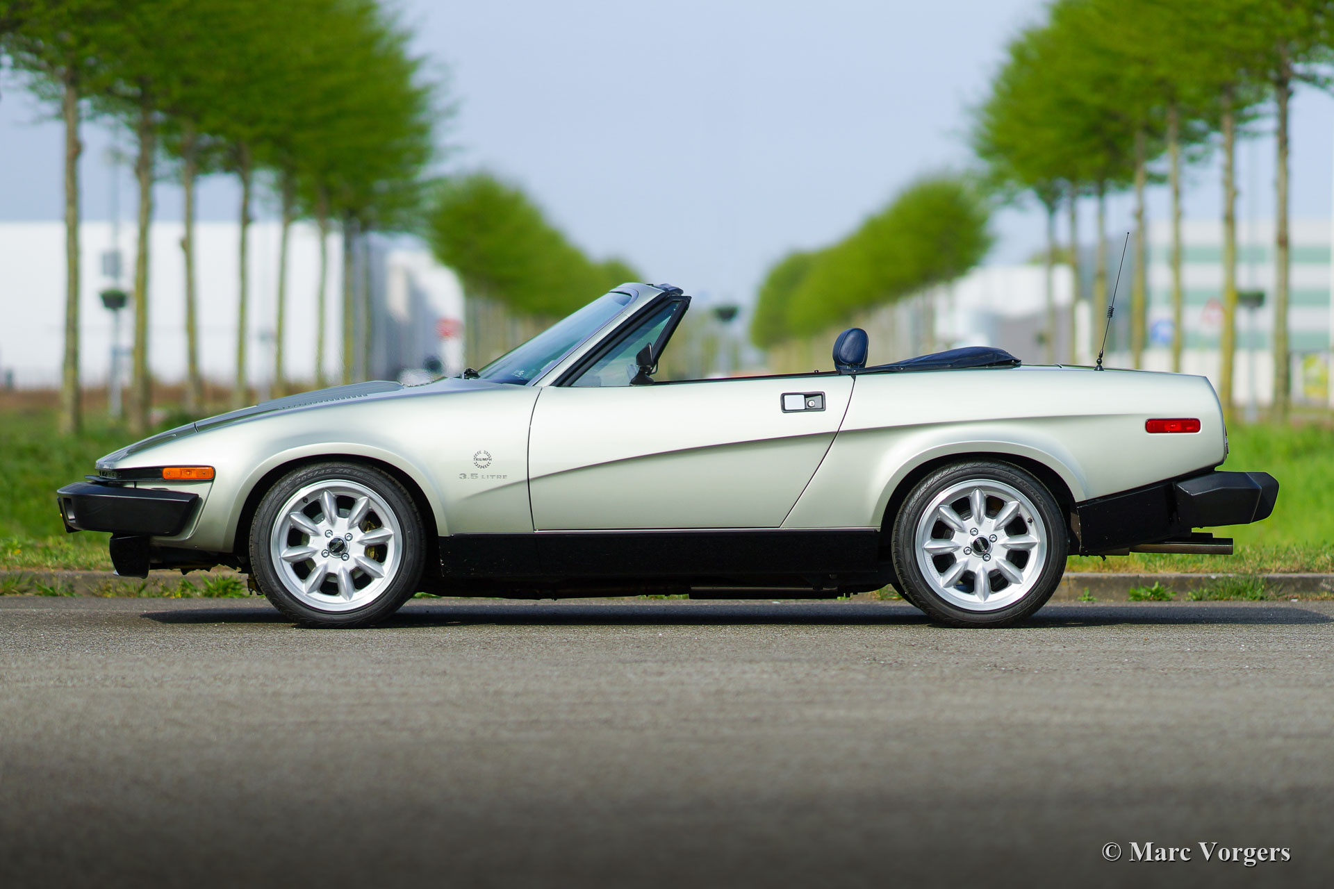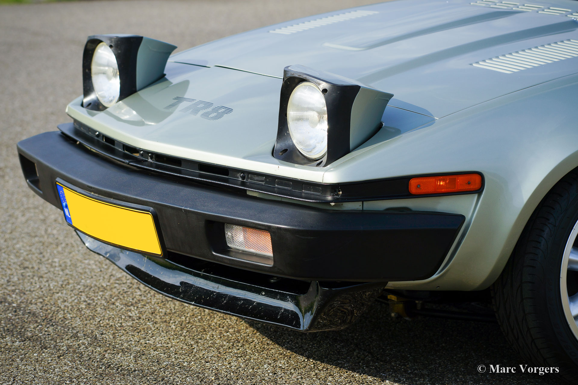 Triumph TR8, jaar 1980. Kleur ‘Cashmere Gold’ metallic (heel lichtgroen) gecombineerd met een blauw kunstleren interieur en blauw tapijt. De middenstukken van de stoelen en het midden van de deurpanelen zijn afgewerkt met geruite stof. De soft-top en de hood-cover zijn zwart. Deze fantastische Triumph TR8 werd nieuw verkocht in de VS, de auto werd in 1989 in Nederland geregistreerd. Sinds 19092 is de auto in het bezit van de huidige eigenaar! Het is duidelijk dat de auto zeer goed is onderhouden; deze TR8 verkeert in zeer goede tot excellente staat. Het originele interieur is in onberispelijke conditie en de motorruimte is zeer netjes. De 3,5 liter Rover V8 motor is getuned en voorzien van een Holley carburateur. In 2012 is de auto op de rollenbank afgesteld en werd er een vermogen vastgesteld van 225 pk. Sindsdien heeft de auto 10.000 kilometer gereden. Deze fraaie Triumph TR8 is uitgerust met een handgeschakelde vijfversnellingsbak, een sportstuur, het originele radio/ cassettesysteem, een dubbele uitlaatpijp en prachtige 16-inch lichtmetalen Panasport Racing-velgen met 205/45 banden. Deze fantastische Triumph TR8 rijdt en klinkt fantastisch!