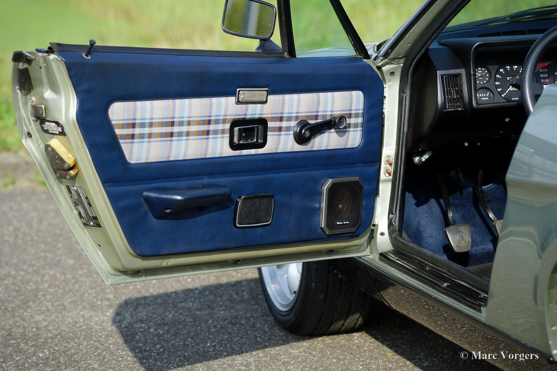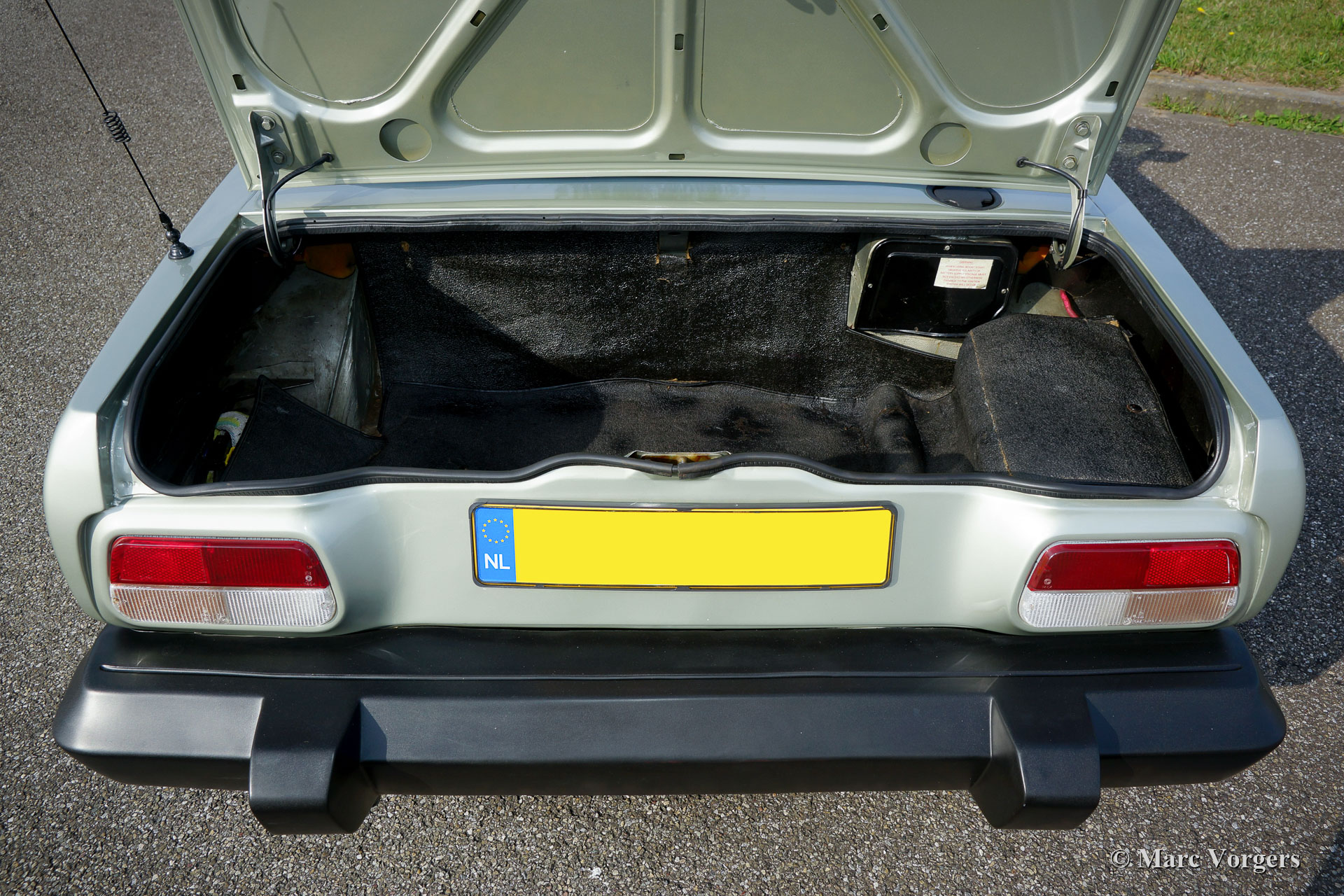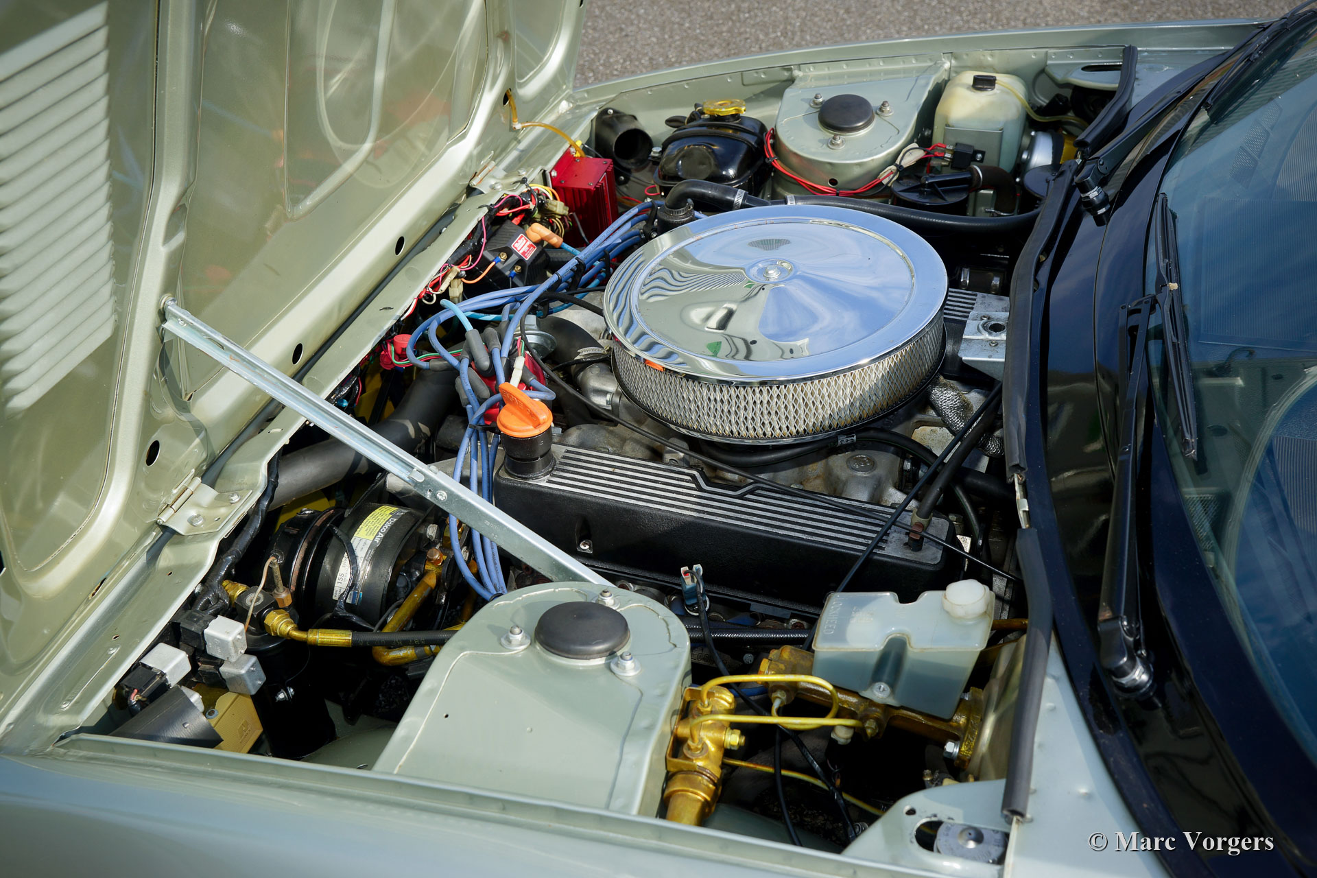 Triumph TR8, jaar 1980. Kleur ‘Cashmere Gold’ metallic (heel lichtgroen) gecombineerd met een blauw kunstleren interieur en blauw tapijt. De middenstukken van de stoelen en het midden van de deurpanelen zijn afgewerkt met geruite stof. De soft-top en de hood-cover zijn zwart. Deze fantastische Triumph TR8 werd nieuw verkocht in de VS, de auto werd in 1989 in Nederland geregistreerd. Sinds 19092 is de auto in het bezit van de huidige eigenaar! Het is duidelijk dat de auto zeer goed is onderhouden; deze TR8 verkeert in zeer goede tot excellente staat. Het originele interieur is in onberispelijke conditie en de motorruimte is zeer netjes. De 3,5 liter Rover V8 motor is getuned en voorzien van een Holley carburateur. In 2012 is de auto op de rollenbank afgesteld en werd er een vermogen vastgesteld van 225 pk. Sindsdien heeft de auto 10.000 kilometer gereden. Deze fraaie Triumph TR8 is uitgerust met een handgeschakelde vijfversnellingsbak, een sportstuur, het originele radio/ cassettesysteem, een dubbele uitlaatpijp en prachtige 16-inch lichtmetalen Panasport Racing-velgen met 205/45 banden. Deze fantastische Triumph TR8 rijdt en klinkt fantastisch!
