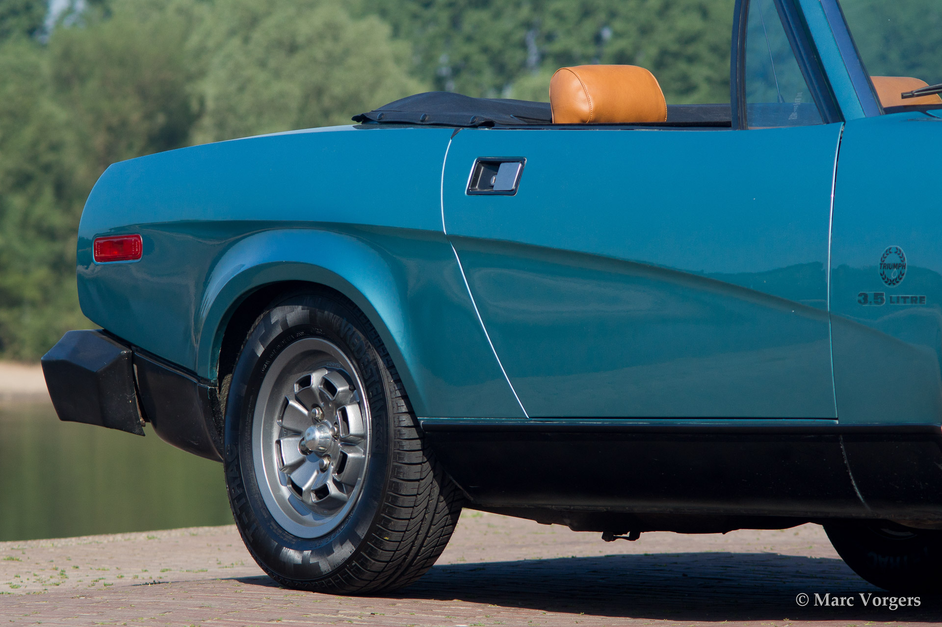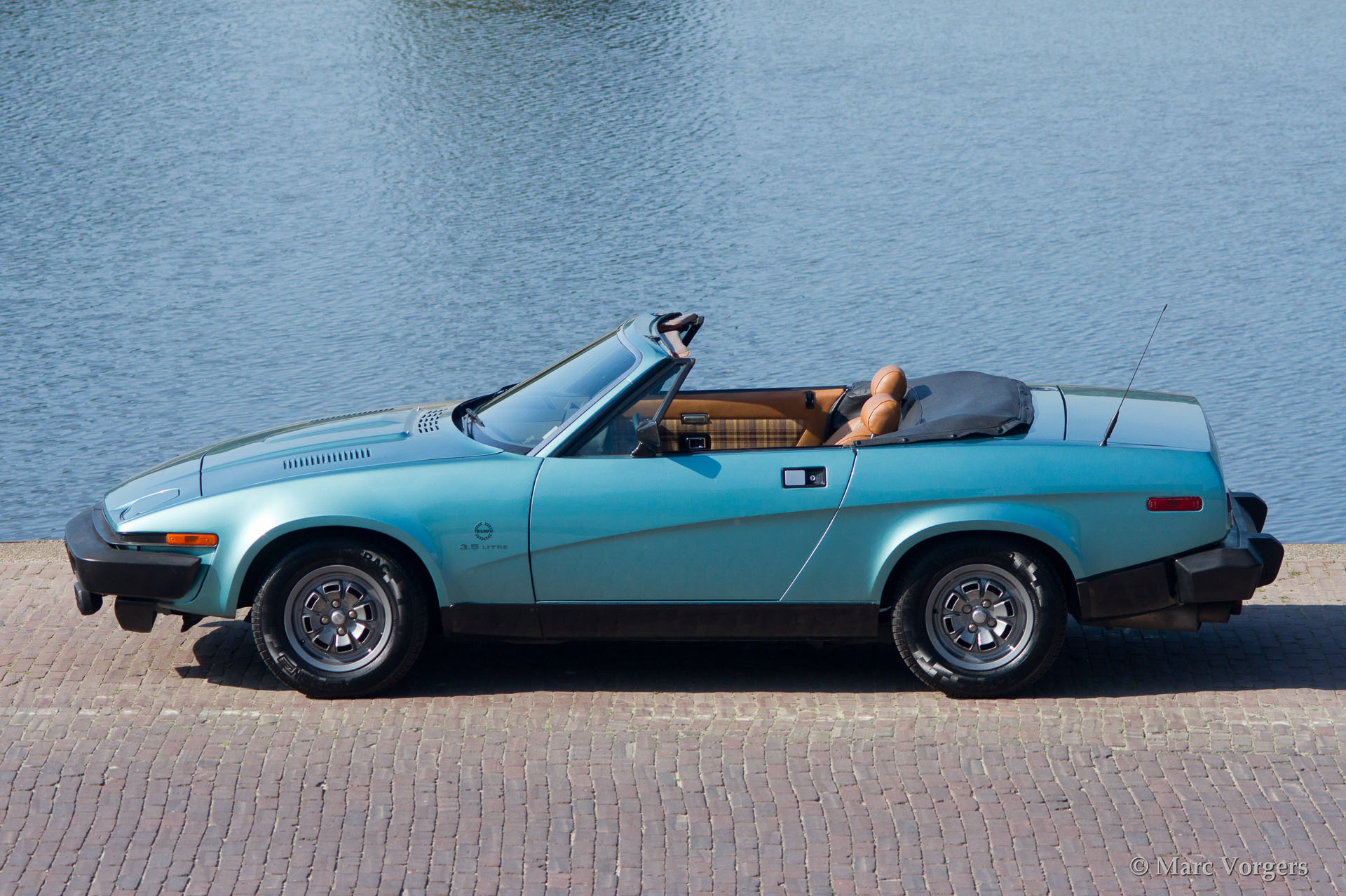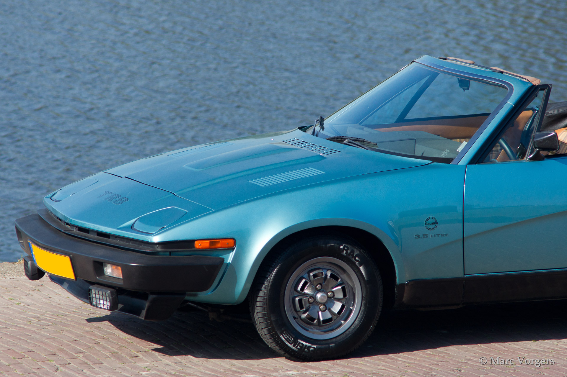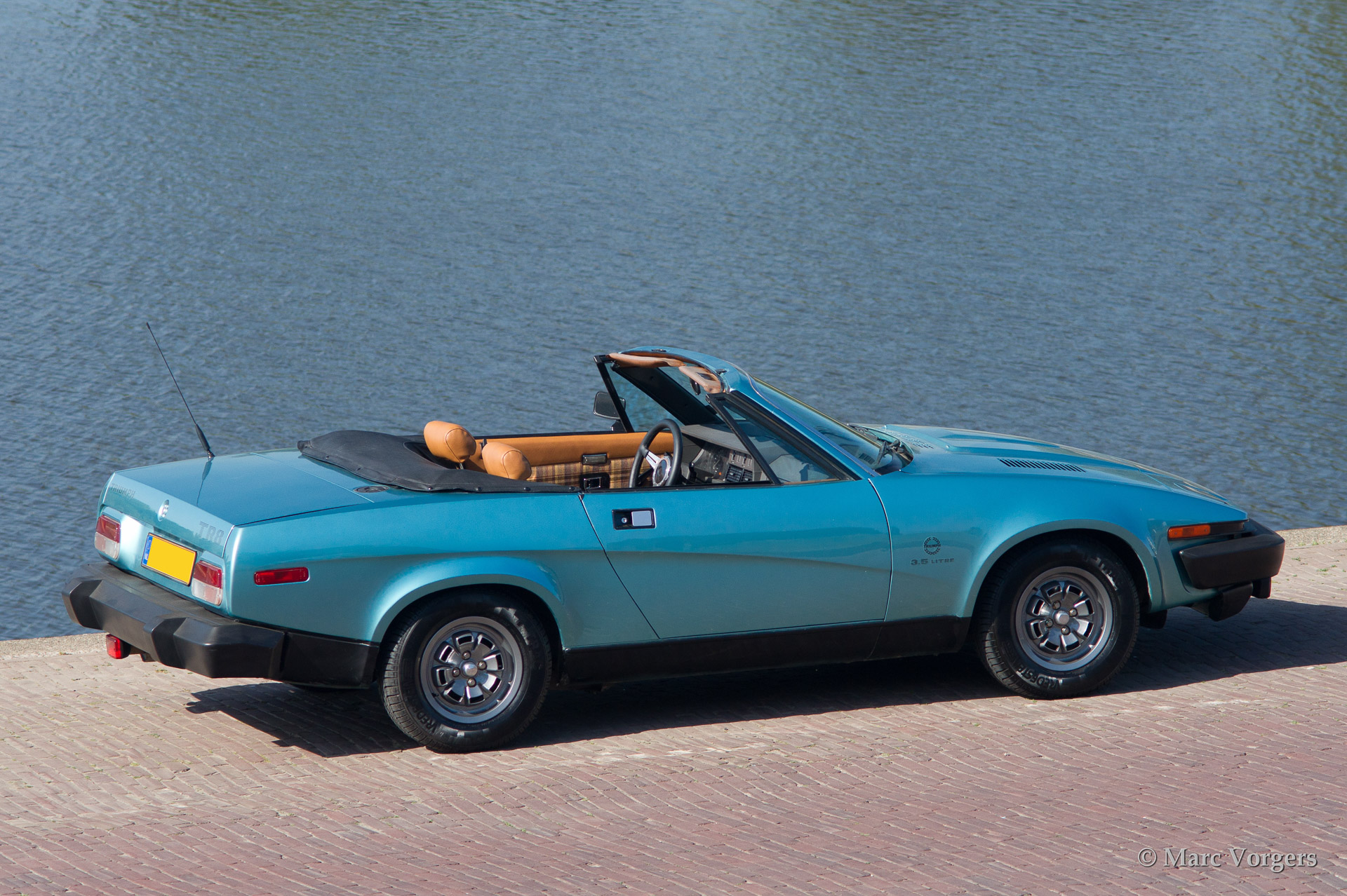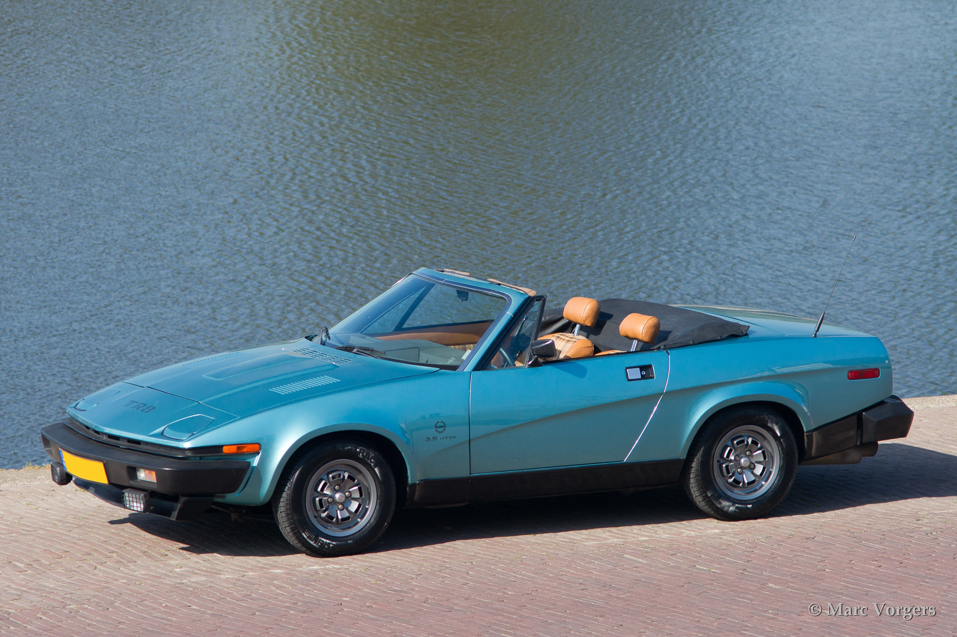 Triumph TR 8, bouwjaar 1980. Kleur blauw metallic met een beige interieur. Zwarte mohair soft top. Deze geweldige Triumph TR 8 verkeert in excellente originele staat en de auto rijdt fantastisch. Een aantal jaren geleden werd de auto perfect nieuw gespoten in de originele kleur. De originele TR8 lichtmetalen wielen zijn gepoedercoat en de krachtige 3500 V8 motor is voorzien van een Edelbrock/Holley inlaatspruitstuk/carburateur modificatie. Het zal vrij lastig zijn een betere en mooiere Triumph TR 8 te vinden! Een bijzonder fijne rijdersauto met een verslavend motorgeluid!