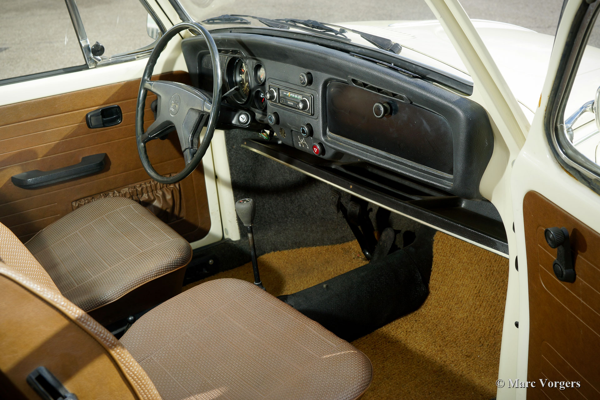 Volkswagen ‘Kever’ 1300 L, jaar 1974. Kleur crème wit gecombineerd met een bruin vinyl interieur. Deze prachtige VW ‘Kever’ wordt sinds 1984 gekoesterd door één eigenaar! Deze Volkswagen bevindt zich in een uitstekende conditie en de auto rijdt perfect. De luchtgekoelde 1300 cc-motor werd drie jaar geleden vervangen door een volledig gereviseerde 1600 cc-motor. De auto heeft sindsdien ongeveer 4000 kilometer gereden. De Volkswagen ‘Kever’ is een icoon; wie heeft er geen mooie herinneringen aan?