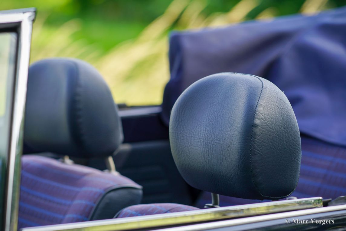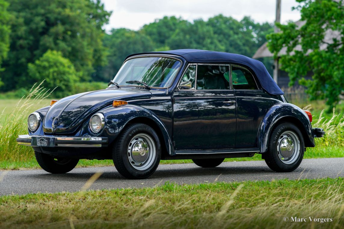 Volkswagen Kever 1303 cabriolet, jaar 1978. Kleur donkerblauw gecombineerd met een blauw interieur. Blauwe vinyl stoelen met stoffen zittingen, blauwe vinyl deurbekleding en blauw tapijt. Donkerblauwe mohair cabrioletkap en kapafdekking. Deze fantastische door Karmann gebouwde VW Kever cabriolet is in 1993 naar Nederland geïmporteerd. De automobiel verkeert in een excellente en super originele staat! De auto is in het verleden professioneel en perfect opnieuw gespoten. De carrosserie is in uitstekende staat, de chromen sierlijsten zijn prachtig en het originele interieur is geweldig! De Volkswagen Kever Cabriolet is een icoon in de automobielgeschiedenis. De auto biedt plaats aan 4 tot 5 personen en biedt heel veel rijplezier! De VW Kever wordt aangedreven door een achterin gemonteerde viercilinder luchtgekoelde boxermotor met een geweldige soundtrack! Het vermogen wordt via een handgeschakelde versnellingsbak met 4 versnellingen op de achterwielen overgebracht. Deze prachtige VW Kever cabriolet toont alle originele details, zoals het stuur met ‘Wolfsburg logo’ en de stalen velgen met chromen wieldoppen. De auto is voorzien van een Becker Europa radio met FM en een alarmsysteem. Deze begeerlijke schoonheid is klaar om afgeleverd te worden aan een trotse nieuwe eigenaar! Geniet van de stijlvolle klassieke levensstijl!