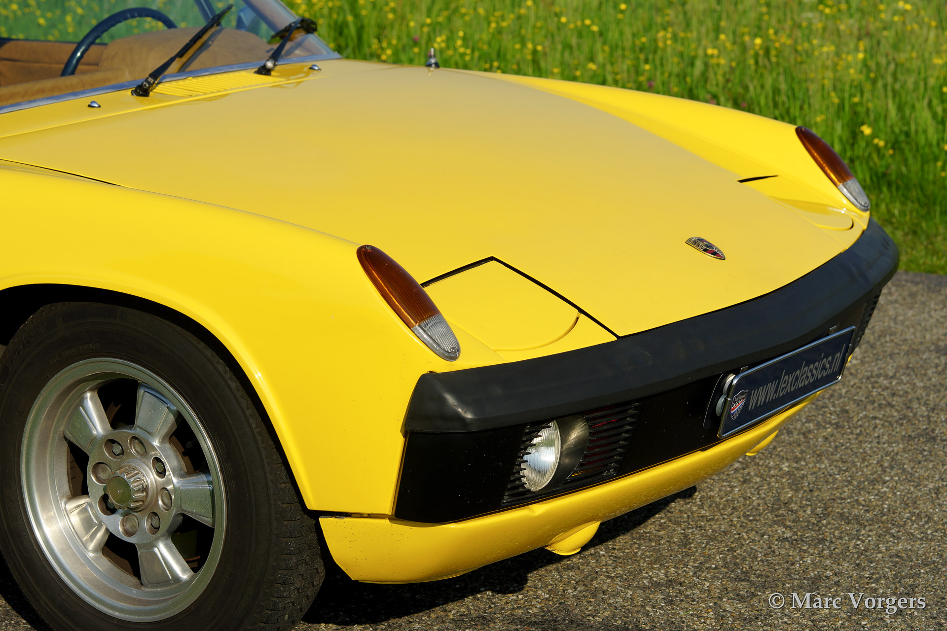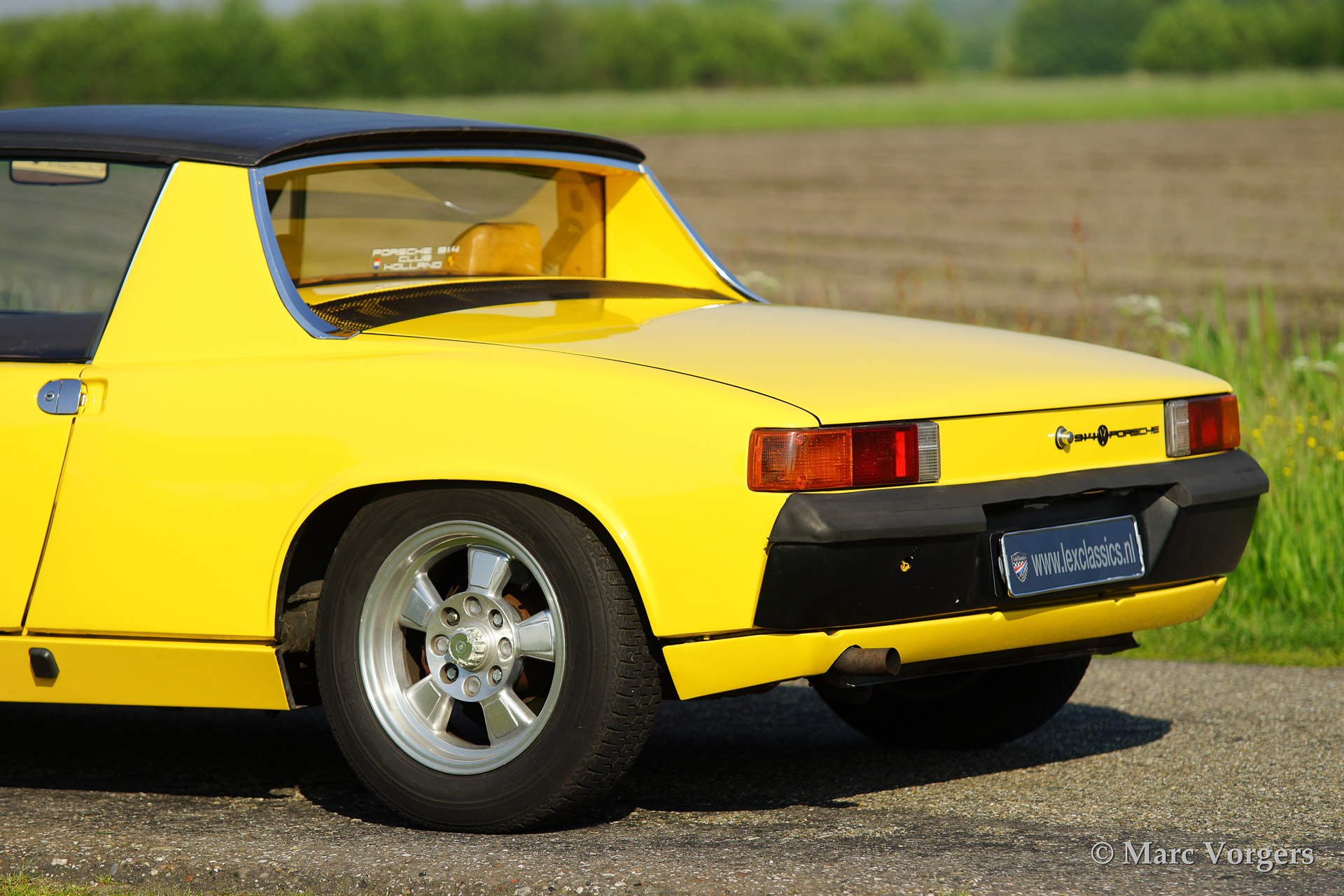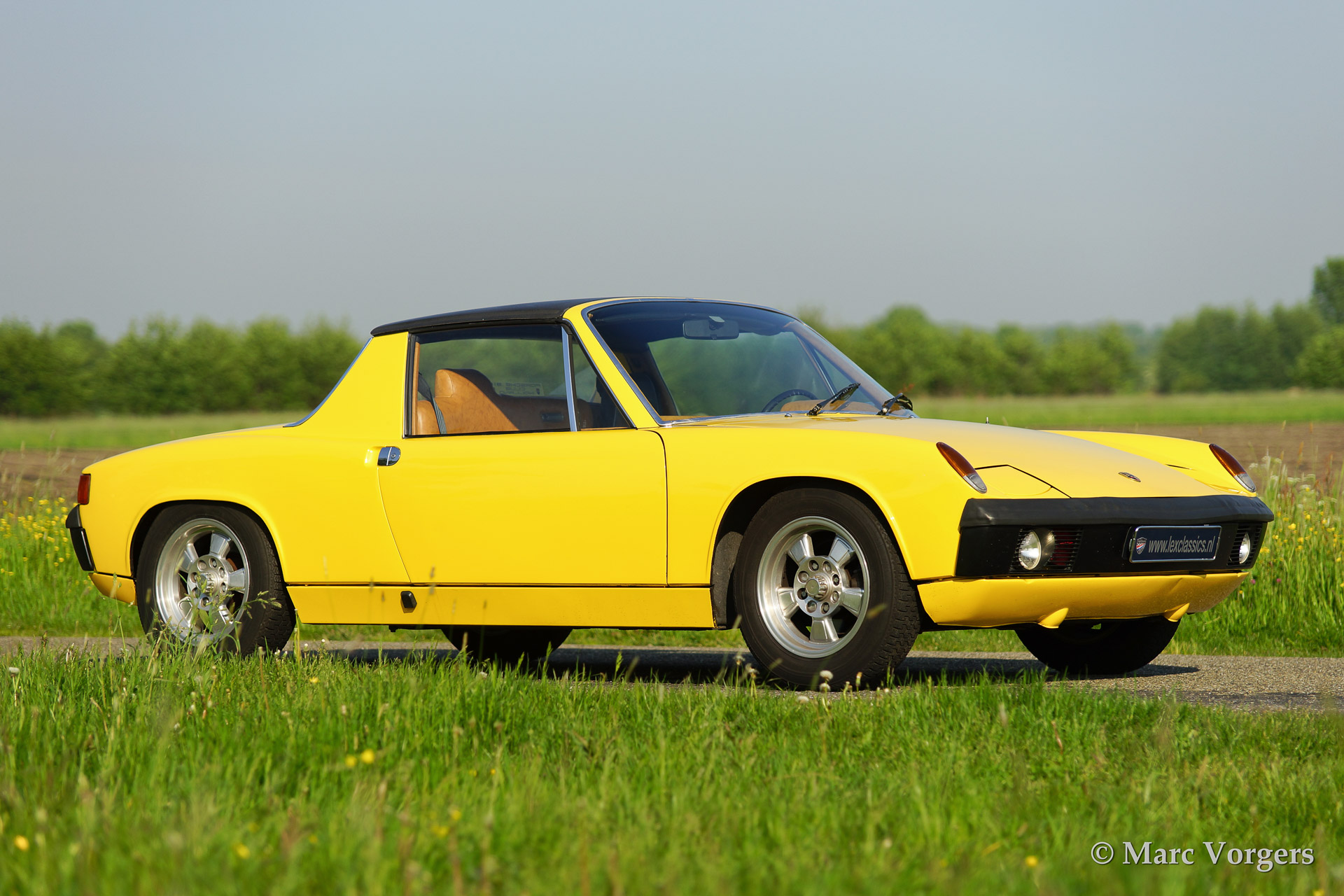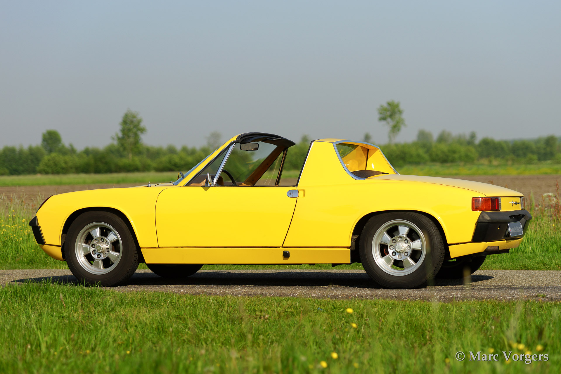 VW-Porsche 914 1.7L, bouwjaar 1970. Kleur geel met een beige/zwart/grijs interieur. Deze VW-Porsche 914 werd uitvoerig gerestaureerd. Het originele zwarte interieur werd door de eigenaar verfraaid met beige kunstlederen bekleding op het dashboard en op de deurpanelen - niet origineel dus. Een bijzonder kenmerk van de 914 is het afneembare dakpaneel dat opgeborgen kan worden in de achterste bagageruimte. Voor bagage is er dan nog genoeg ruimte in de voorste kofferbak! Deze VW-Porsche 914 is voorzien van lichtmetalen wielen, mostlampen en van een autoradio.