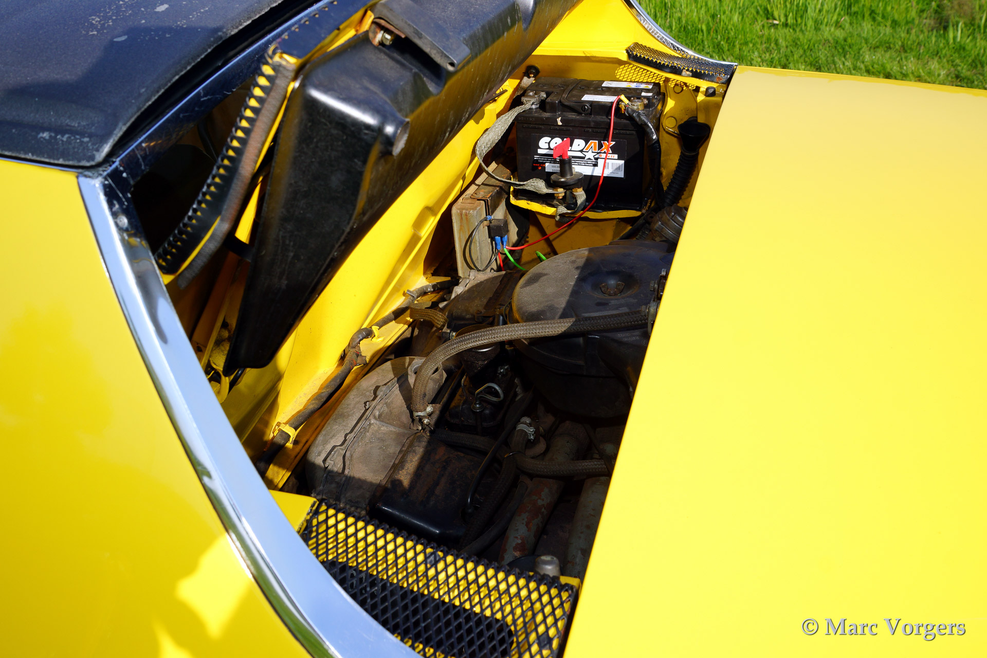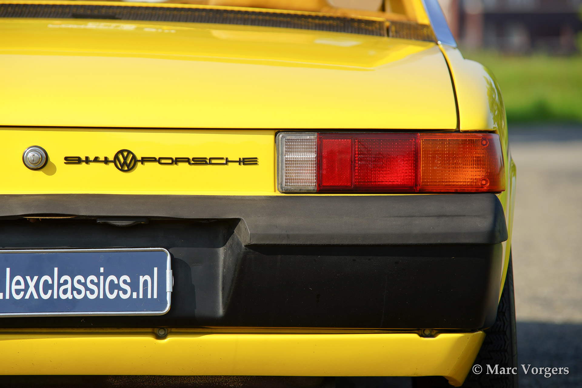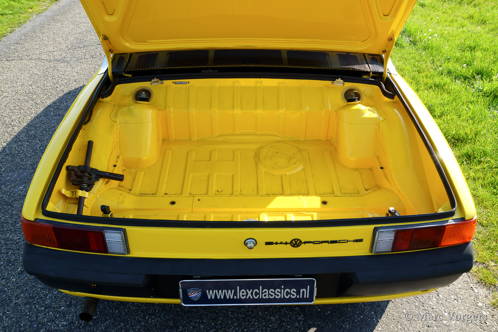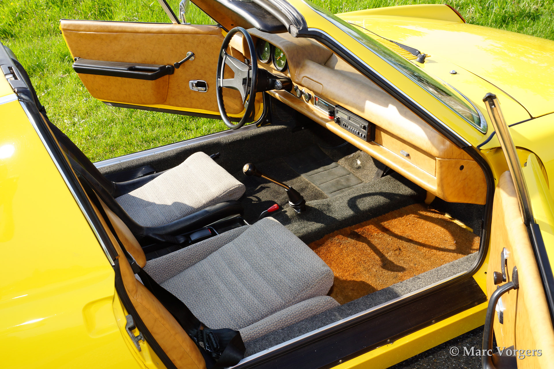 VW-Porsche 914 1.7L, bouwjaar 1970. Kleur geel met een beige/zwart/grijs interieur. Deze VW-Porsche 914 werd uitvoerig gerestaureerd. Het originele zwarte interieur werd door de eigenaar verfraaid met beige kunstlederen bekleding op het dashboard en op de deurpanelen - niet origineel dus. Een bijzonder kenmerk van de 914 is het afneembare dakpaneel dat opgeborgen kan worden in de achterste bagageruimte. Voor bagage is er dan nog genoeg ruimte in de voorste kofferbak! Deze VW-Porsche 914 is voorzien van lichtmetalen wielen, mostlampen en van een autoradio.