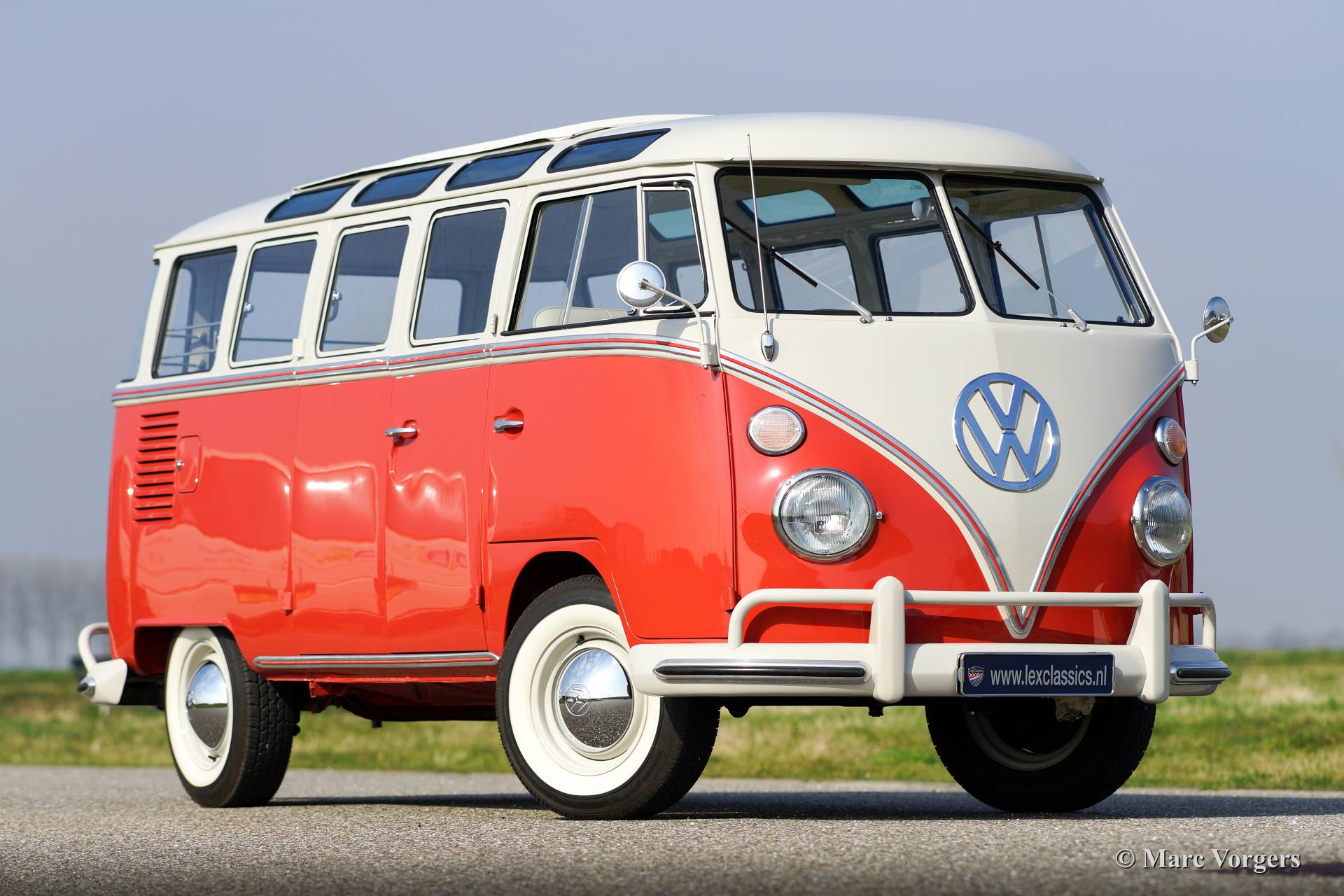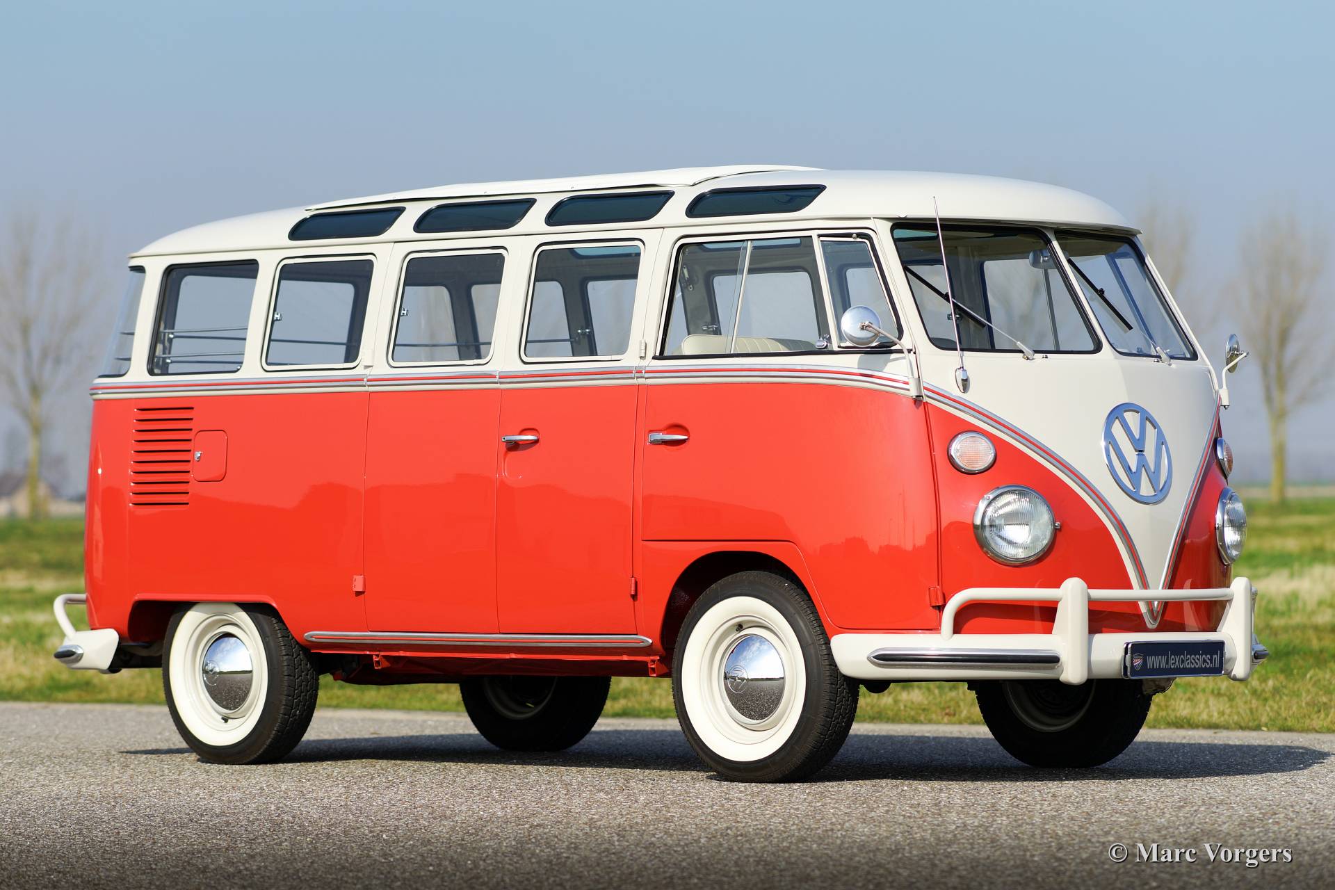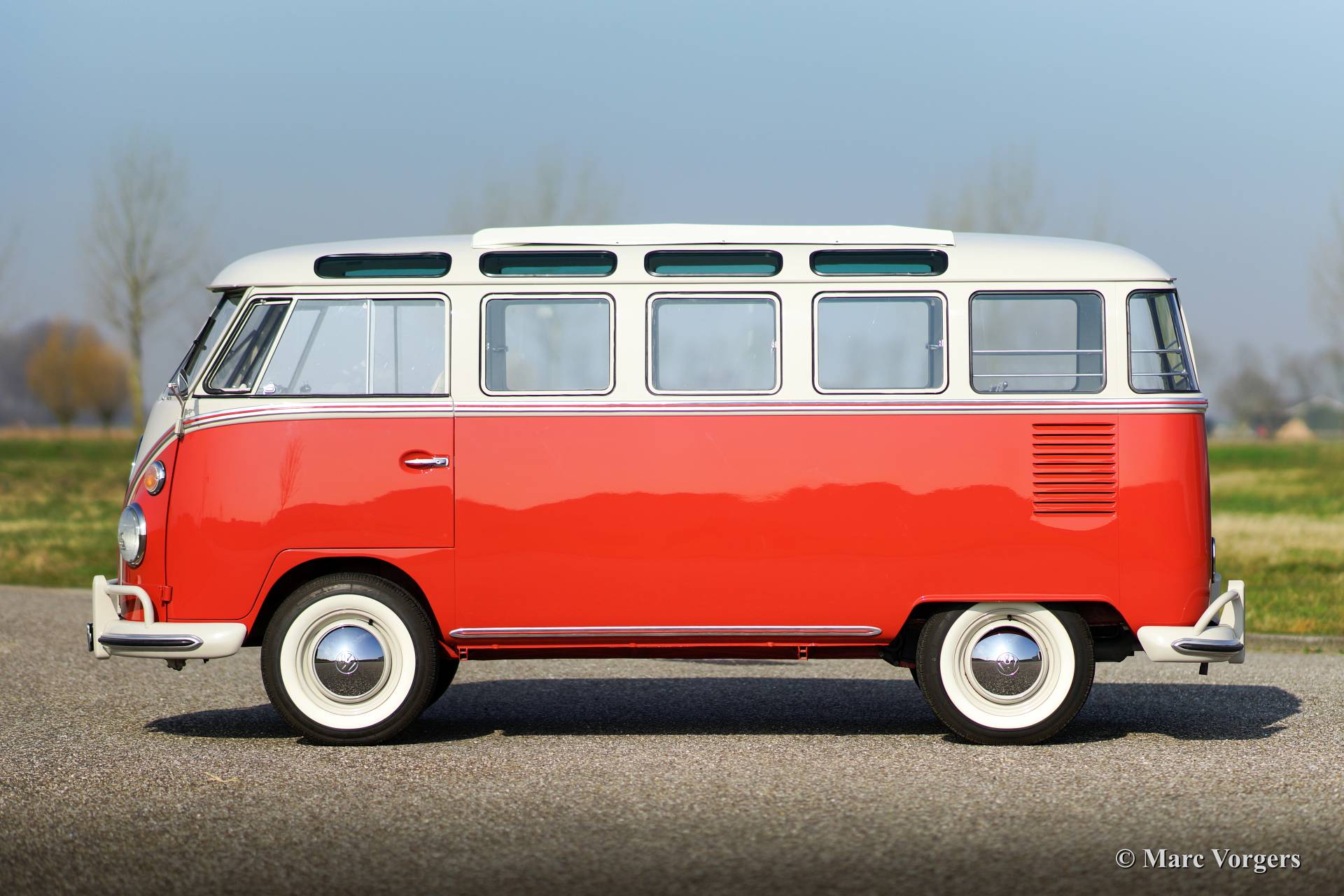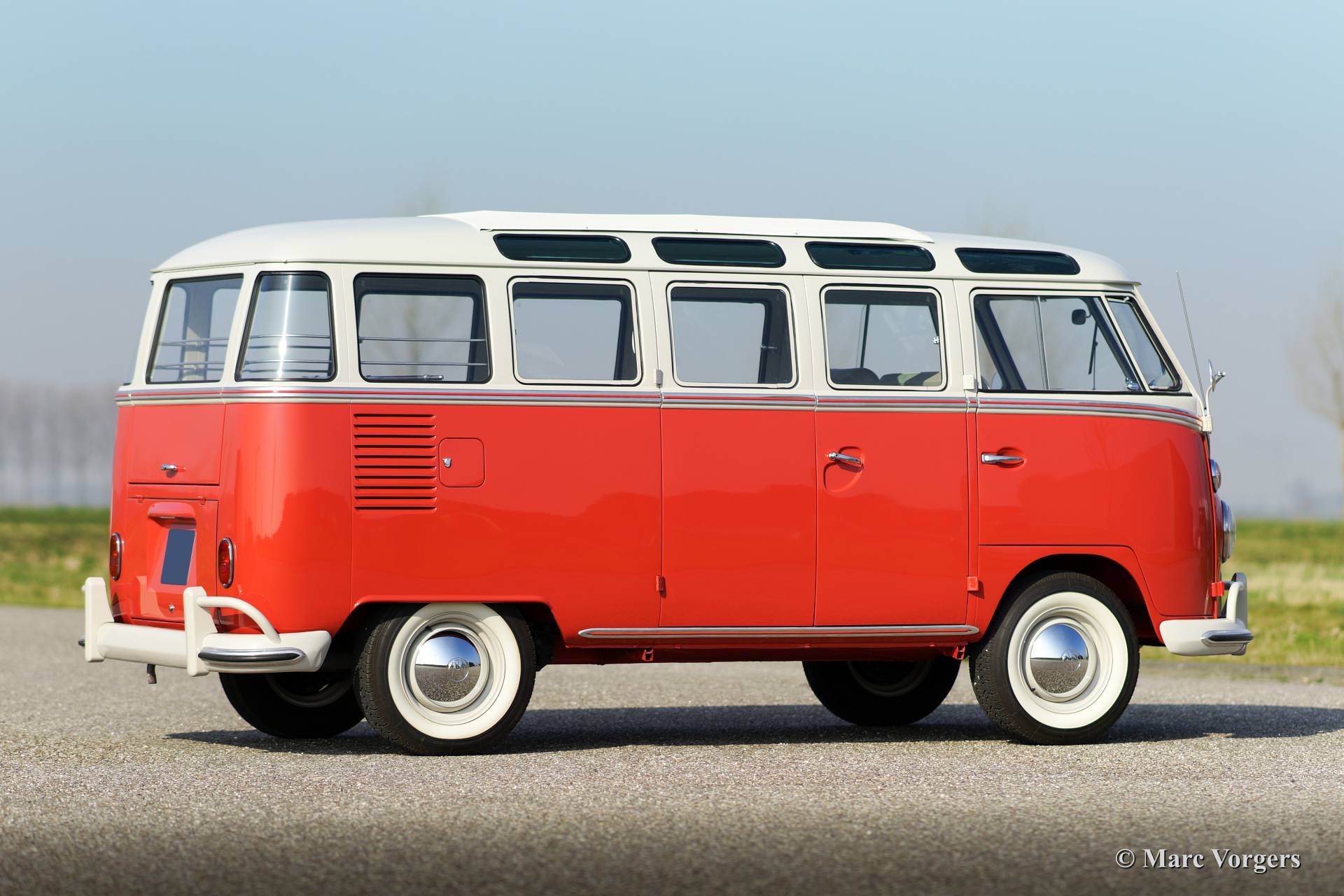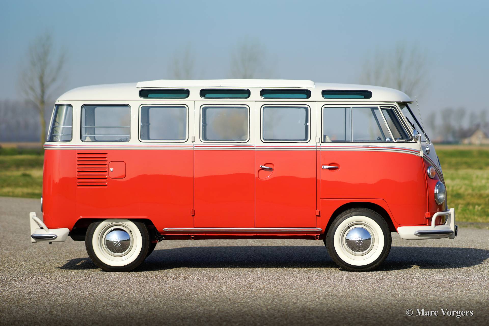 Volkswagen T1 Samba bus, bouwjaar 1963. Chassisnummer 1082XXX. Kleur ‘Sealing Wax Red’ met een ‘pearl white’ dak en een ‘basalt grey’ interieur. Deze Volkswagen bus van het T1 type Samba is een gewilde uitvoering met 23 ruiten en de tweedelige voorruit. Het betreft een ‘deluxe’ uitvoering met een prachtig groot vouw/schuifdak! Deze Volkswagen Samba bus werd in 2008 geïmporteerd vanuit de USA. Aansluitend werd de auto uitvoerig gerestaureerd waarbij kosten noch moeite werden gespaard. De restauratie was gereed in het jaar 2013, sindsdien is er slechts 114 km. Met de auto gereden. Deze Samba bus met 23 ruiten verkeert in sublieme topstaat, concours!