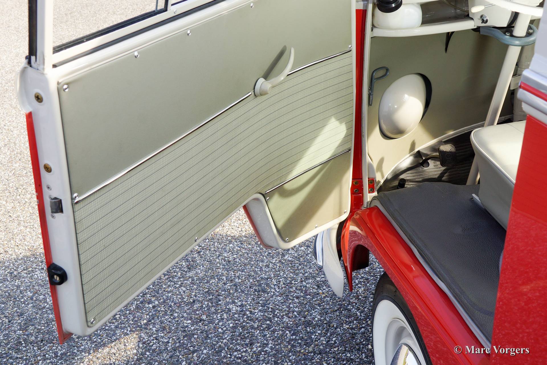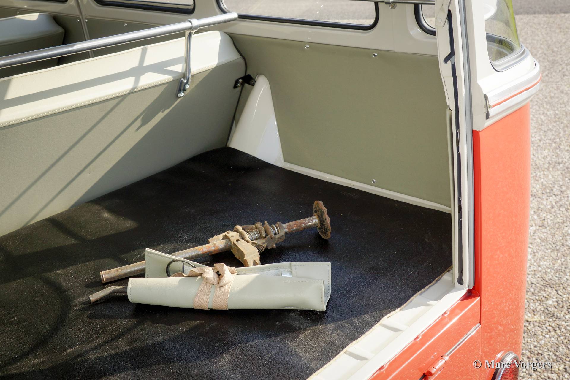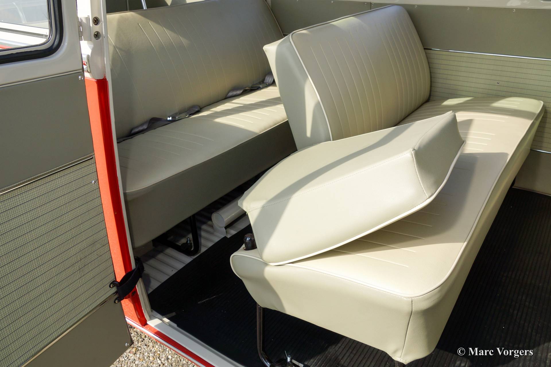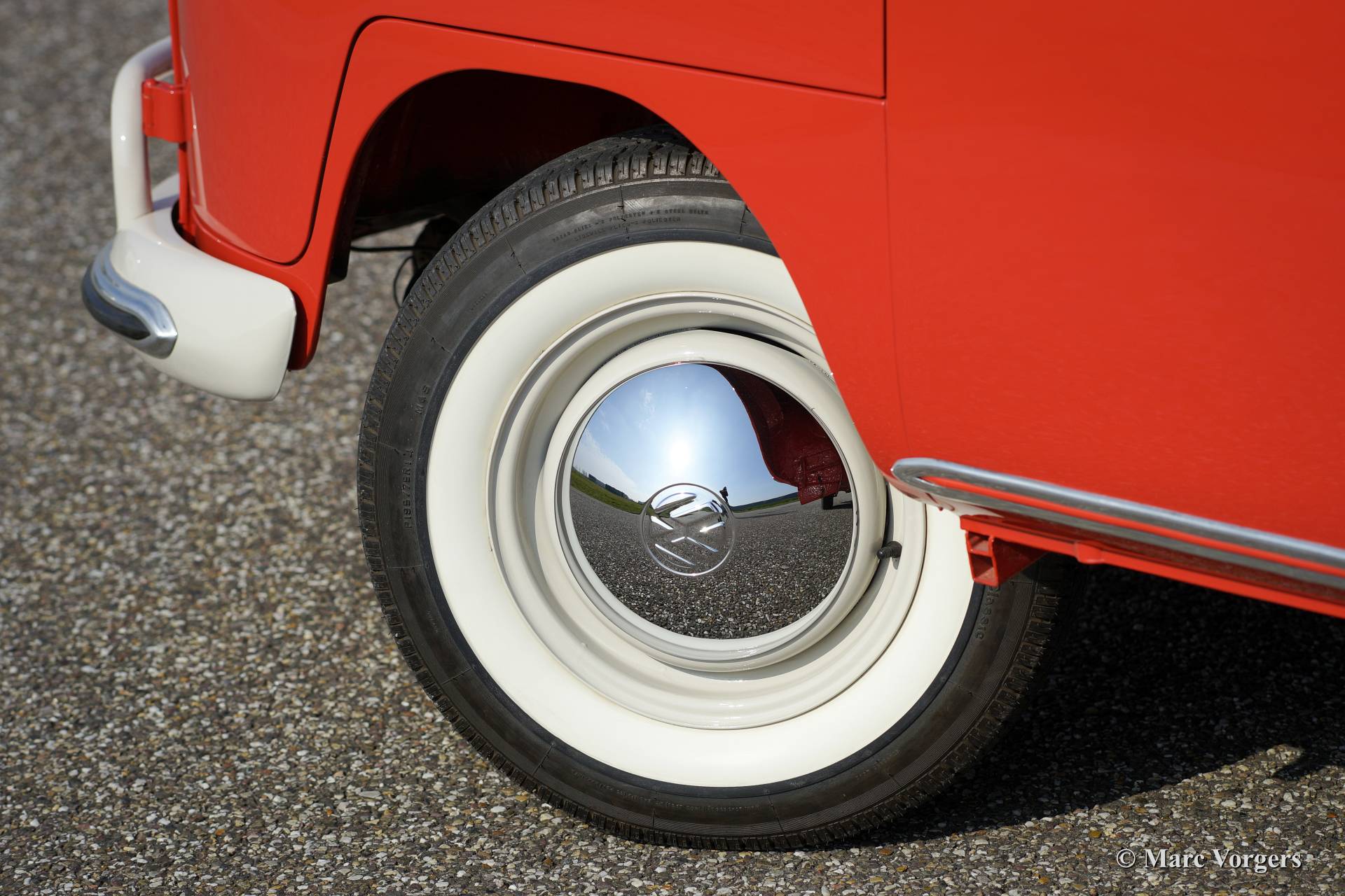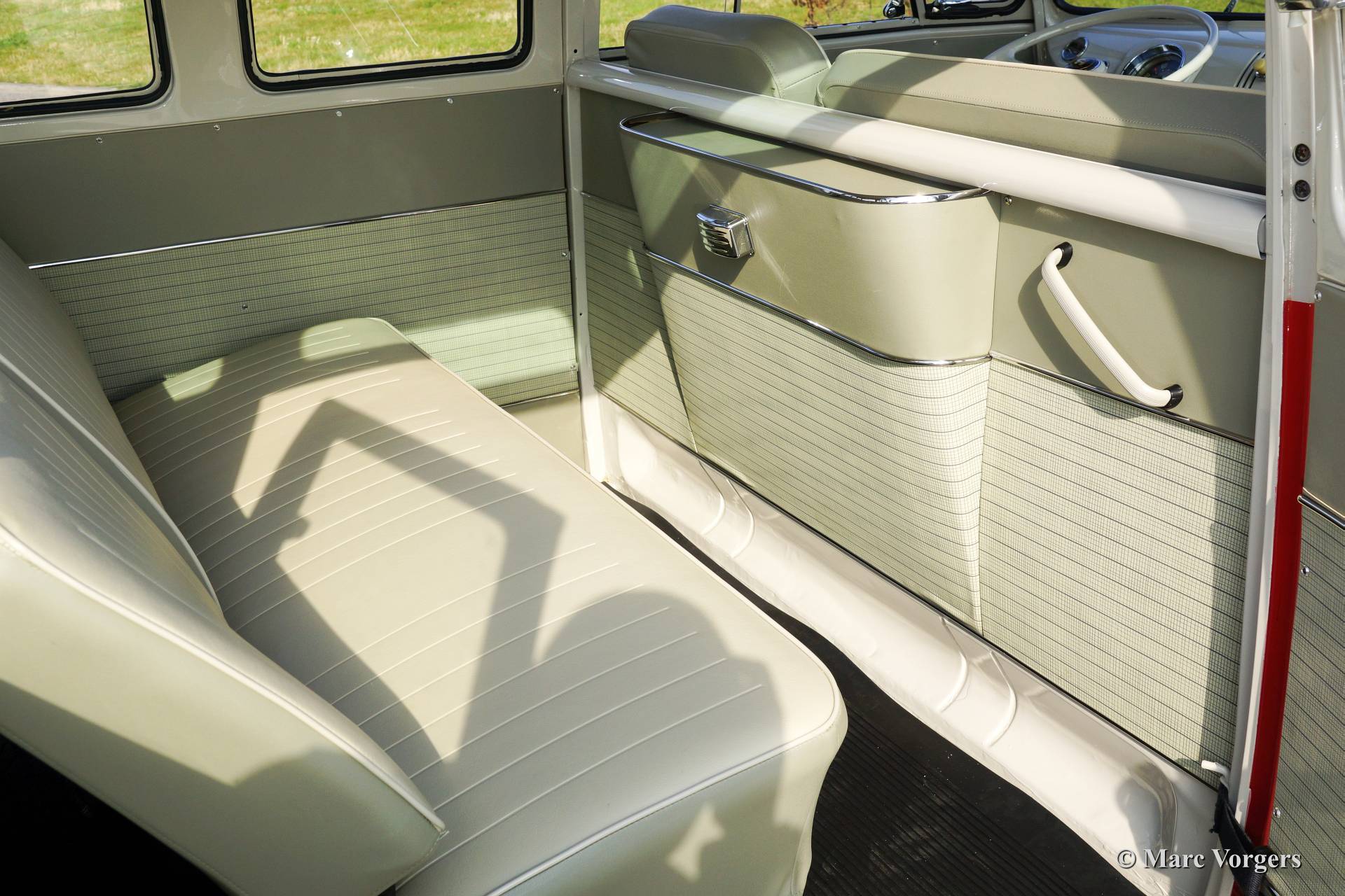 Volkswagen T1 Samba bus, bouwjaar 1963. Chassisnummer 1082XXX. Kleur ‘Sealing Wax Red’ met een ‘pearl white’ dak en een ‘basalt grey’ interieur. Deze Volkswagen bus van het T1 type Samba is een gewilde uitvoering met 23 ruiten en de tweedelige voorruit. Het betreft een ‘deluxe’ uitvoering met een prachtig groot vouw/schuifdak! Deze Volkswagen Samba bus werd in 2008 geïmporteerd vanuit de USA. Aansluitend werd de auto uitvoerig gerestaureerd waarbij kosten noch moeite werden gespaard. De restauratie was gereed in het jaar 2013, sindsdien is er slechts 114 km. Met de auto gereden. Deze Samba bus met 23 ruiten verkeert in sublieme topstaat, concours!