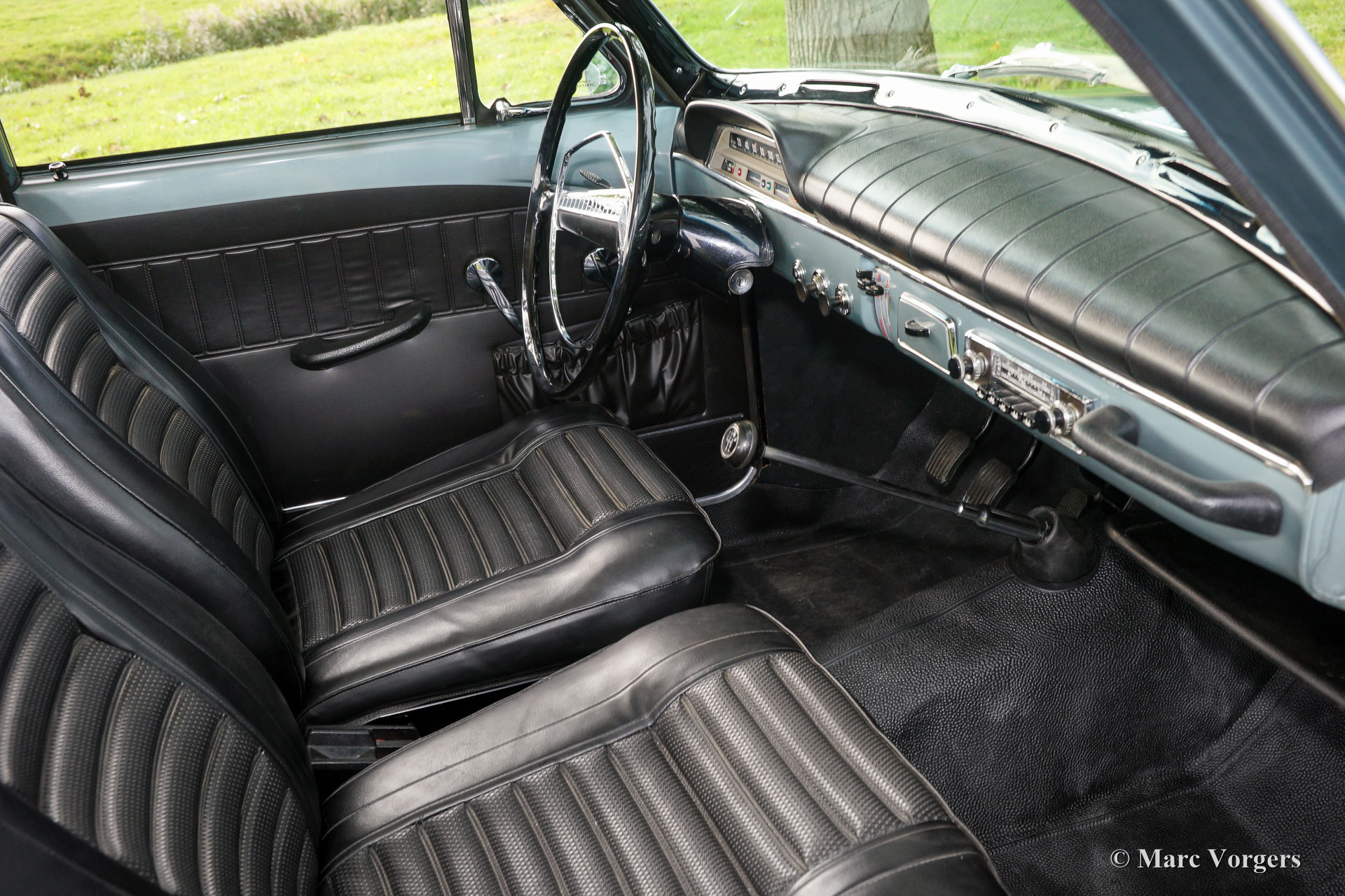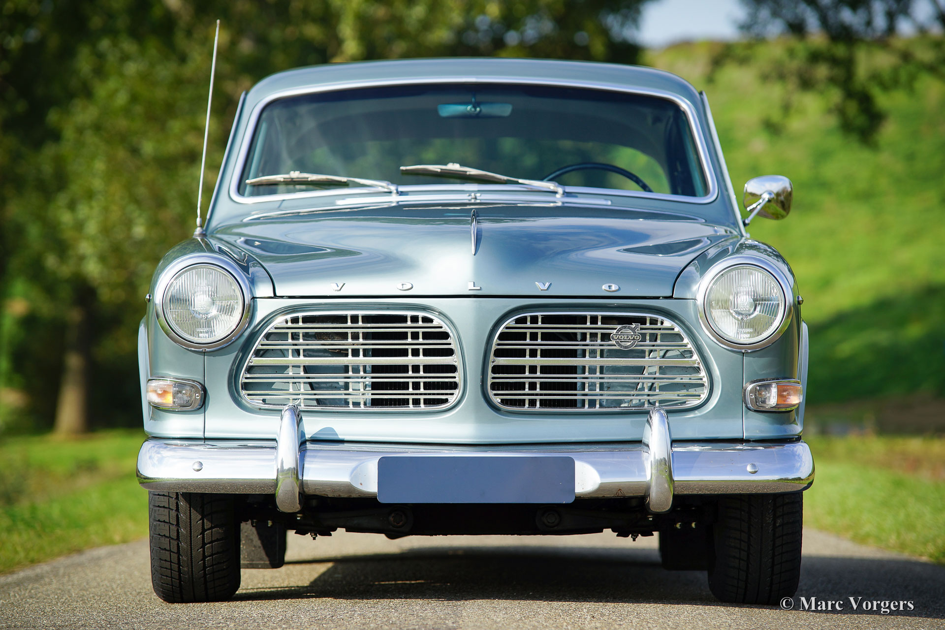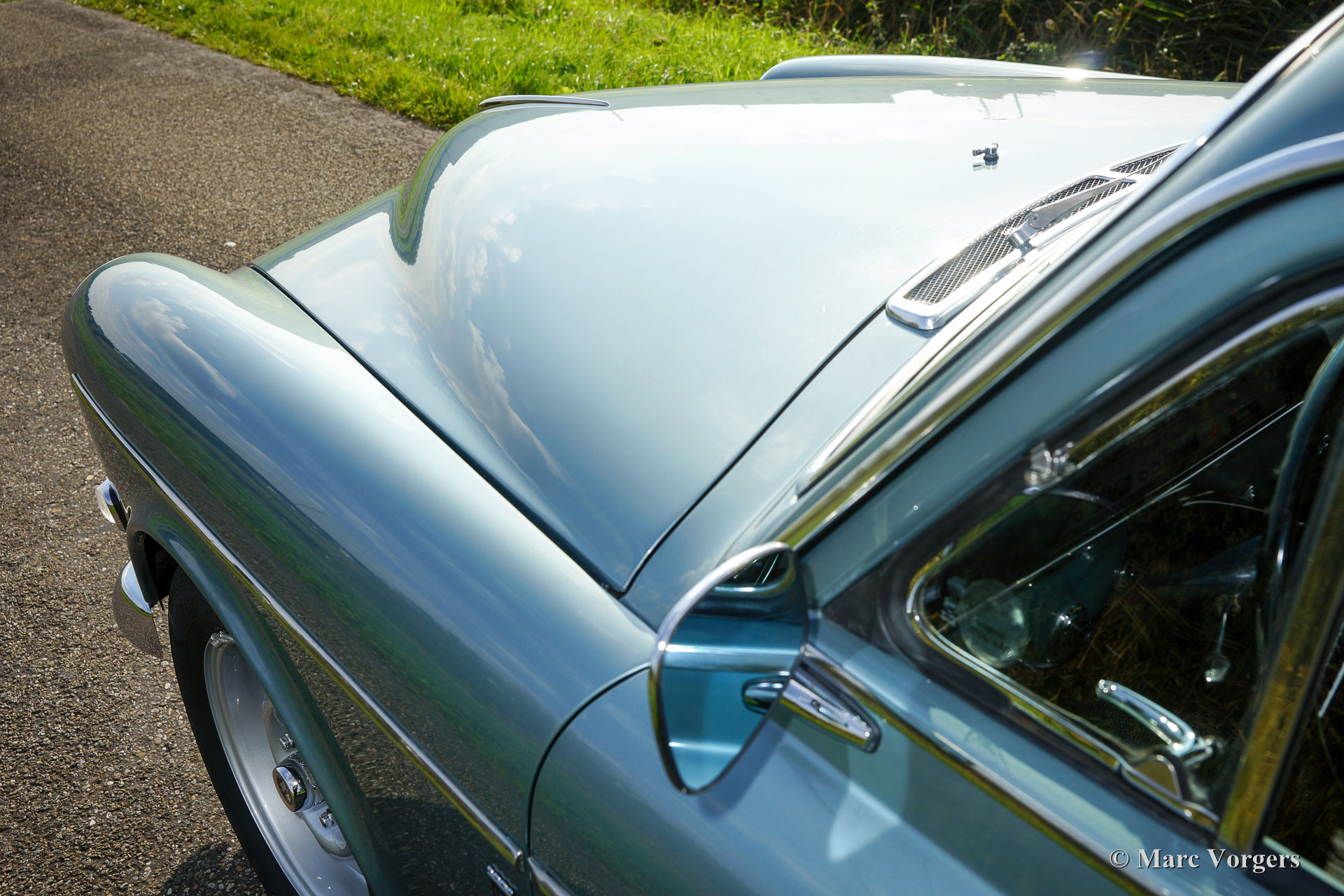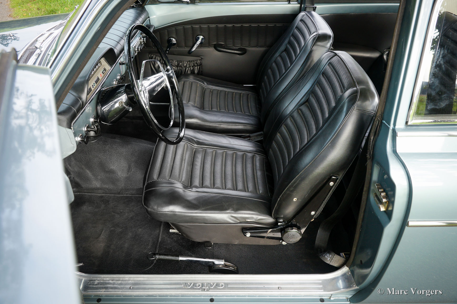 Volvo 121 ‘Amazon’, bouwjaar 1966. Kleur licht blauw / grijs metallic (kleurcode 53 / 102) met een zwart kunstlederen interieur en zwart rubber vloerbedekking. Deze Volvo 121 is een zeldzame uitvoering in deze originele kleur 53 / 102. Zweedse Volvo dealers konden in 1966 Volvo 121 en 123 GT modellen in deze nieuwe kleur bestellen om de reactie van het publiek te testen. Uit fabrieksinformatie blijkt dat er hoogstwaarschijnlijk 6 Volvo 121 en 50 Volvo 123 GT ‘Amazon’ modellen in deze toen experimentele kleur werden geleverd. De kleur werd nog niet overgenomen op de ‘Amazon’ productiemodellen maar werd vanaf 1968 toegepast op de Volvo 1800E, de 140 en de 164 serie.