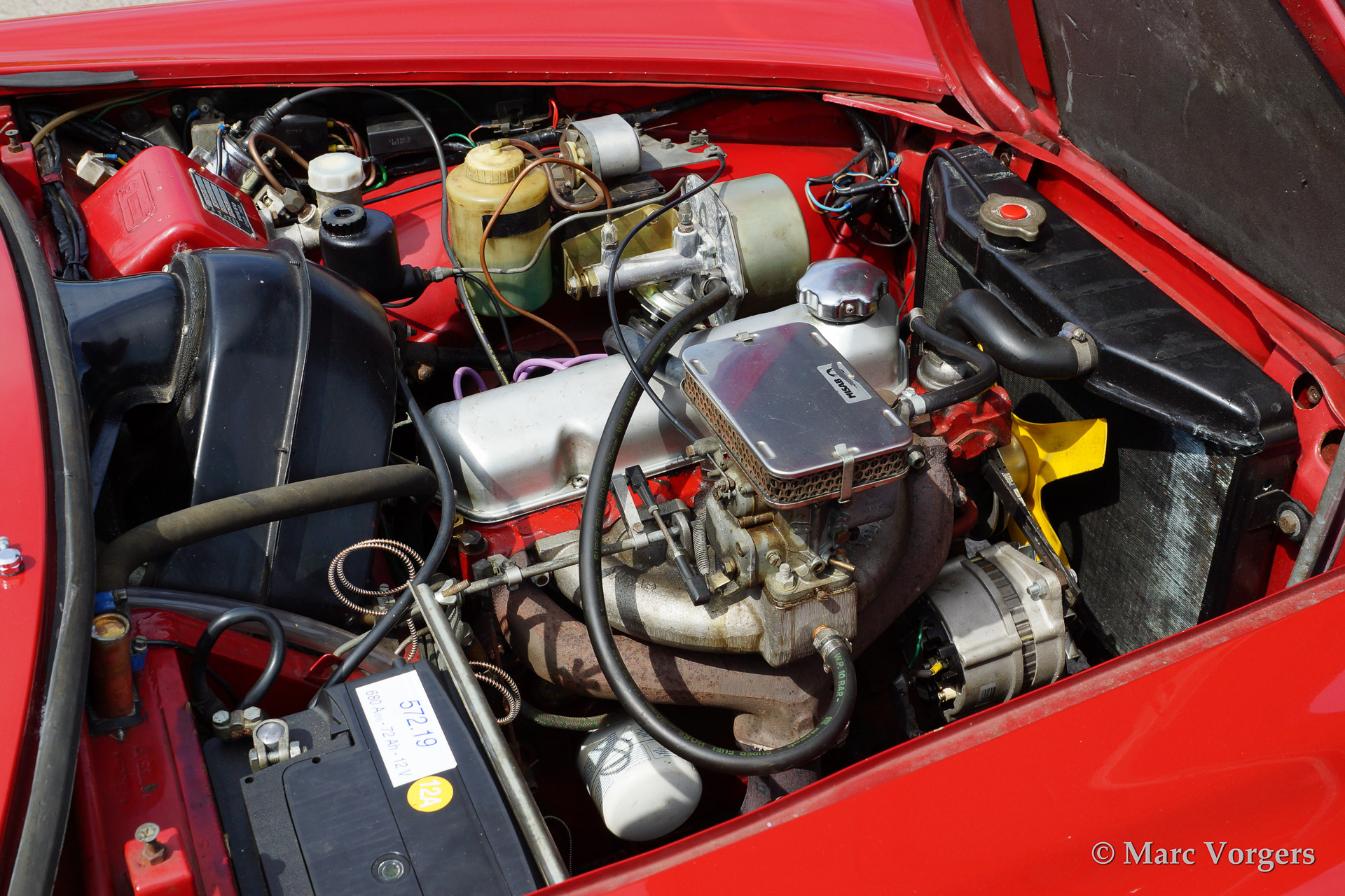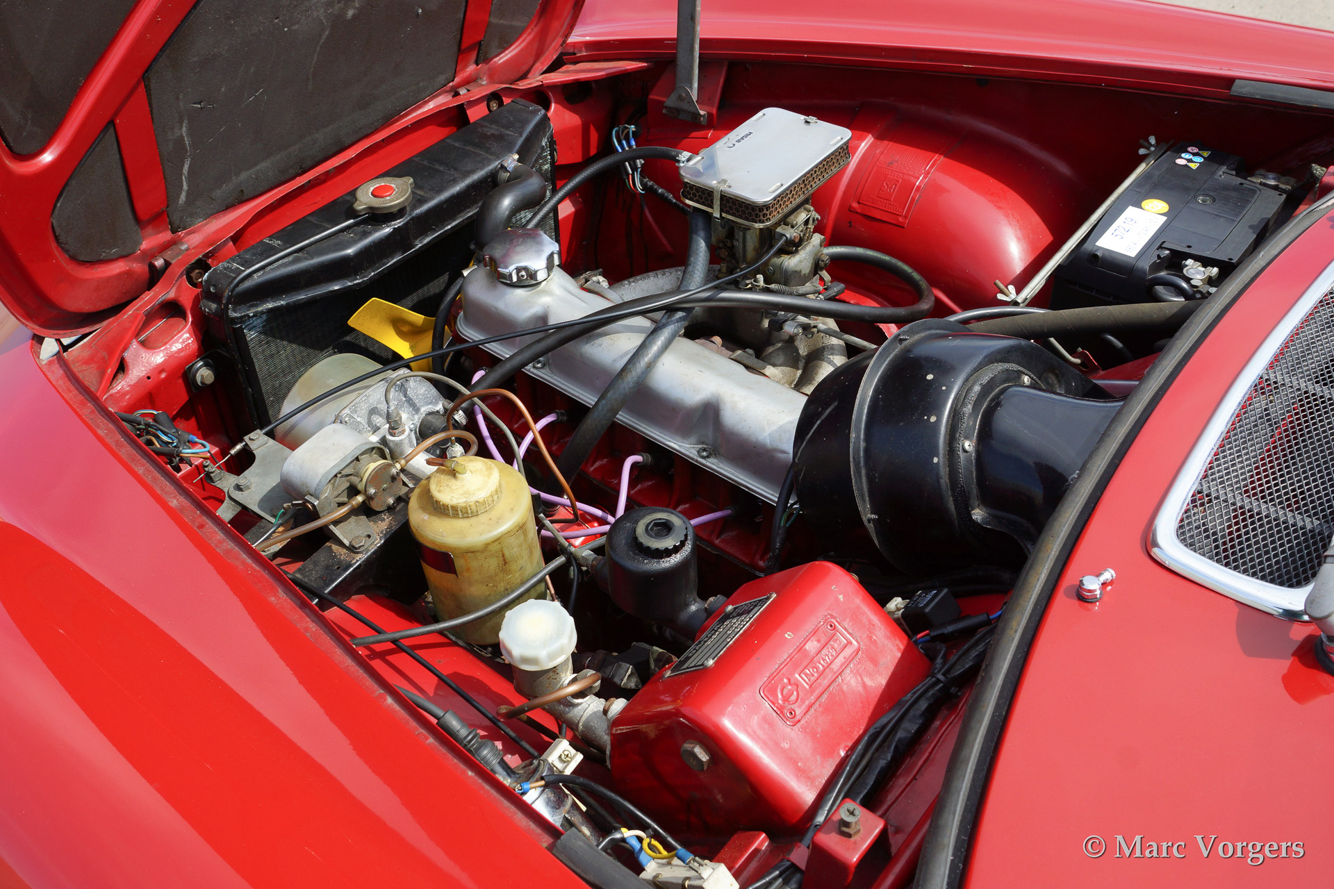 Volvo 1800 S, bouwjaar 1966. Kleur rood met een zwart lederen interieur en antraciet tapijt. Deze fraaie 1800 S is voorzien van Minilite stijl lichtmetalen wielen en overdrive.