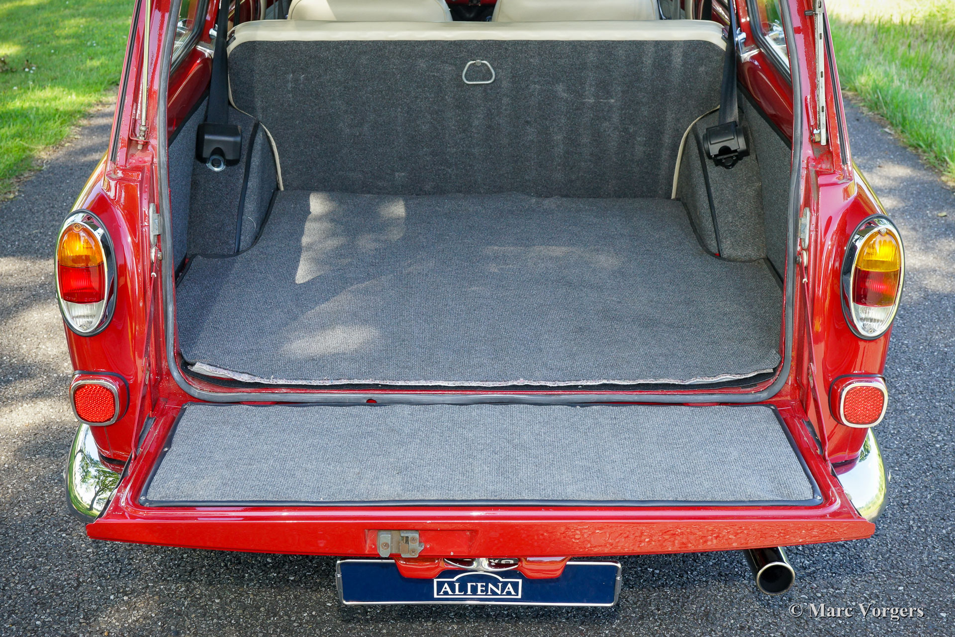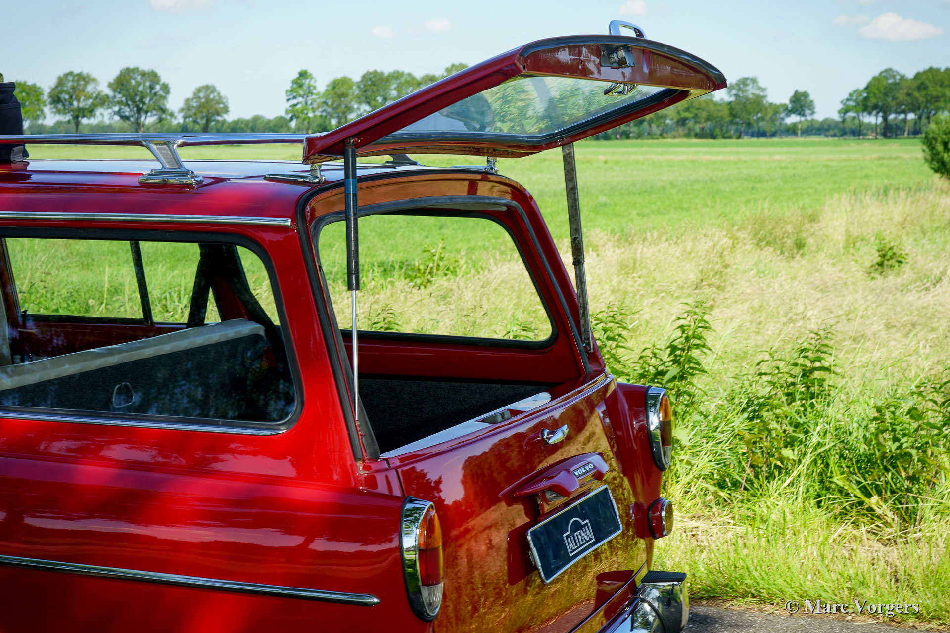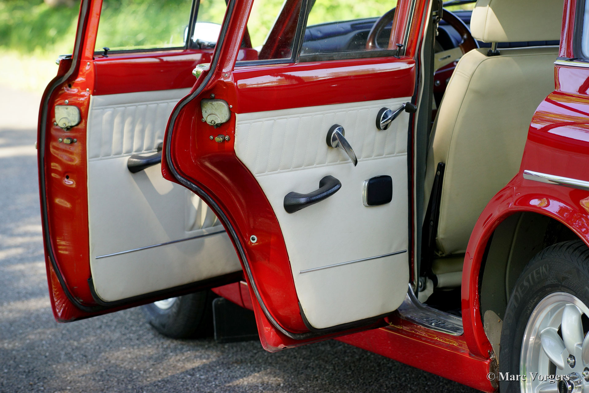 Volvo 221 'Amazon' stationwagen, jaar 1967. Chassisnummer 2224410507XX. Kleur rood met een beige leren interieur en zwart tapijt. Deze prachtige Volvo 221 stationwagen/ kombi werd in 1996 in Nederland geïmporteerd. Ongeveer vijf jaar geleden werd de auto uitgebreid gerestaureerd en gereviseerd naar topstaat! Alles werd gerestaureerd en gereviseerd; de carrosserie, het interieur en de mechanische componenten. De carrosserie toont een zeer fraaie paneelpassing, prachtige lak en sublieme chroom. Het interieur is gloednieuw gestoffeerd en met beige leer bekleed. De motorruimte is brandschoon en fraai gedetailleerd. Deze Volvo 221 'Amazon' verkeert in sublieme TOP-staat; concours! Het zal moeilijk zijn om een ander exemplaar in deze topconditie te vinden. De auto is voorzien van overdrive, een originele verchroomde dakdrager, een trekhaak en lichtmetalen wielen in Minilite stijl. Dit is een zeer gezochte Volvo 221 'Amazon' stationwagen!