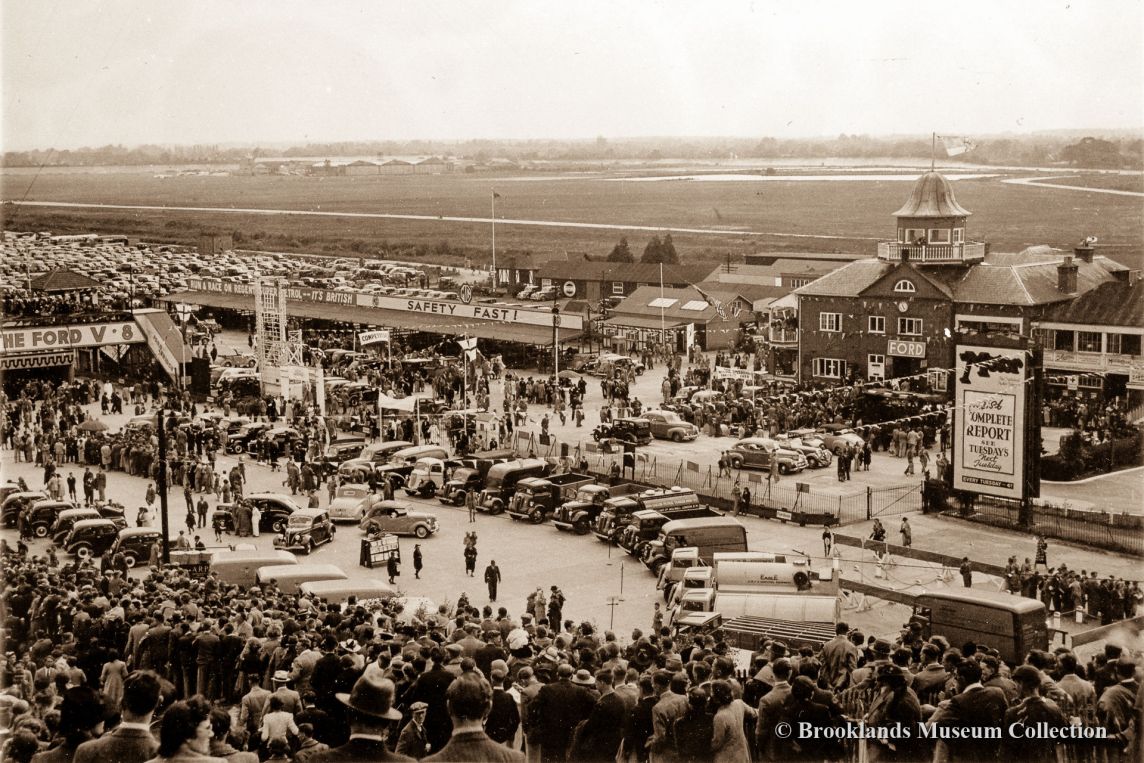 87 Brooklands track overview during the Ford day in June 1939. Ford presented all their new cars at the track with stunts and other dare devil driving!