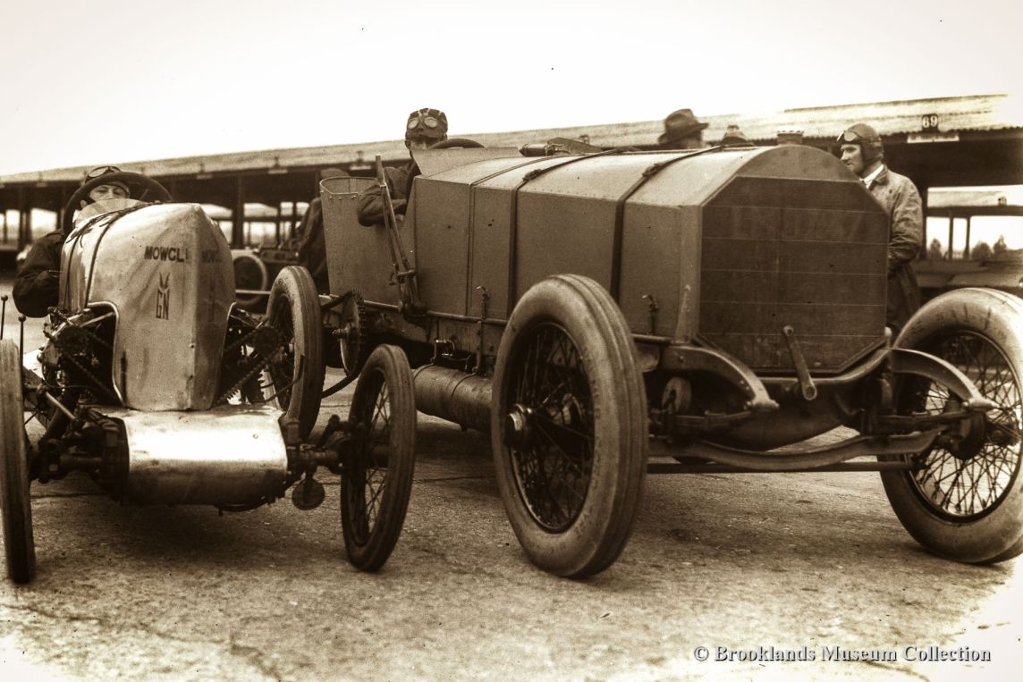 21 Enter Chitty Bang Bang! The biggest and the smallest cars on the Brooklands track in 1921. A. Frazer-Nash in Mowgli (left) and Louis Zborowski in his home build special Chitty Bang Bang. Extended 1914 Mercedes chassis with 300 bhp. 24 Litre Maybach engine as used in the WW1 German Gotha bombers. Chitty still with 'hush hush' four seater body by Bligh Brothers of Canterbury to deceive the Brooklands handicappers.