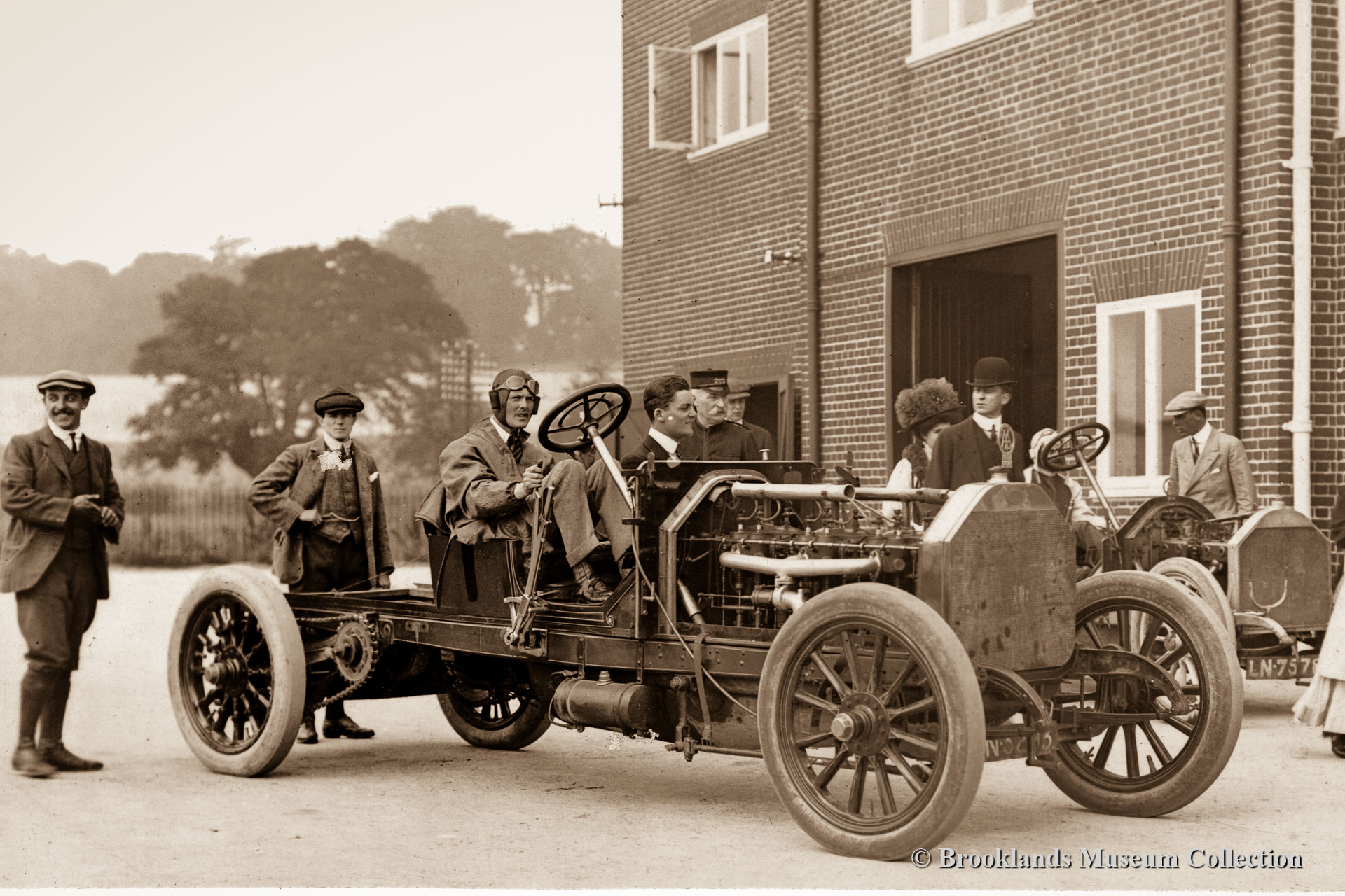 22 Brooklands Giant Chitty 1 with Zborowski at the wheel in front of the clubhouse.