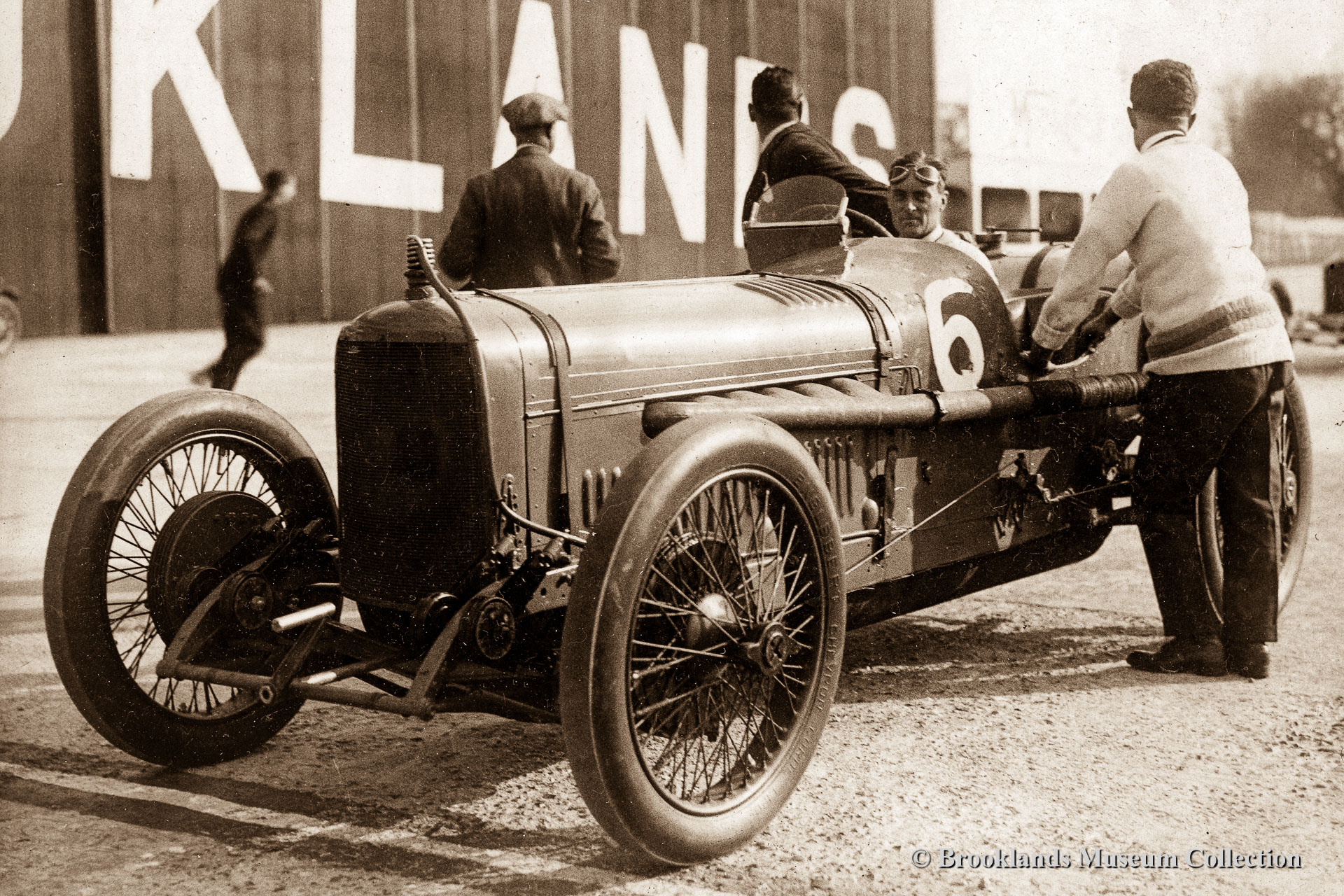 27 6 cylinder 4 Litre Sunbeam with Campbell in front of the Vickers aircraft factory flanking the 'fork' of Brooklands track