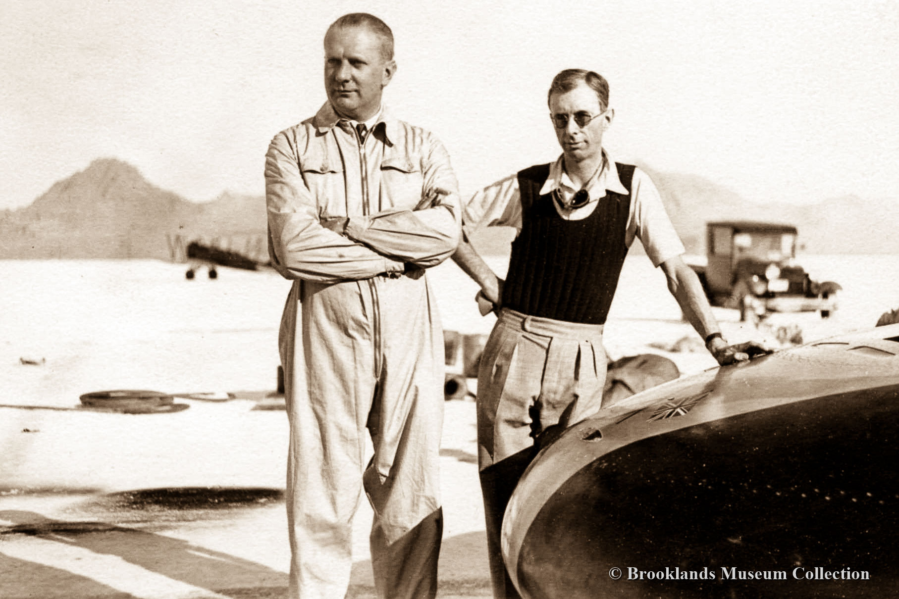77 Building John Cobb's Land Speed Record breaker, the very innovative twin engine Railton-Special at Thomson & Taylor Brooklands, 1937. John Cobb discusses matters with Ken Taylor