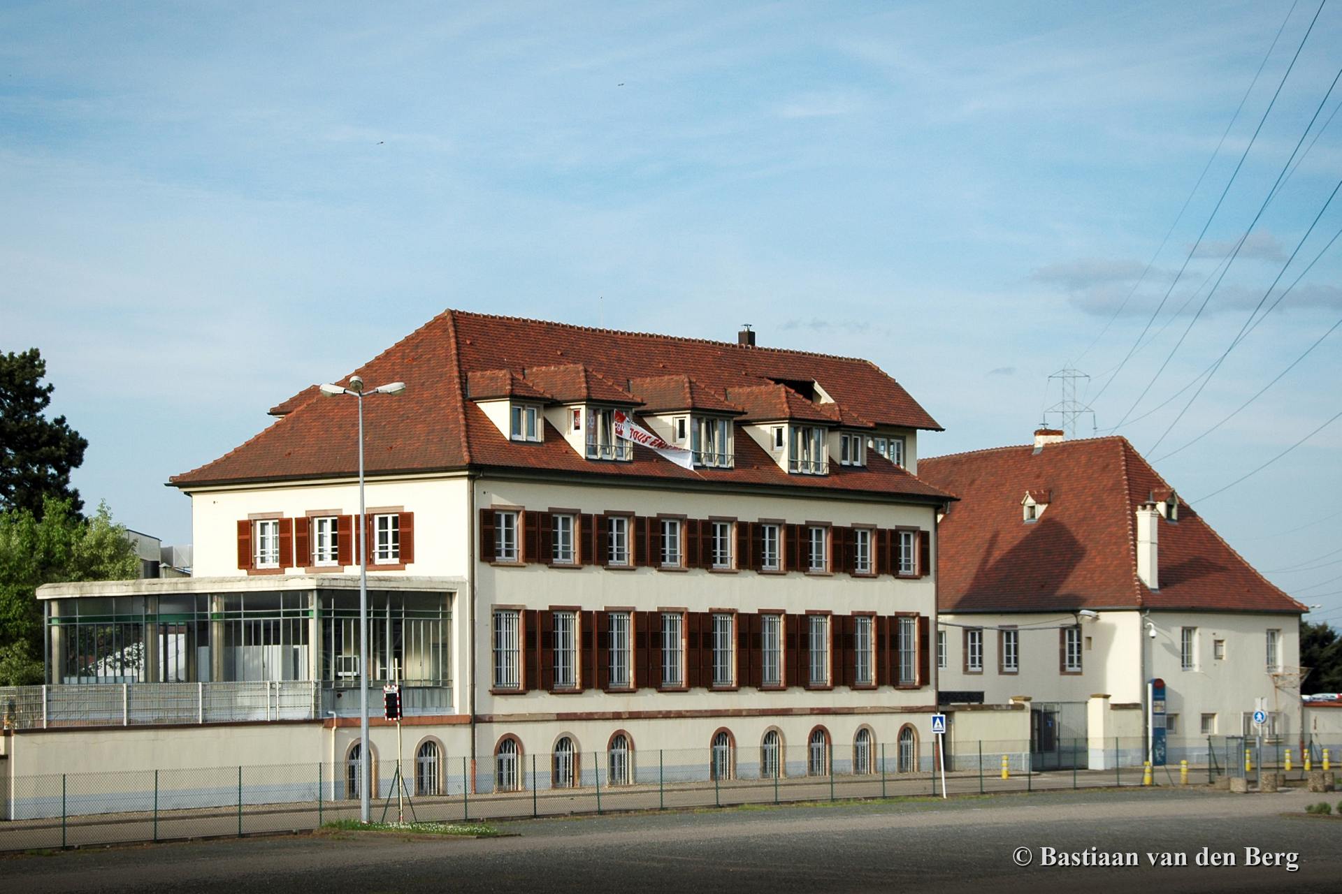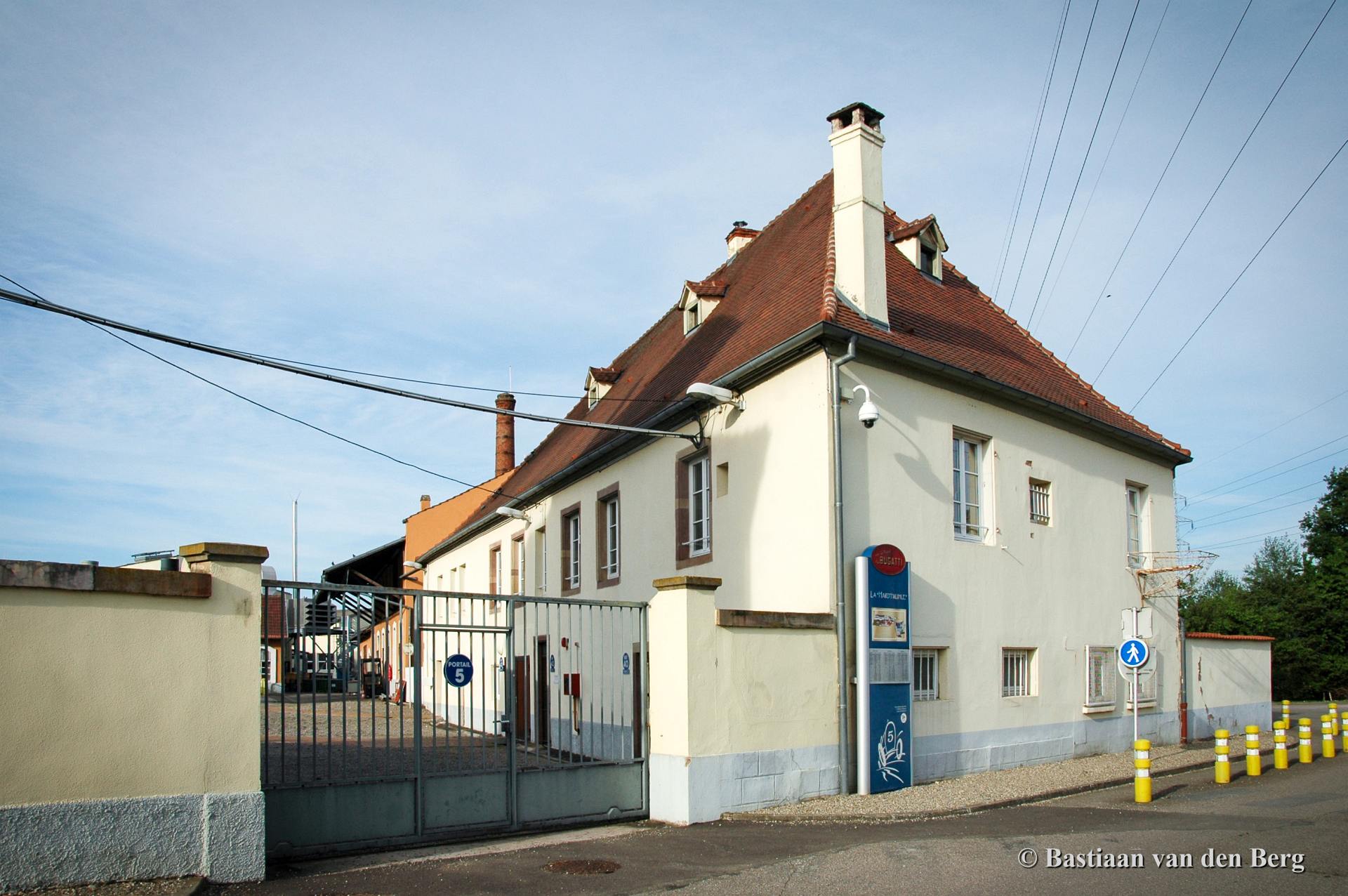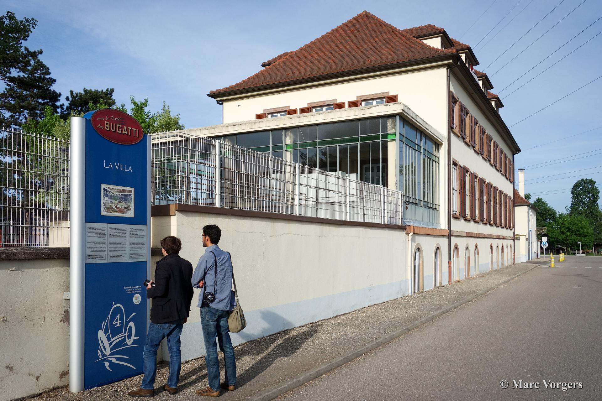 Van daaruit vervolgen wij in het late middaglicht de ontdekkingstocht te voet. Eerst treffen we in een perk op weg naar de oude fabriek een Bugatti ‘Autorail bogie’, een vier-assig onderstel van de befaamde en snelheidsrecords brekende Bugatti trein aan. De oude Bugatti fabriek (l’usine) is tegenwoordig eigendom van de firma SAFRAN ‘Messier-Bugatti-Dowty’ die er landingsgestellen voor vliegtuigen fabriceert. Het modernere voorste gedeelte van het complex werd vroeger gebruikt voor de bouw van de Bugatti ‘Autorail’ treinstellen. Deze Bugatti ‘Autorail’ treinstellen werden aangedreven door twee of vier Bugatti Royale motoren die een gecombineerd vermogen gaven van 400 en 800 pk en een topsnelheid van 196 km/u.. Een eindje verder, om de hoek in de Rue des Peupliers, staat de ‘Villa’, het enorme huis waar Ettore jarenlang gewoond en gewerkt heeft. Naast en achter de ‘Villa’ vinden we het oude gedeelte van de Bugatti fabriek. Dit gedeelte heet de ‘Hardtmühle’ en hier krijgen we een uitstekende indruk van hoe het er in de jaren 1920 uit gezien moet hebben. De oude ateliers, werkplaatsen, gieterij en de stallen staan nog trots overeind maar zijn helaas niet toegankelijk. Terug naar de hoofdweg, rue Saint-Jean, wandelen we bewonderend langs Chateau Saint-Jean. Dit prachtige ‘chateau’ werd in de late Jaren 1920 door Ettore Bugatti aangekocht om meer ‘grandeur’ aan het merk Bugatti te geven. Er vonden vele Bugatti introducties plaats en fotosessies maar Ettore heeft er nooit gewoond. Tegenwoordig is het ‘Chateau’ in eigendom van Bugatti SAS en men gebruikt het om kopers van de moderne Bugatti Veyron in stijl te ontvangen.