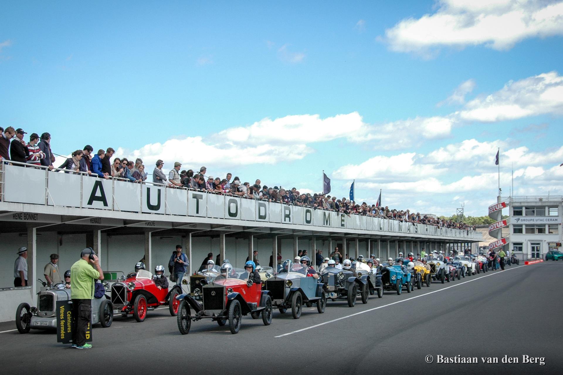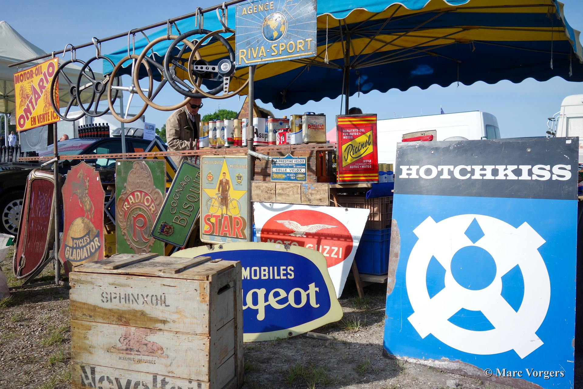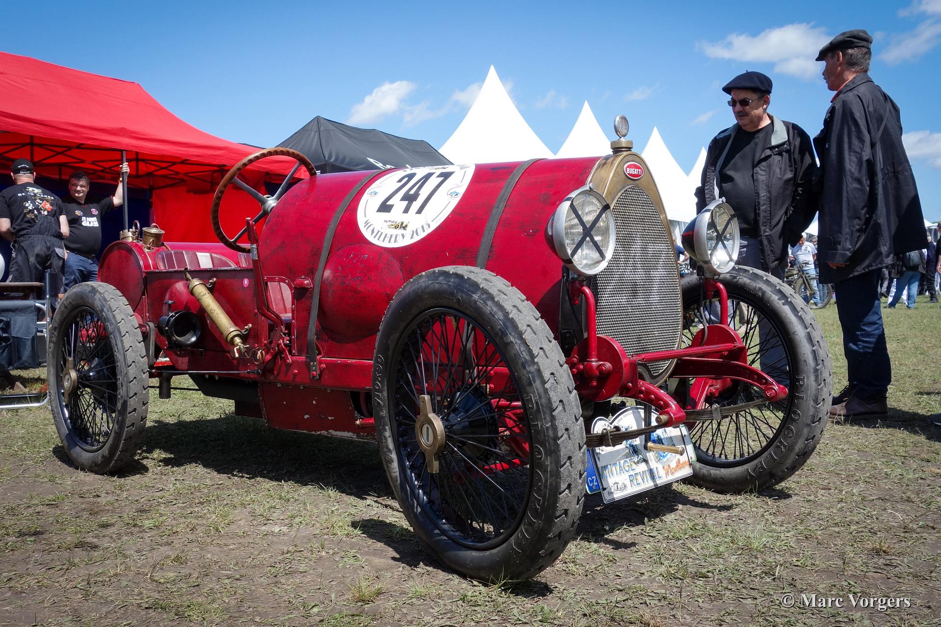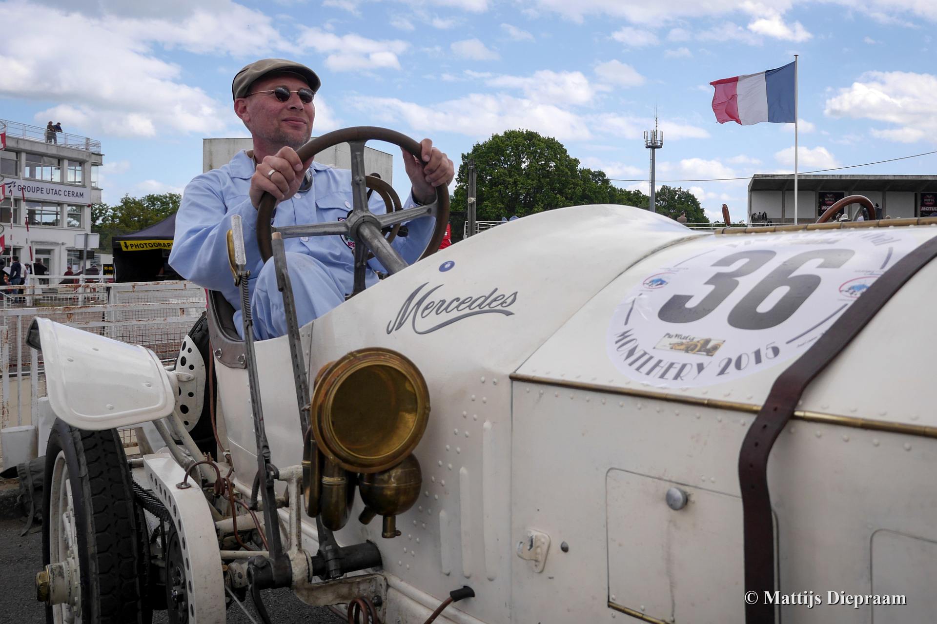 De derde dag van onze ontdekkingstocht reisden we bijna 600 kilometer naar Montlhery. We kozen voor de mooiste route langs Belfort en over de N19/E54 van Vesoul naar Langres. Hier vonden we een klein stukje Engeland in het dorpje Cintrey. Hier maakten we foto’s van onszelf met de Rover bij een oude garage met prachtige Castrol en Champion reclames op de muur! Vroeg in de middag arriveerden we op de historische kombaan van Montlhery. Op slag werd de klok van onze beleving tientallen jaren teruggedraaid naar de Jaren 1920 en 1930. Met een beetje inleving en het negeren van moderne veiligheidshelmen en mensen in te moderne kleding is de tijdreis compleet. Tijdens de Vintage Revival zagen we vele Bugatti’s die nog altijd intensief gereden worden, er wordt zelfs mee geracet en de auto’s worden zonder uitzondering gekoesterd door de eigenaren. Maar er was veel meer te zien, ook auto’s van andere merken maakten indruk. Ik heb me twee dagen verlekkerd aan een originele Grand Prix Mercedes uit 1908… Uiteindelijk mocht ik plaatsnemen in de auto waarmee Christian Lautenschlager in 1908 de Franse Grand Prix won in Dieppe.